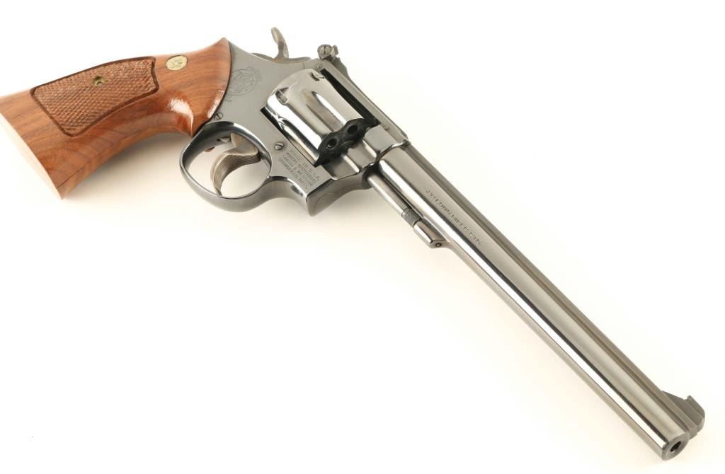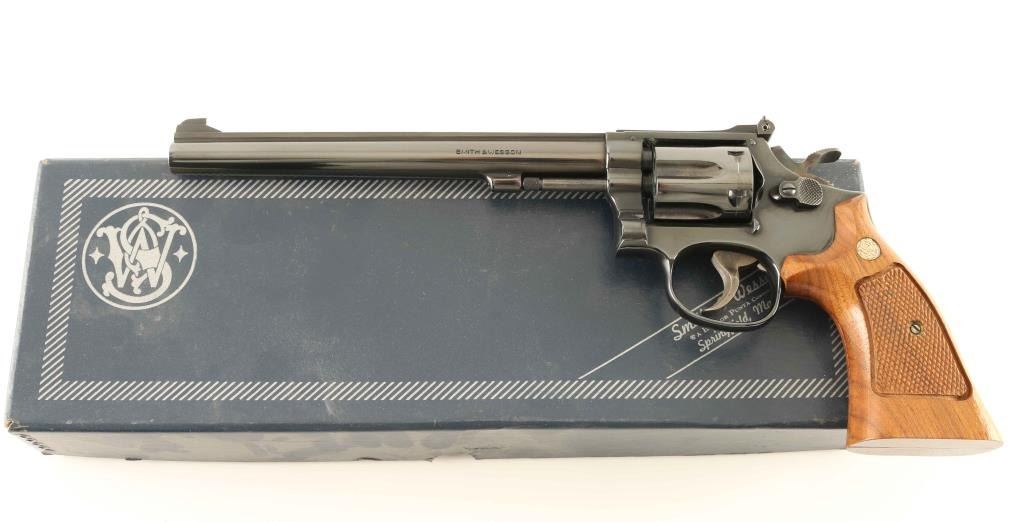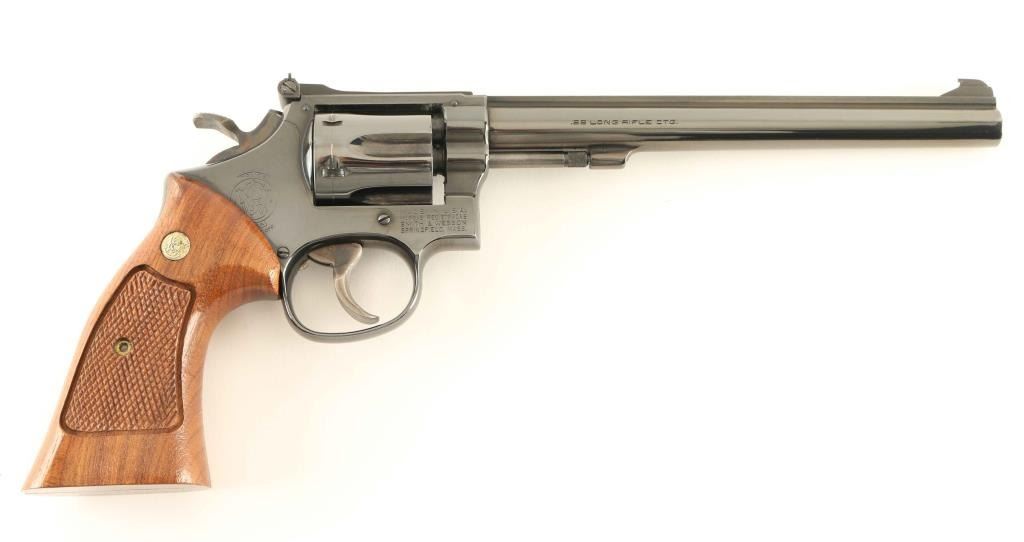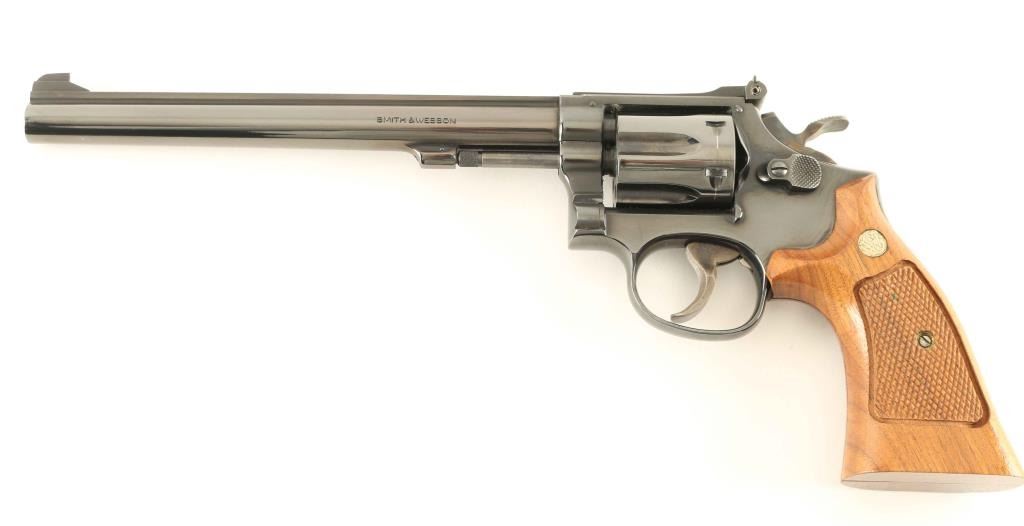 'The K-22 Masterpiece' Medium frame double action revolver chambered in .22 Long Rifle, manufactured circa 1977-1982. Features a blued finish, pinned 8 3/8" barrel with serrated sighting rib, raised patridge front sight(with the front edge painted white), adjustable micrometer click rear sight with white outline, fluted six-shot cylinder with counterbored chambers, non-shrouded ejector rod, .500" serrated target trigger, .500" target hammer, three screw square butt K target frame with ten groove grip straps, and two-piece checkered walnut target grips with silver Smith & Wesson medallions. Includes a factory two piece blue cardboard box with documents, parchment paper and an altered but non-matching label. Revolver exhibits approximately 97% of it's original blued finish showing a drag line on the cylinder, light muzzle wear and some light handling marks. Action is smooth with very good lock-up, the bore is pristine, and the wood grips are fine. Condition is NRA Excellent in box. ***Modern Firearm***