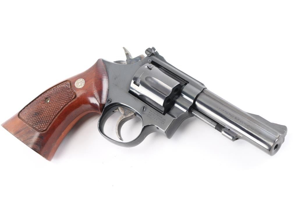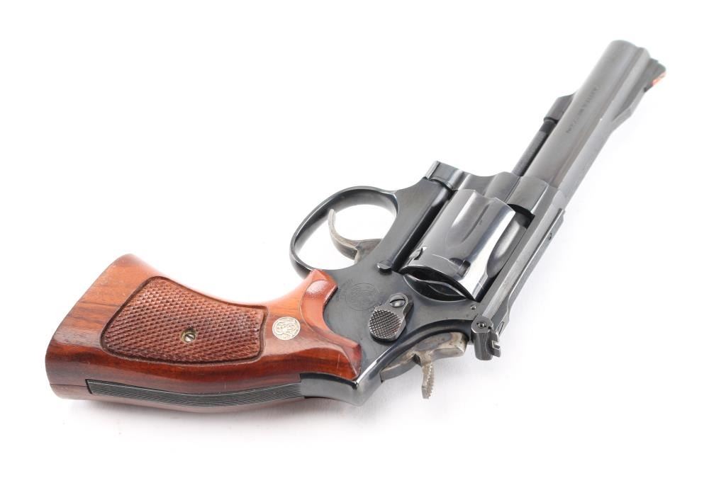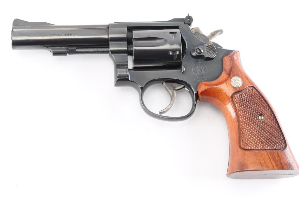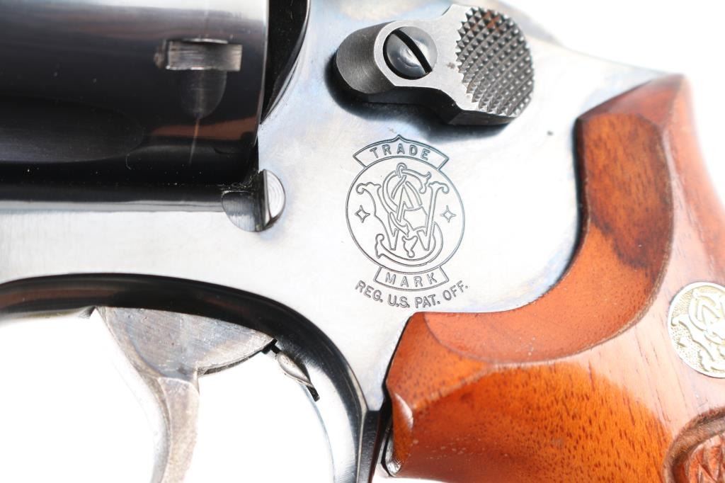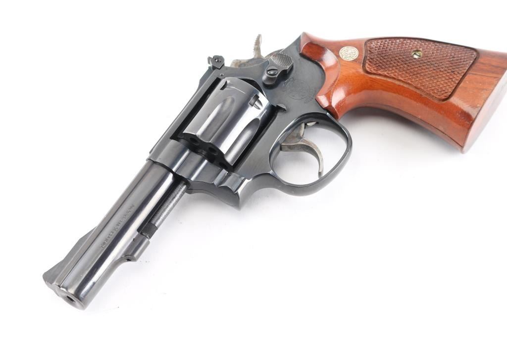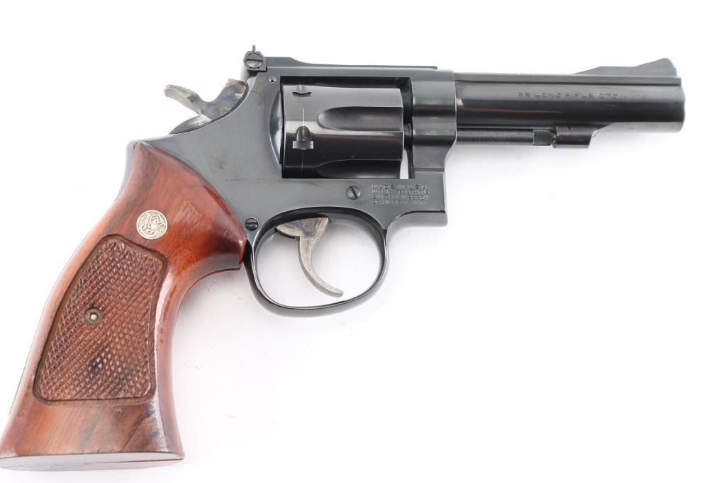 American made Double Action, 6 shot revolver chambered for .22LR ammunition. It features a 4" blued barrel, and frame with a serrated rib, raised blade front sight, adjustable rear sight, blued swing out fluted cylinder, smooth trigger, knurled hammer spur and checkered wood grips with S&W medallions. The trigger and hammer are color case hardened and retain their color. The metal finish is about 97% with feint tracking on the cylinder, and a few very small specks of pitting on the upper left frame and hammer, you have to look hard to see them. Grips look good. Bore is excellent/bright. Would be excellent if not for thr pitting.