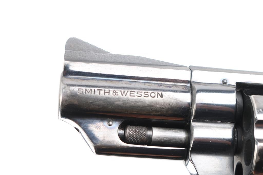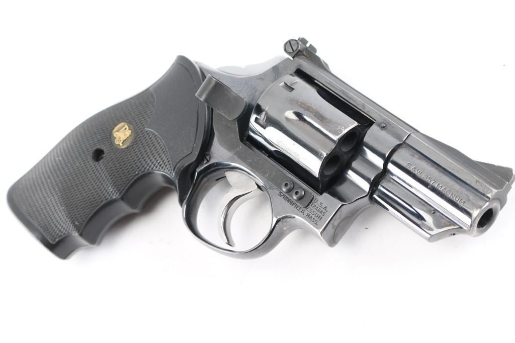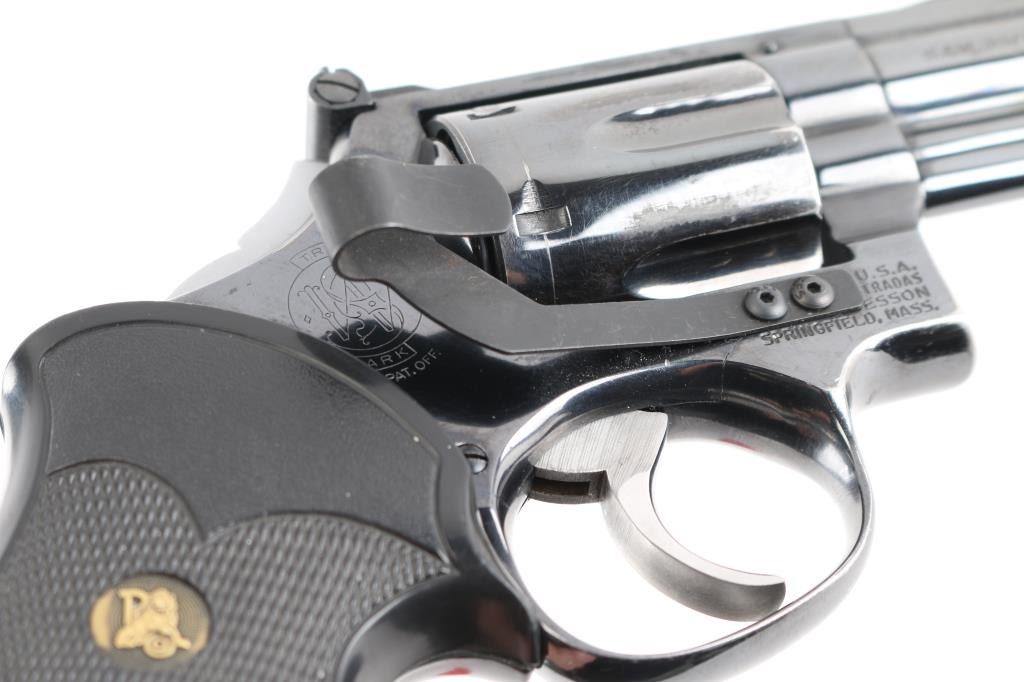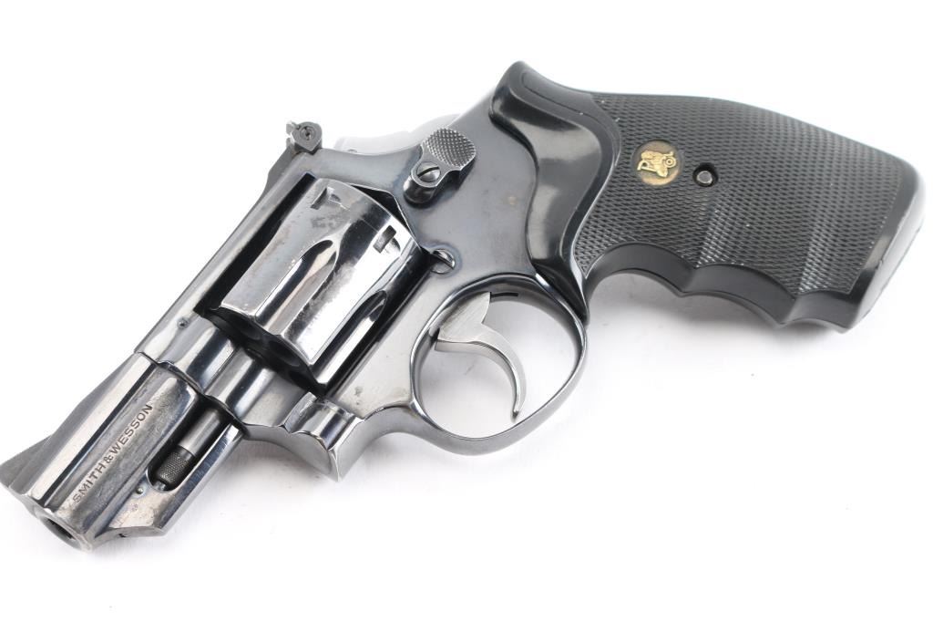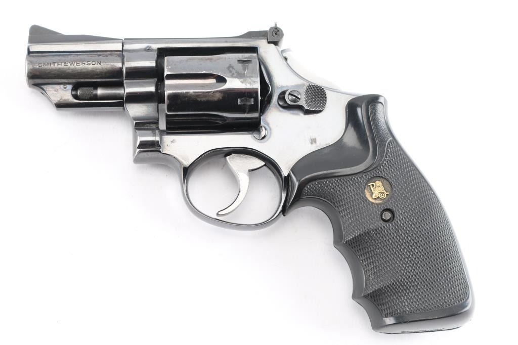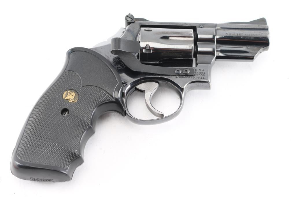 American double-action-only 6 shot revolver chambered for 357 magnum ammunition. It features a blued finish over a K target frame, 2.5" pinned barrel, black serrated ramp front sight, adjustable black rear sight on serrated rib, 6 shot fluted cylinder, the hammer and trigger have been polished with the hammer bobbed. There is a metal belt clip attached to the right frame. Trigger polished smooth. Black rubber "checkered" Pachmayr grips. Bore is excellent. Cylinders are excellent. Blue is about 80% with scratches/rubs, drag line on the cylinder and holster wear/finish loss, mostly on the barrel & cylinder. Action is crisp/tight..