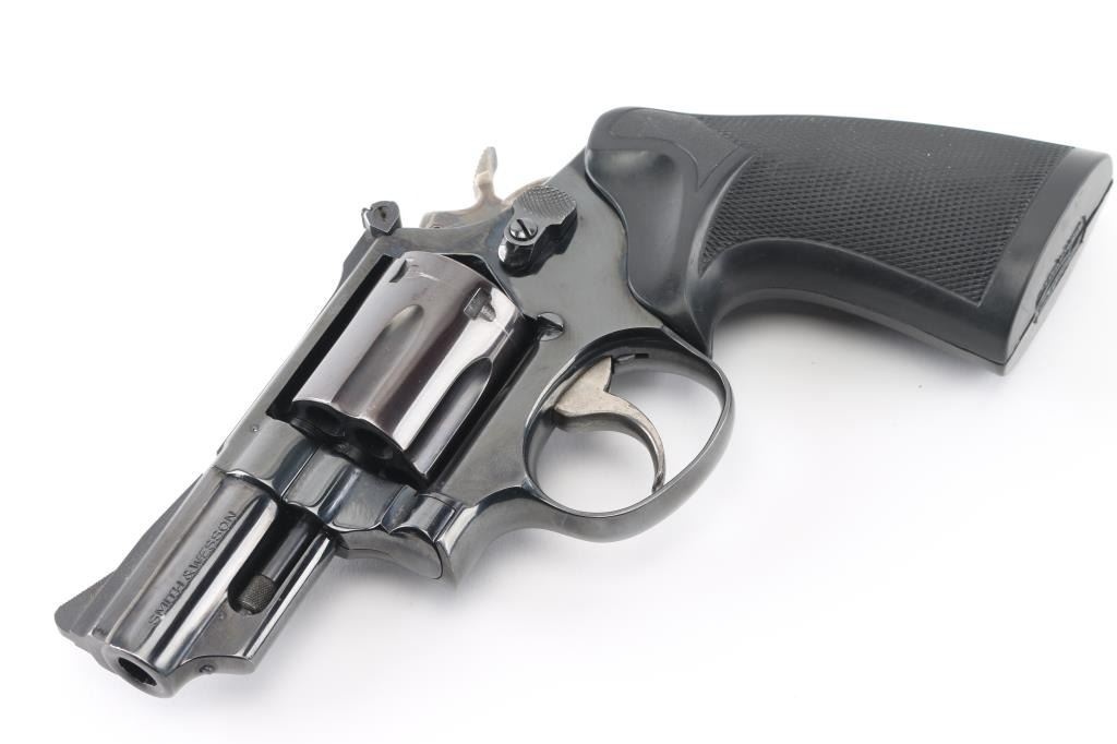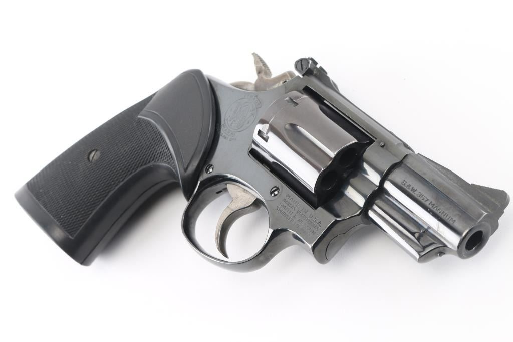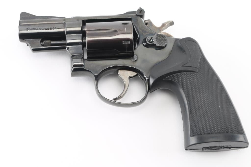 The ".357 Combat Magnum" Built on a square butt K target frame. (1967 relocation of rear sight leaf screw) Manufactured 1974. Medium frame double action revolver features pinned barrel & recessed cylinder for cartridge rims, blue finish, checkered black Pachmayr grips.2.5" barrel, adjustable sights, smooth polished wide trigger, case colored knurled wide spur hammer. Bore and charge holes are excellent/bright condition. blue finish is near excellent with slight drag line on cylinder, some minor edge wear. Grips are excellent condition. Action is smooth, lock-up is good. Appears carefully reblued, minor loss of original contours, sideplate polished off-gun, re-blue matches factory color.