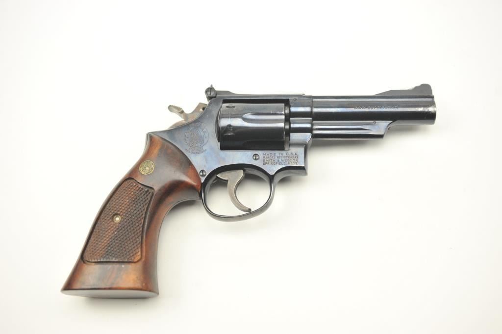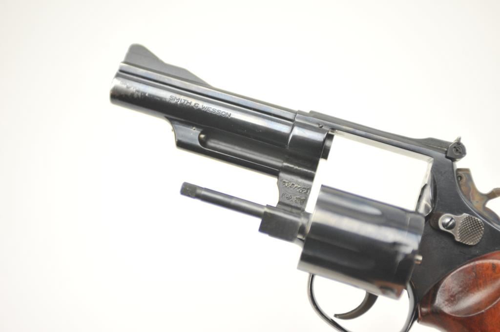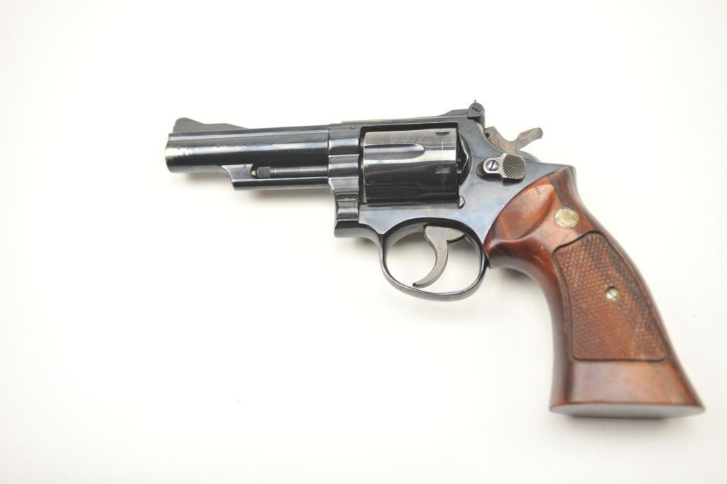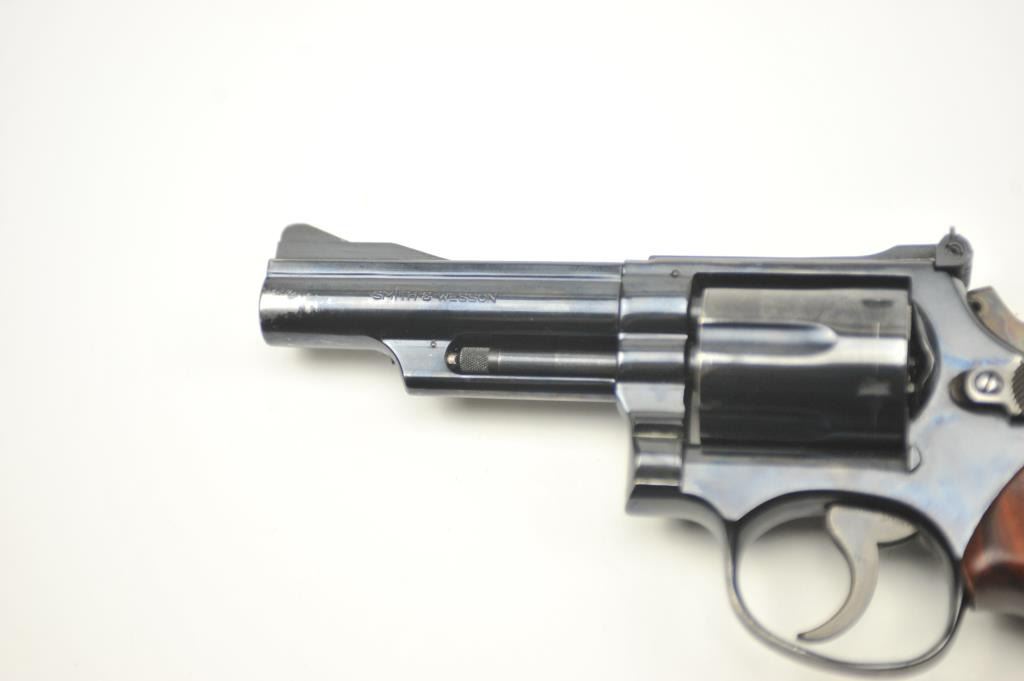 Smith & Wesson 19-3 Double Action Revolver with a 4” pinned barrel, target grips and hammer, 7K26621. Very good plus used condition. Holster wear from carry and use by “Old School” Maywood, CA cop. Good actionand good bore. Est.: $400-$800