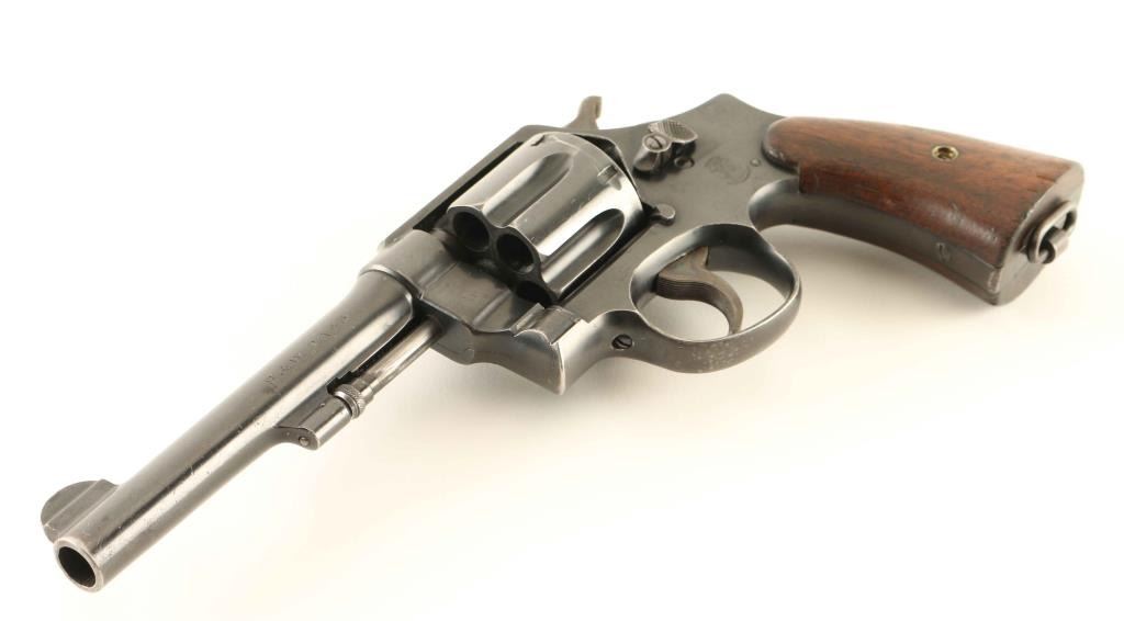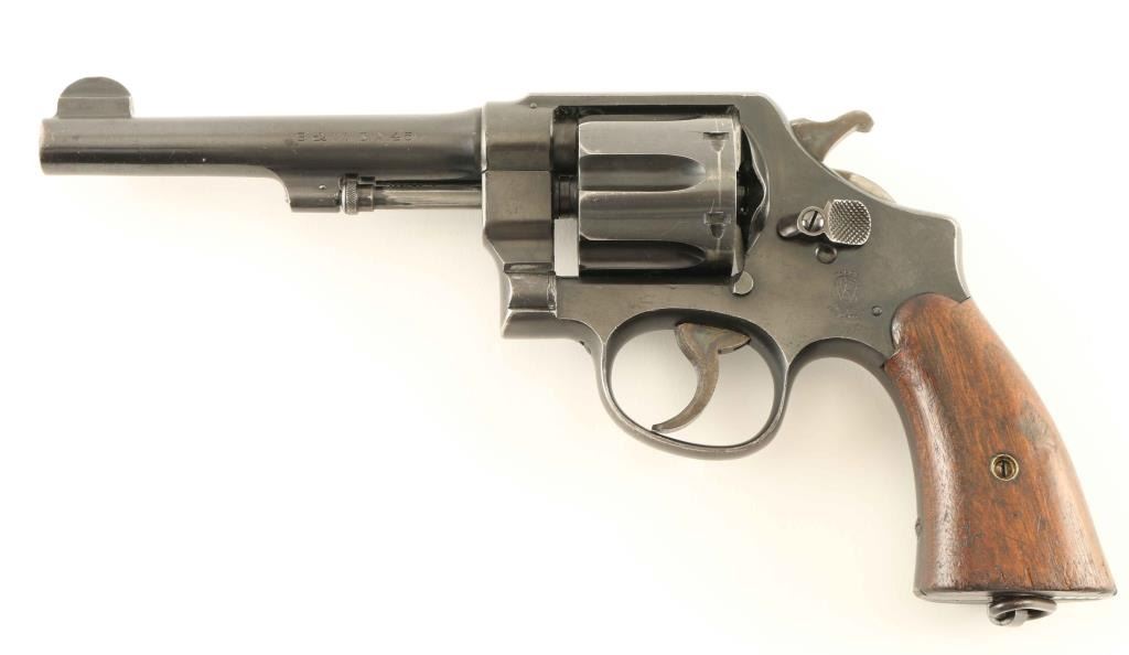 SN: 169747 '1937' Unusually early large frame double action revolver chambered in .45 ACP which was part of the 25,000 piece order from the Brazilian government. Imported by IA Co of Sacramento, California with import marks on the the barrel flat. Features a blued finish, pinned 5 1/2" barrel, round blade front sight, 'u' notched rear sight, non-shrouded ejector rod, fluted six-shot cylinder, serrated .275" trigger, .265" hammer with knurled spur, five screw square butt N frame with lanyard ring and two-piece smooth walnut grips. Serial numbers match on the butt, cylinder face, barrel flat, extractor and right grip panel. The revolver has been stamped with various inspector marks including a [eagle head/S34 on the barrel flat, [eagle head]/S2 on the yoke cut in the frame and [eagle head]/S24 on the cylinder face. Revolver exhibits approximately 80% of it's original blued finish showing holster wear, a drag line on the cylinder, thinning on the grip straps and some scattered losses & pin prick pitting. Action is smooth with good lock-up, the bore is dull with some scattered light pitting and the matching wood grips are good with some blemishes & small losses. Condition is NRA Good+. ***C&R Firearm***