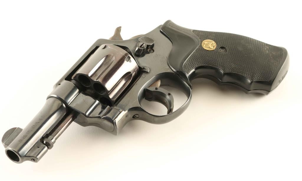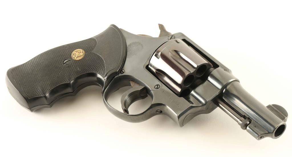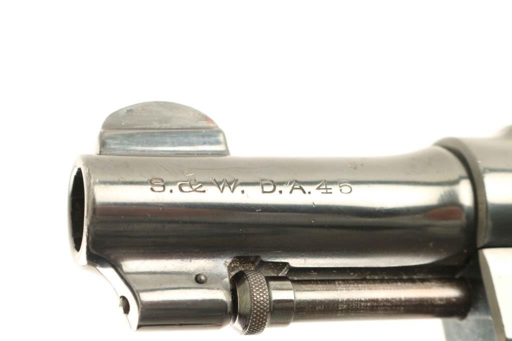 SN: 205659 '1937' Altered large frame double action revolver chambered in .45 ACP which was part of the 25,000 piece order from the Brazilian government. Imported by Navy Arms of Ridgefield, New Jersey with import marks on the frame under the left grip. Features a blued refinish, pinned barrel which has been shortened to 3 1/4", round blade front sight, square notched rear sight, non-shrouded ejector rod, fluted six-shot cylinder, serrated .275" trigger with wide trigger shoe installed, .265" hammer with knurled spur, five screw square butt N frame and Pachmayr Gripper one-piece checkered black rubber finger groove grip. Serial numbers match on the butt, cylinder face, barrel flat, and extractor. Revolver exhibits approximately 90% of it's blued refinish showing a drag line on the cylinder(which has turned plum), scattered handling wear and pitting on the frame under the grips. Action is smooth with good lock-up, the bore is excellent and the rubber grip is very good. Condition is NRA Good as refinished. ***C&R Firearm***