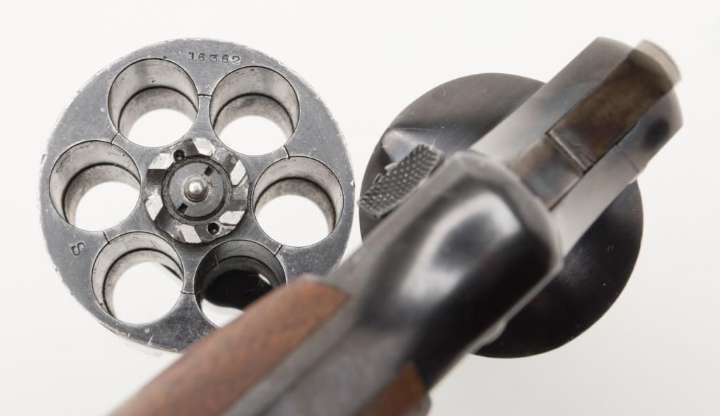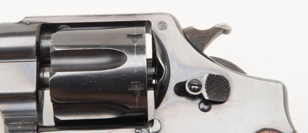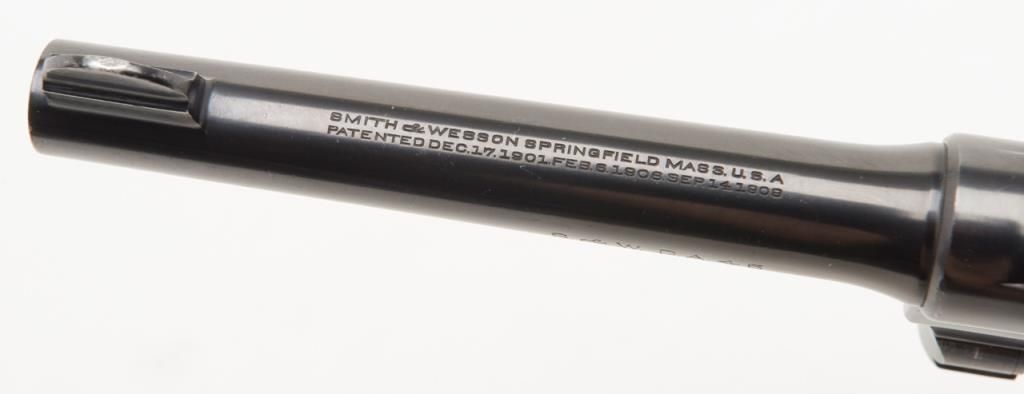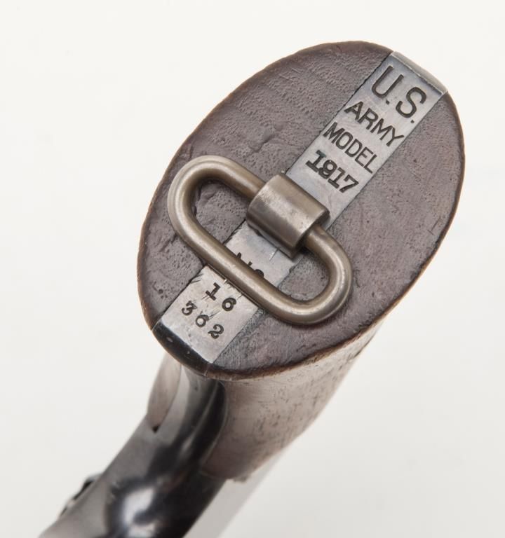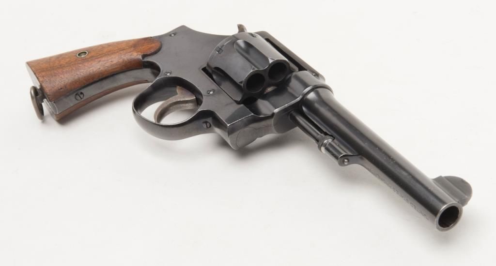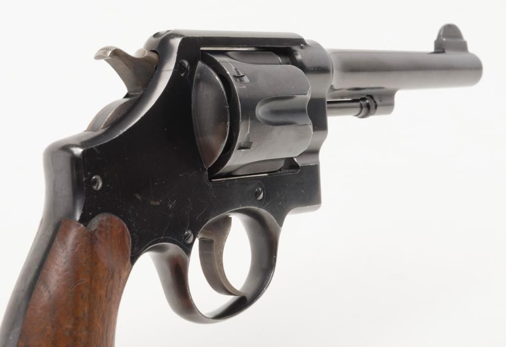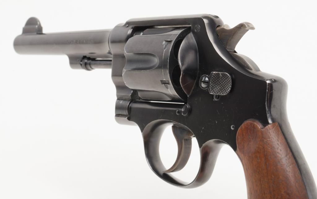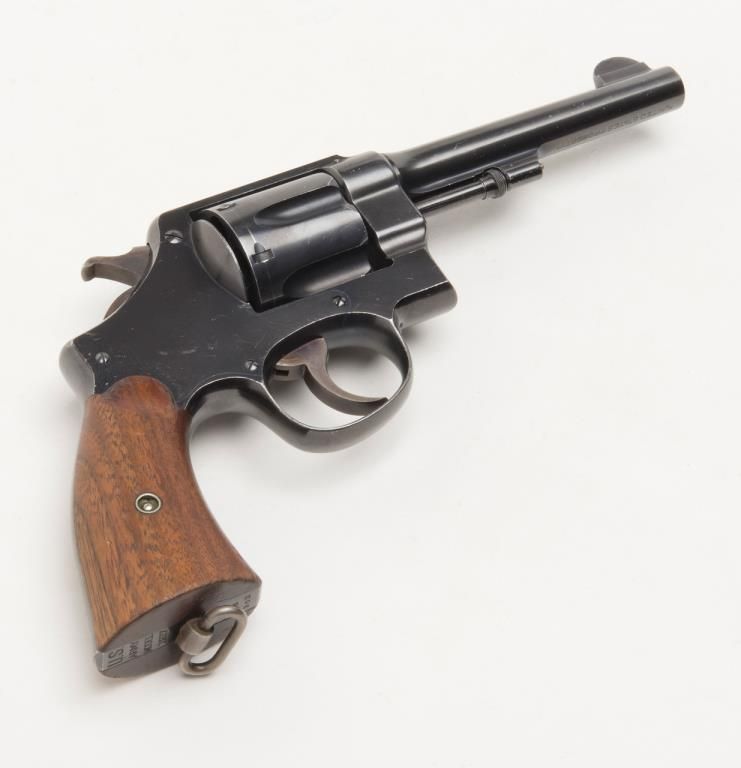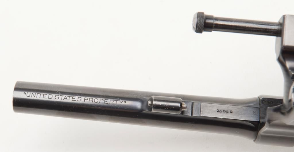 Smith & Wesson 1917 US Model Army, #16362, .45 cal., US Property Marked, 5 1/2" barrel, blued finish with color case hardened trigger and hammer. Revolver remains in fine condition overall, showing 95-98% original finish, thinningat the muzzle and high points, showing a drag line on the cylinder. Bore is bright, action is very good with good lock up. Grips are very good to fine with minor losses at the edges. GHS inspectors mark on the left side of the frame.Hard to improve upon. (C&R / PPT) Est. $600-1200.