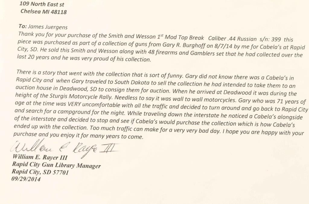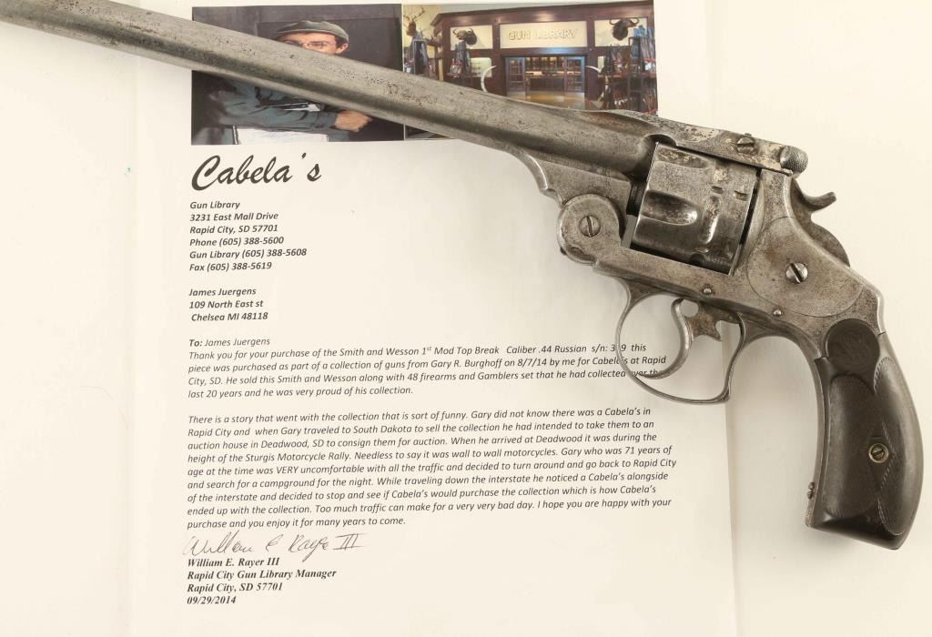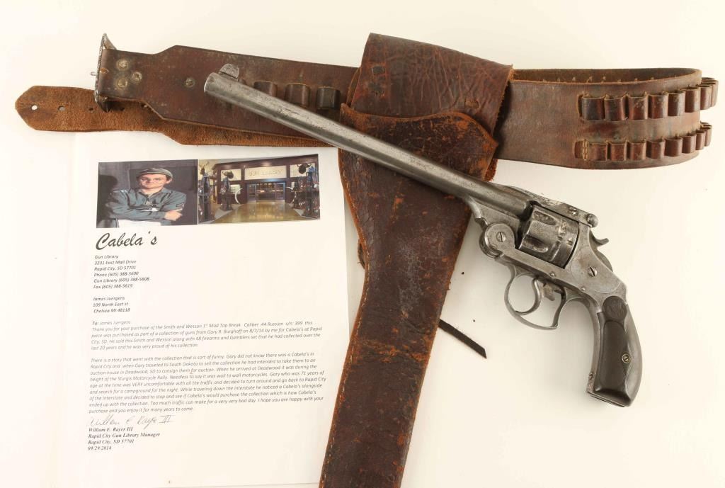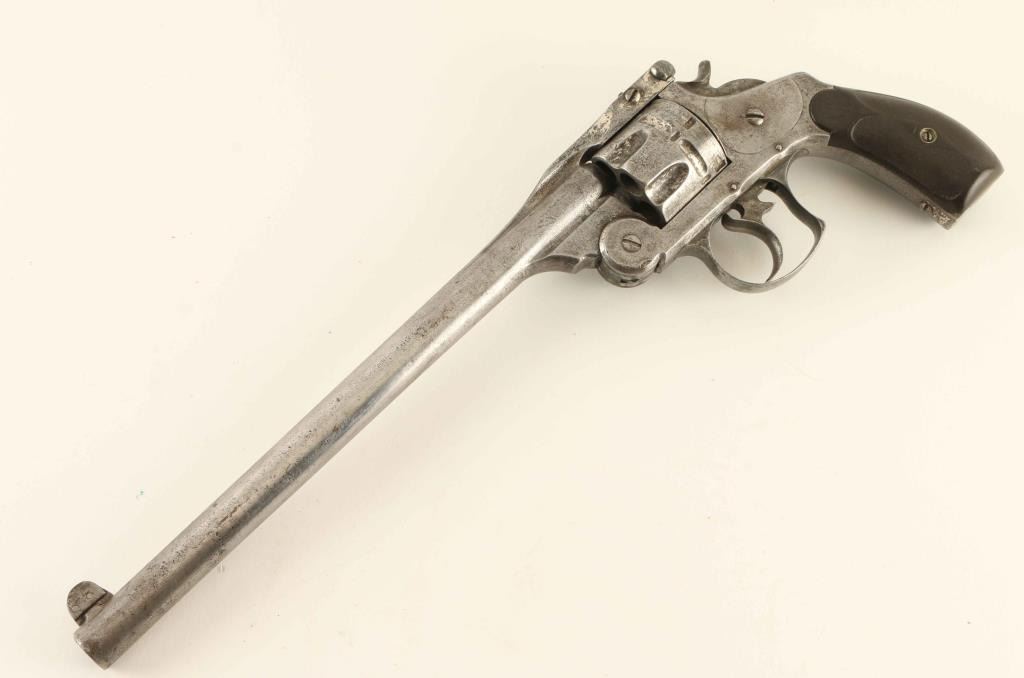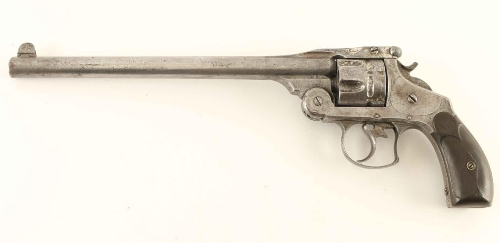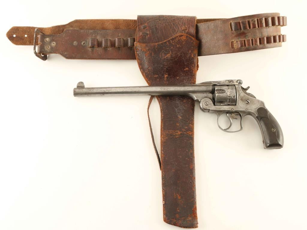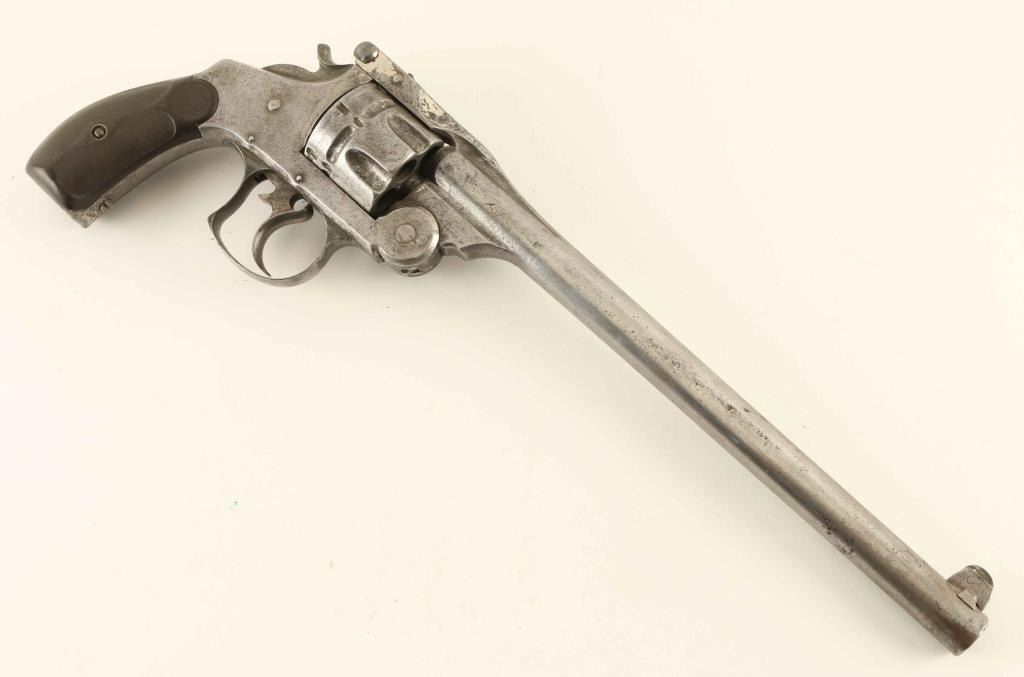 Altered antique double action top-break revolver with a 10.25" barrel, dovetailed blade front sight, six-shot cylinder, shortened hammer spur and diamond checkered hard rubber grips. The barrel has been lengthened from it's original configuration and the butt of the frame has been grooved possibly to assist with the addition of a shoulder stock. Revolver bears no remaining finish with the metal surfaces primarily in-the-white. Serial numbers on the cylinder & barrel latch are matching with no other serial numbers observed. Includes a period leather holster rig and a letter from Cabela's in Rapid City, South Dakota. The letter states that this gun along with 48 other firearms were purchased by Cabela's from Gary R. Burghoff, who is well know for his role as 'Radar' in the television program MASH. The action is in good working order, the bore is good, markings are nearly all worn and the grips are fair. The smooth brown leather holster is marked Main & Winchester. Condition is near NRA Good. ***Antique Firearm***