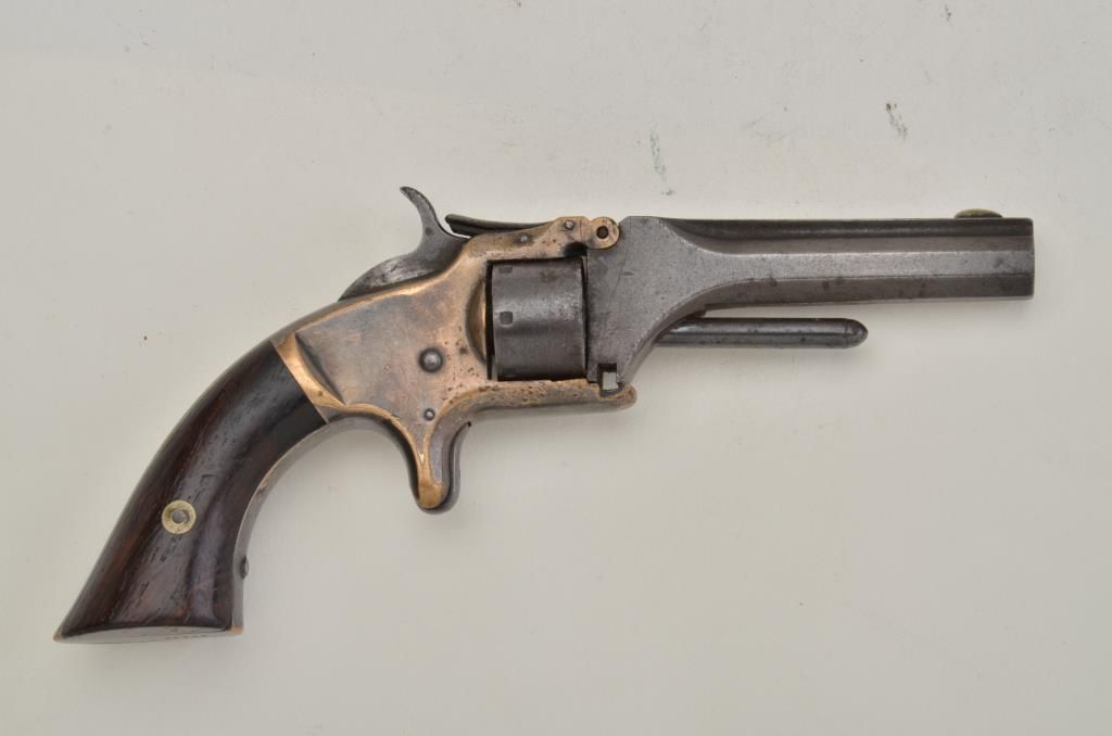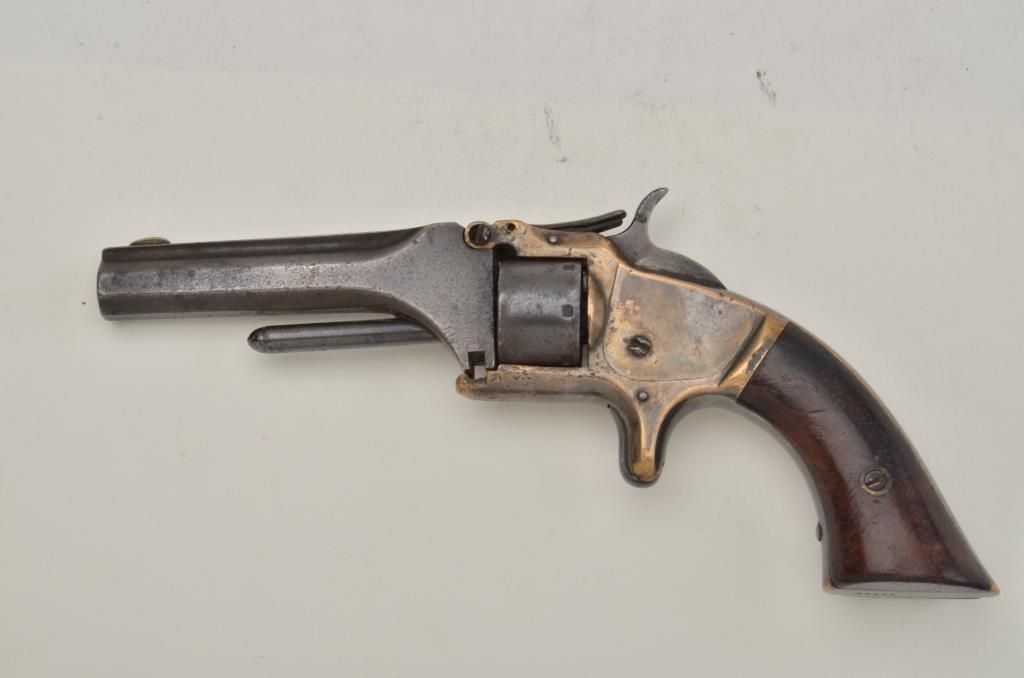 Smith & Wesson 1st Model 2nd Issue spur trigger revolver, .22 cal., 3” barrel, blue finish, silver wash to brass frame, rosewood grips, #23236. This gun is missing its barrel latch and the barrel assembly appearsslightly “tweeked”; action is partially working; bore is dark, traces of silver on frame, grips overall good, barrel address good; needs some work. Est.: $200-$300.