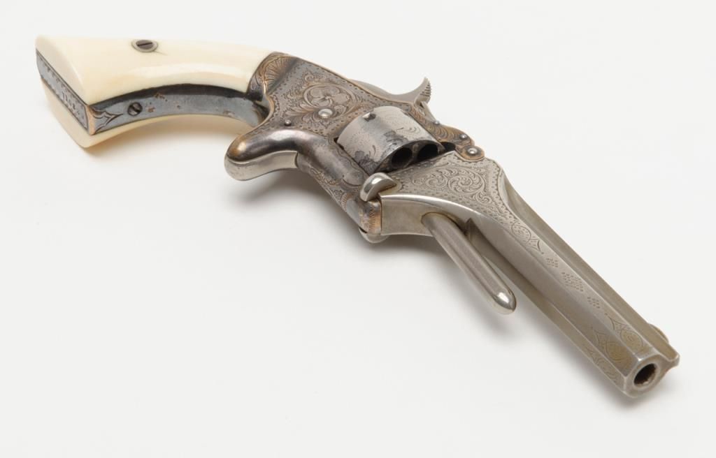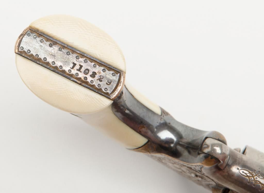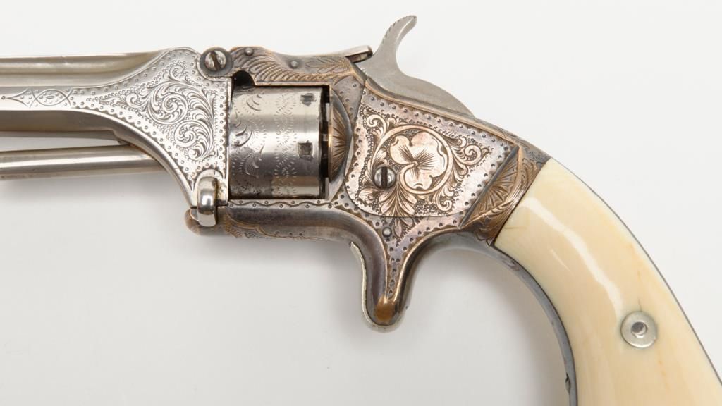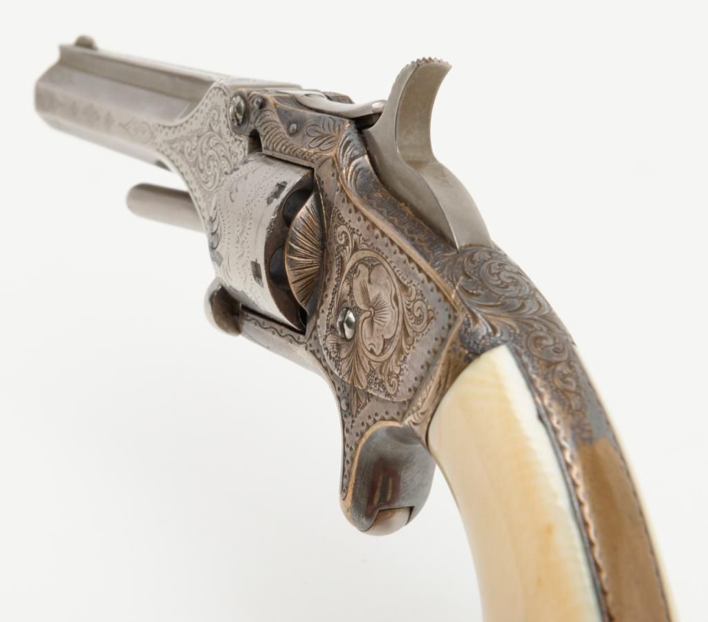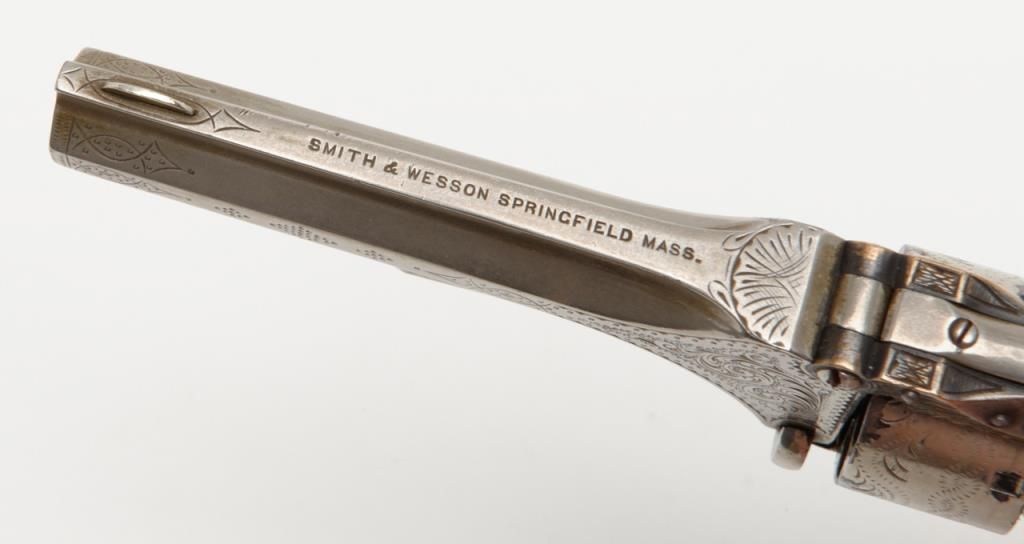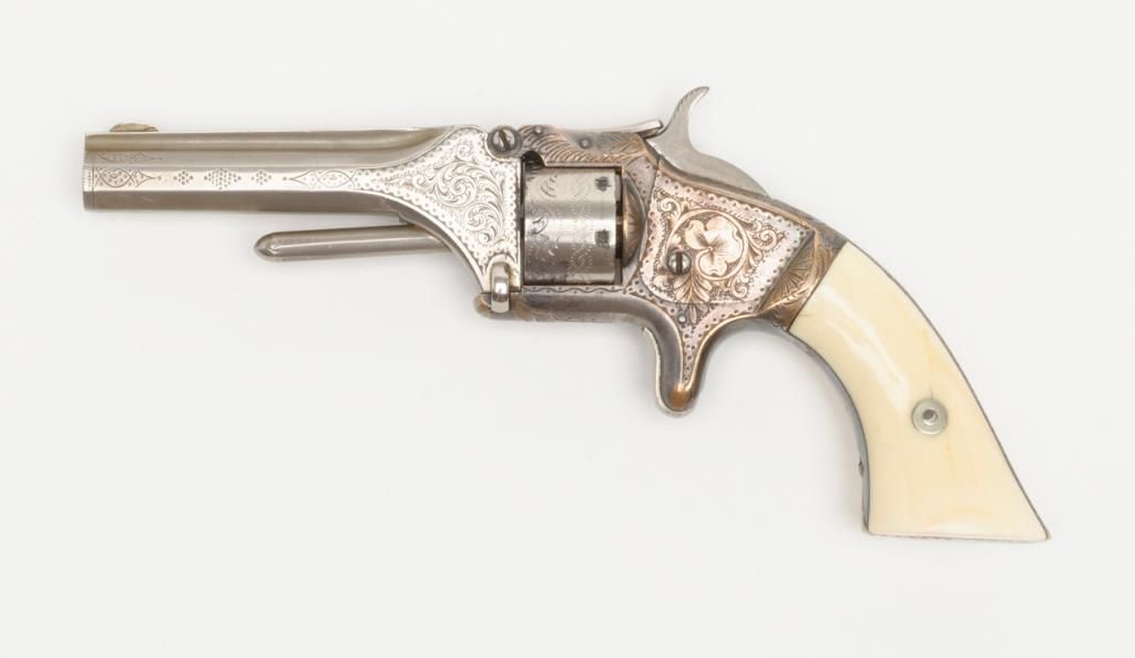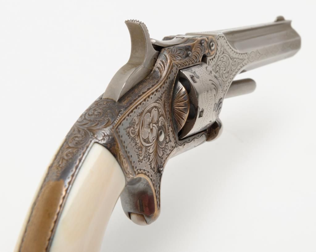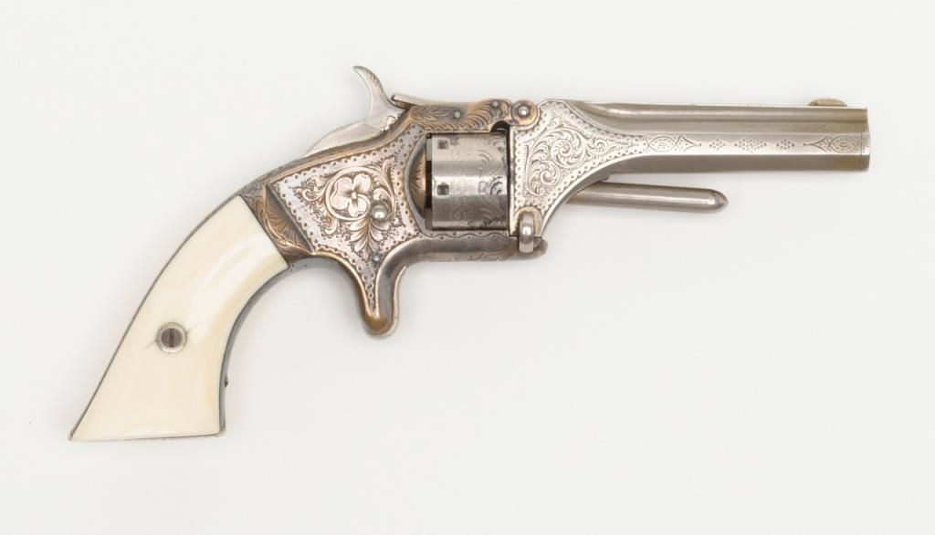 Smith & Wesson 1st Model, 2nd issue, .22 caliber 7 shot revolver, finely New York style engraved with silver finish, ivory grips, serial number 110329. The revolver shows fine scrolls and large floral designs with approximately 75% to 85%original silver remaining. The silver is toning and darkening with almost a blackish blue color to the silver and a dark natural brass patina were brass is showing. The grips fit impeccably and are in very good condition with normal aging. Thebarrel address is sharp. There is some loss of silver at the front edge of the cylinder and some beginning erosion and pitting from being shot. The condition is generally very good plus overall. Est.: $1000-$2000