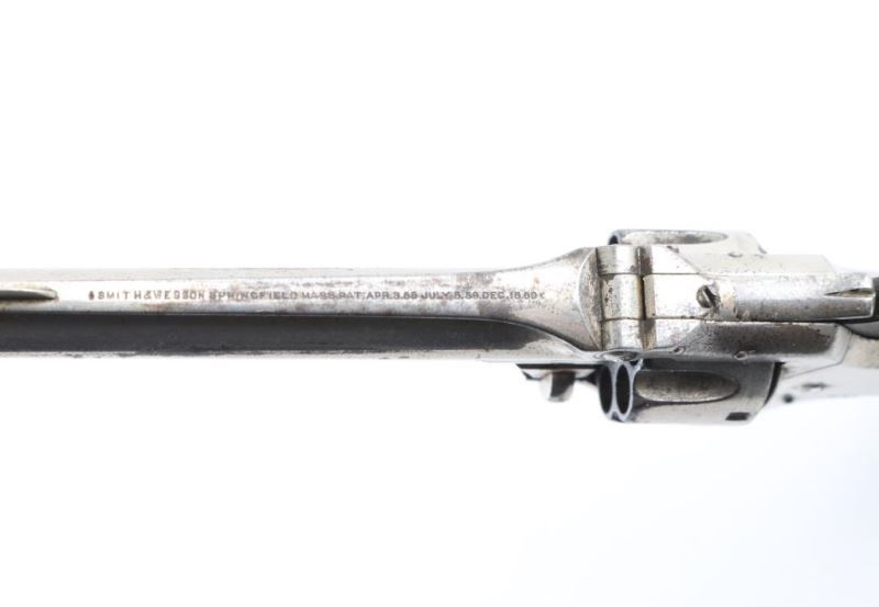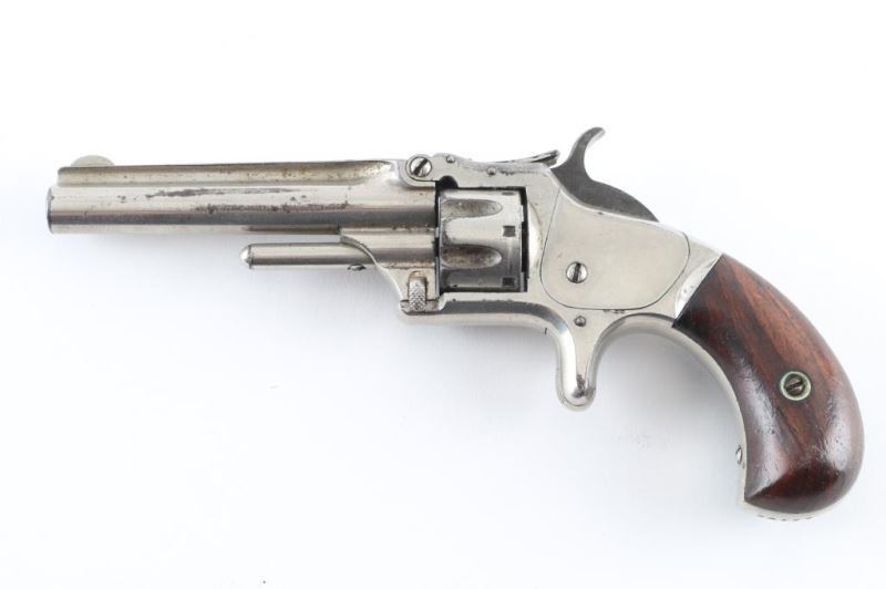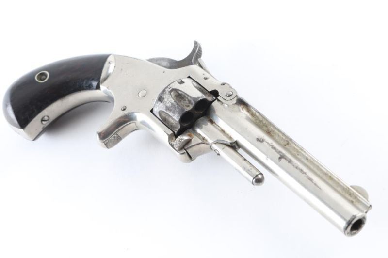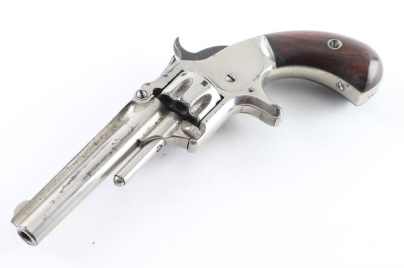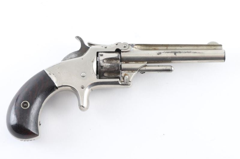SN 96129 Seven shot revolver showing nickel plated and varnished walnut grips. 75% original uncleaned original nickel with minor rust, pitting and slight erosion where finish has lifted, mostly around cylinder. Boor is poor. Good address with good to very good grips. The action cocks but cylinder does not lock up. Broken or missing spring for cylinder stop. Early frontier era. Condition is NRA Fair *** Antique Firearm ***