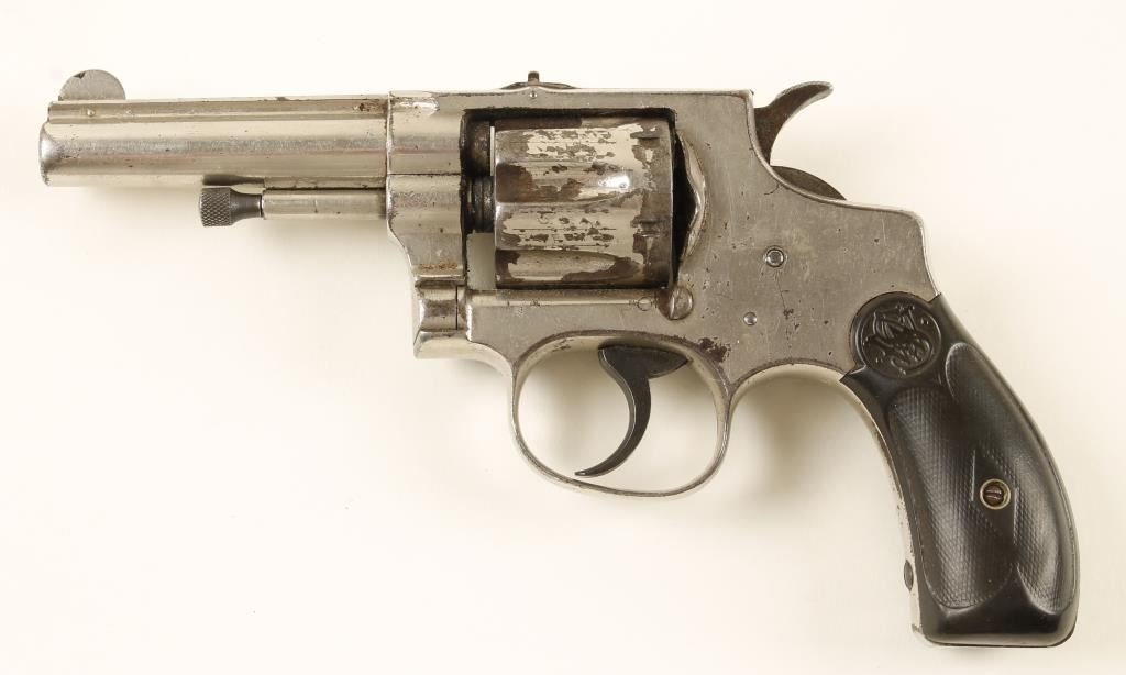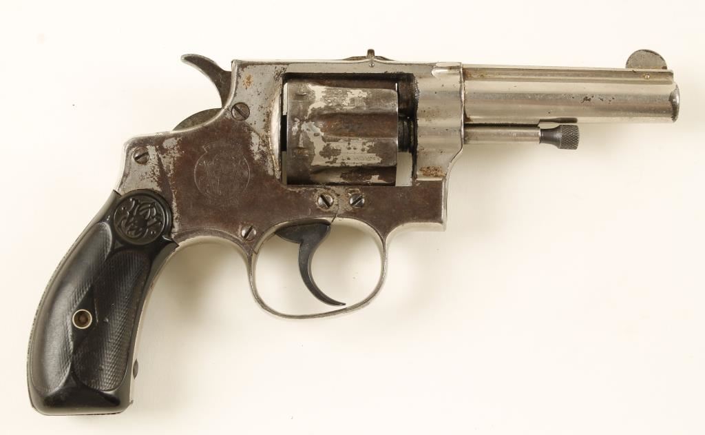 SN: 8410 Nickel plated 6-shot double-action solid frame revolver with a 3-1/4" barrel and hard rubber grips. Plating is dull and scratched with the edges and many areas worn through to bare metal that has turned to a brown patina. The checkered hard rubber grips are worn smooth in spots but are 100 % complete with no chips or cracks and only a few minor deficiencies. Works well in double action but doesn't rotate the cylinder fully to the next chamber in single action. Bore is dull with lots of rifling and pitting. Chambers are dirty but appear unmarred. Condition is fair. *Modern Firearm*