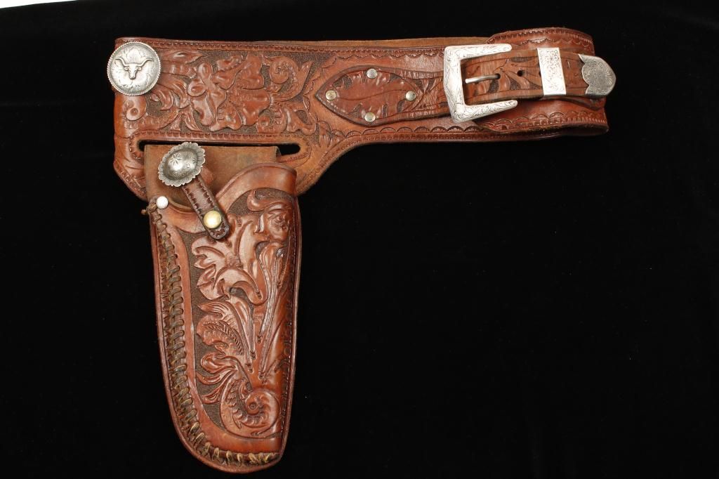Smith & Wesson 1st Model Hand Ejector (“Triple Lock”) DA revolver, .44 S&W Special cal., 5” barrel, re-nickeled finish, custom engraved Bohlin silver grips with LA County Sheriff’s Badge medallions and gold initialson the right grip “WRT”, #2045 (and a star on the butt strap) with factory letter indicating the gun was shipped from the factory on April 21, 1910 and delivered to Union Hardware & Metal Co., Los Angeles, CA.with a 5” barrel, nickel finish and checkered walnut grips. The letter also states “The star next to the serial number indicates that the revolver was returned to the factory for refinishing or rework”. The gun is alsoaccompanied by a custom fancy tooled leather silver mounted holster rig. This gun and rig are accompanied by a letter and file of information from noted Western historian and author Lee Silva who discovered the gun in2009 and was able to determine the it was previously was the property of Warren R. Tate, a member of LA Sheriff E.W. Biscailuz’s “Silver Mounted Posse”, one of five Board of Governors of the Posse and the Chairman of