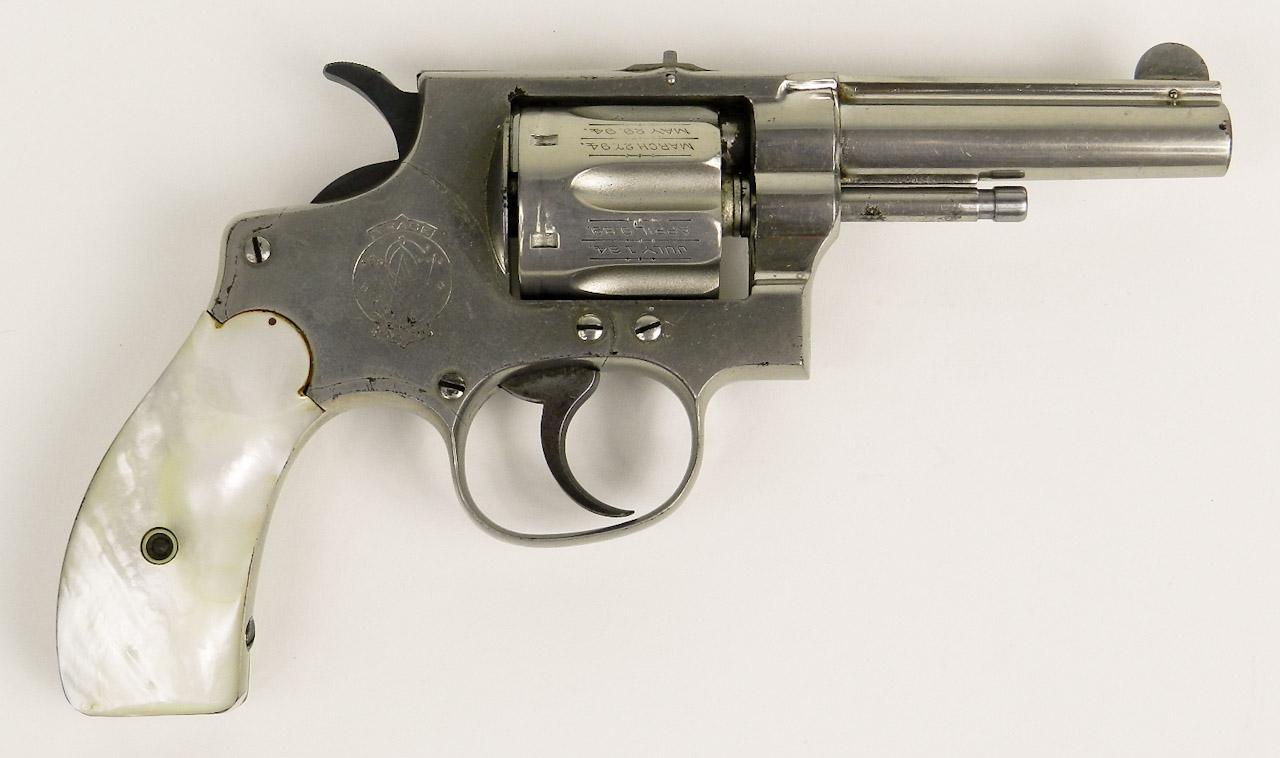 Smith & Wesson 1st Model Double Action Revolver, #889, .32 S&W cal., 3'' barrel, nickel finish, factory non-medallion pearl grips. Condition is fine retaining approx. 90%+ toning nickel with losses in forcing cone area. Grips show light wear but with no cracks or chips. Action is crisp and tight, bore is at least very good and should clean to better. (Wall Hallstein collection) Est.: $400-$600.