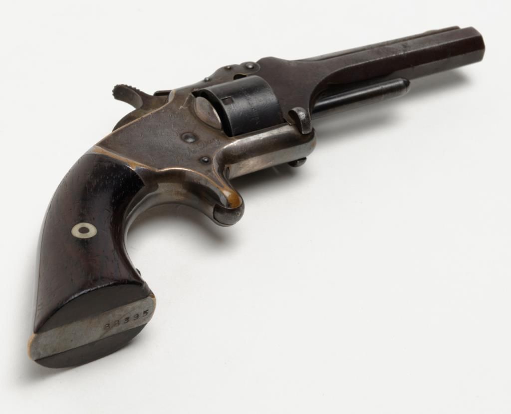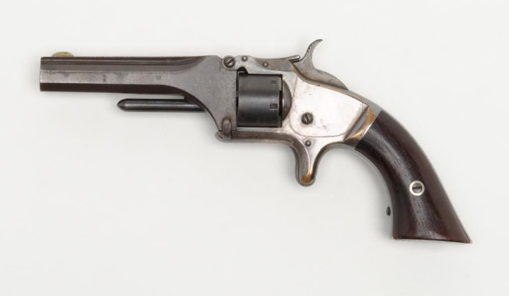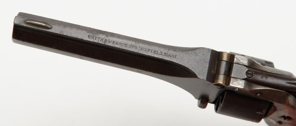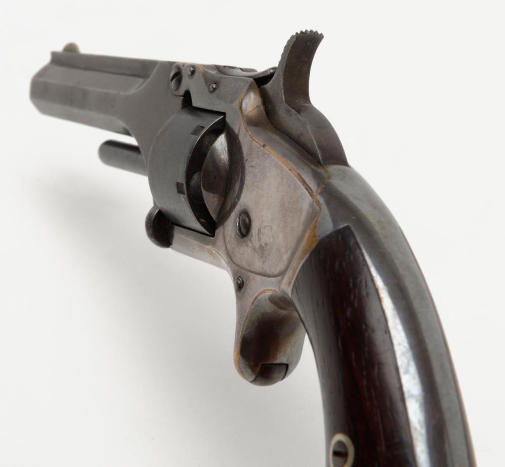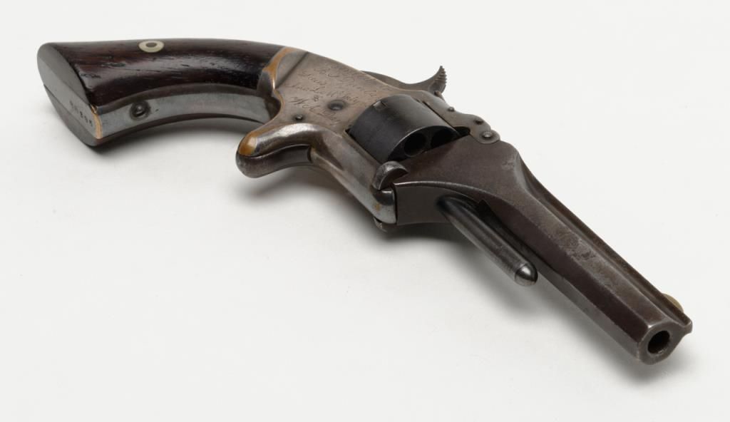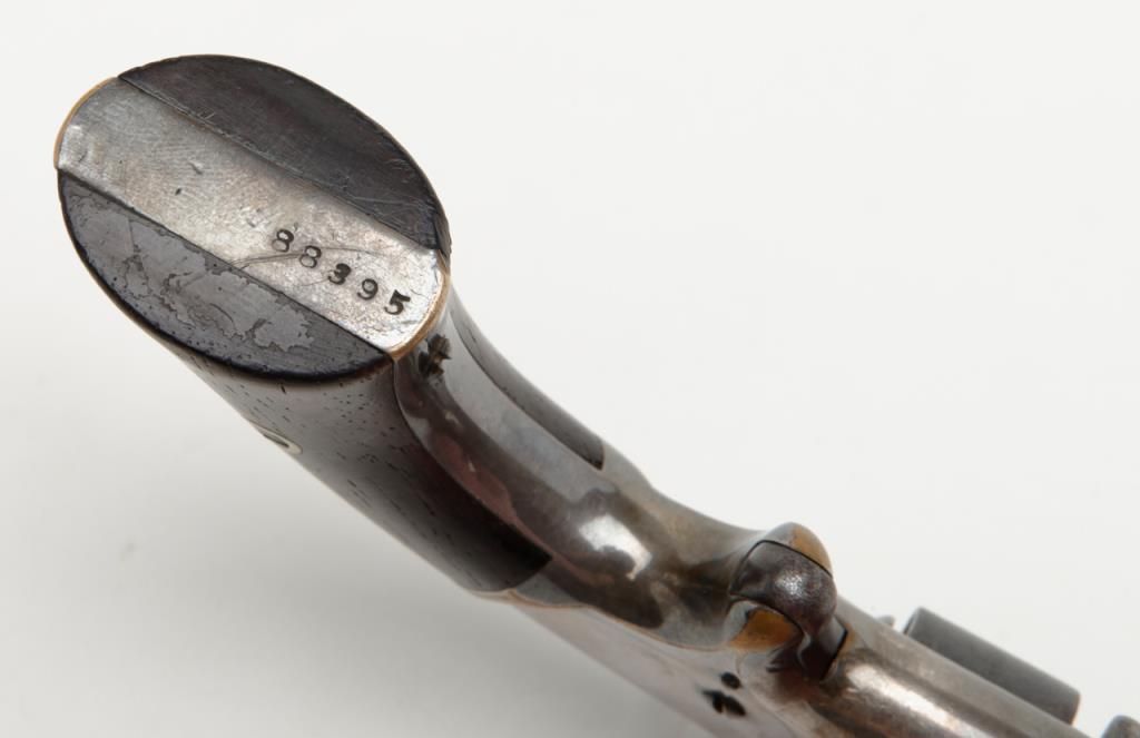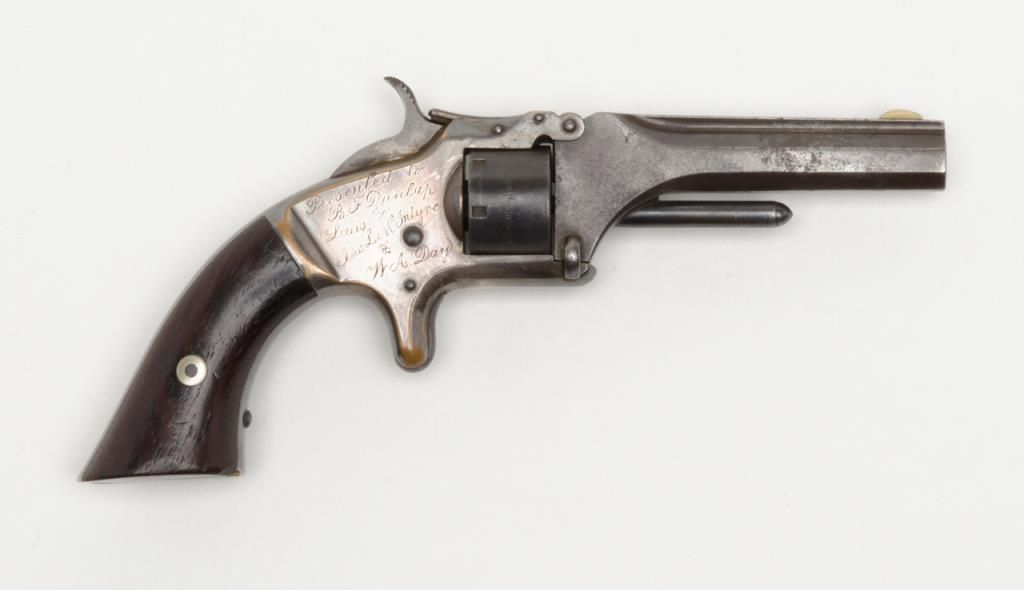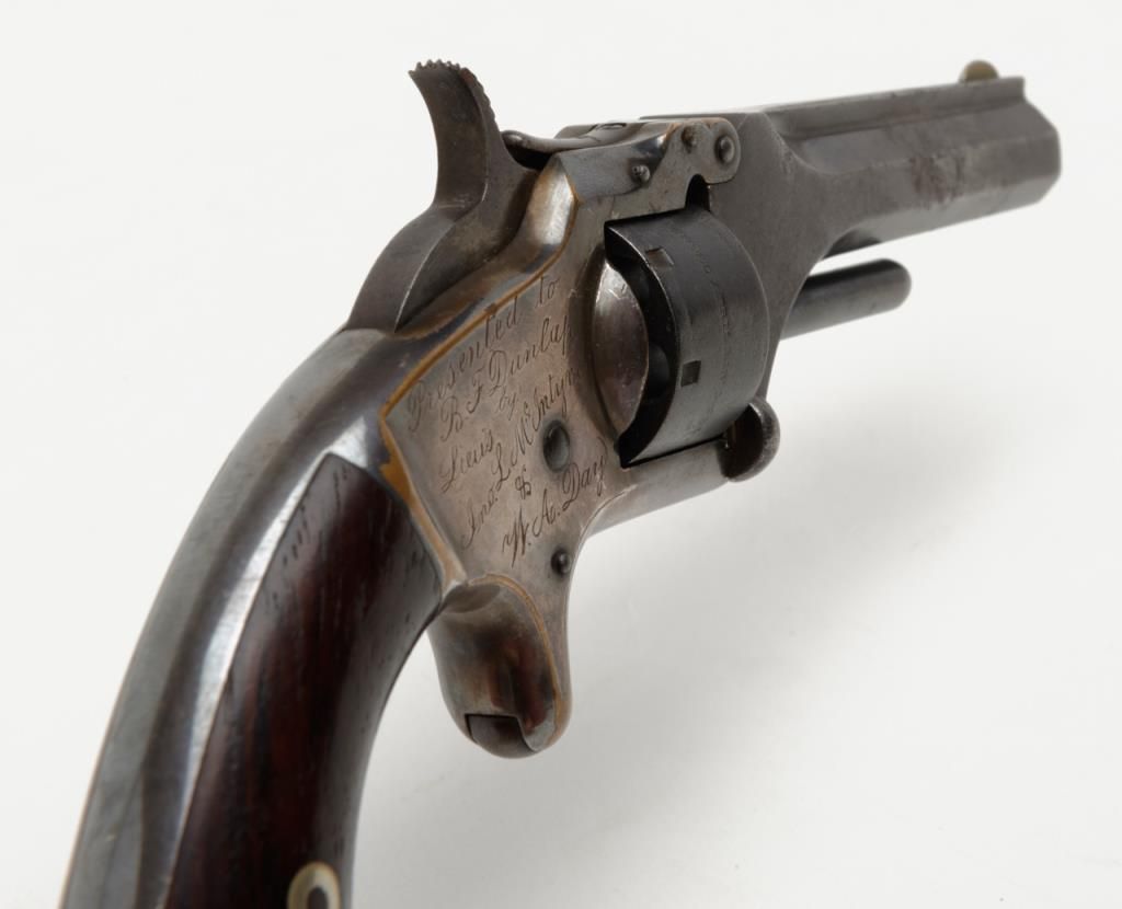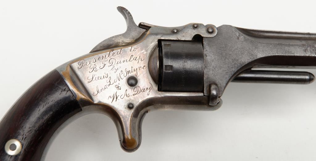 Smith & Wesson 1st model 2nd issue .22 caliber 7 shot revolver with frame period inscribed in script on the right side “Presented to R.F. Dunlap by lieu’s Jno. L. McIntyre and W.A. Day”, serial number 88395. This revolver remains in good tovery good original condition showing 30% to 50% original blue mixing in with a brown patina on the barrel and cylinder with some minor erosion and pinprick pitting. The cylinder shows good clear patent dates. The frame shows 75% darkenedoriginal silver wearing at the high points and edges with a dark blue color from natural age. The varnished rosewood grips are very good plus with just some slight edge wear. The action works well and the barrel address is good. The bore shows use and the barrel is tight upon the hinge pin. It would be interesting to research the history of these three men as they may well have had Civil War careers and served together. Est.: $1250-$2500