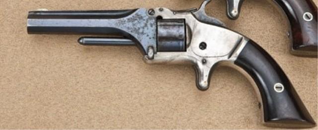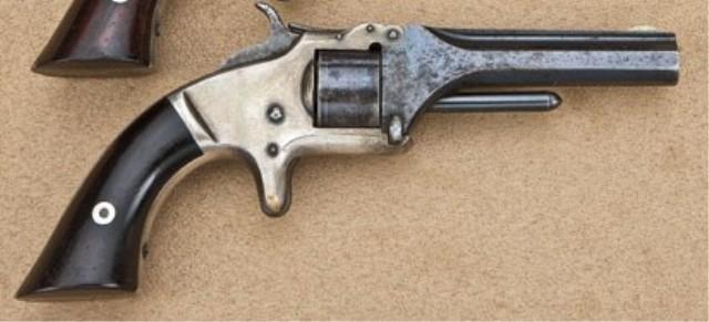 Smith & Wesson 1st model 2nd issue, .22 caliber  revolver, blue and silver finish, varnish rose  wood grips, serial #42647. The barrel and cylinder  show 50-60% bright original blue with some  erosion and pinprick pitting. The frame shows 90% silver, the grips show 50-60% varnish with some  small marks and wear at the edges. The markings  are sharp, the action is crisp, the interior is  good and the pistol shows a bright bore. From the  Bernard Braverman Estate. Est: $300 - $600