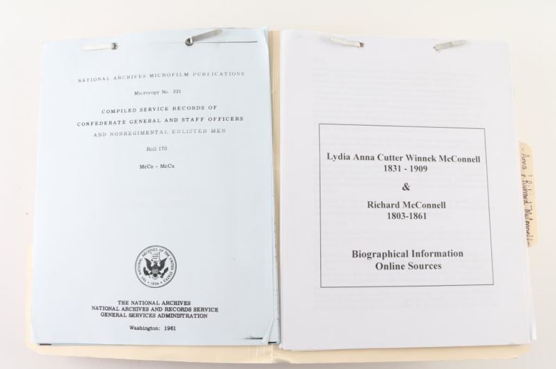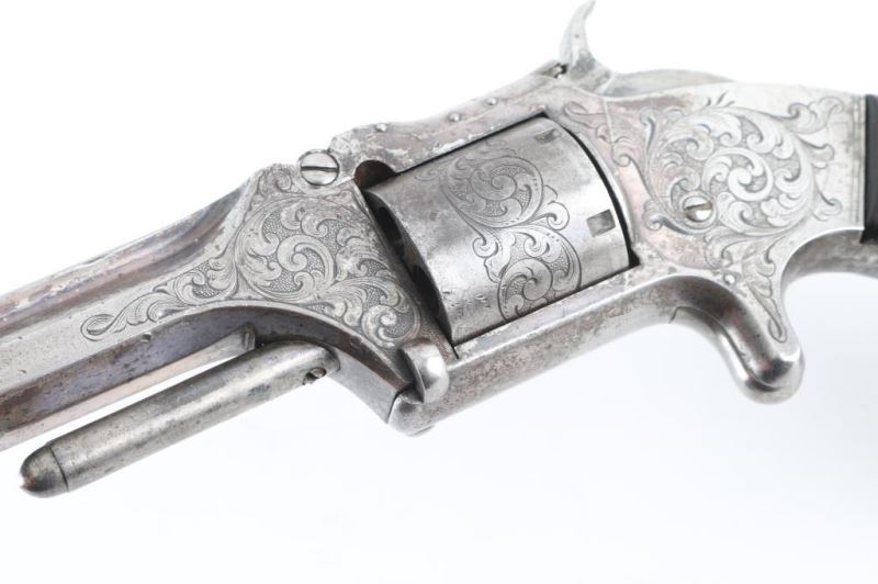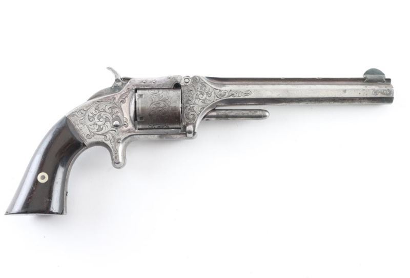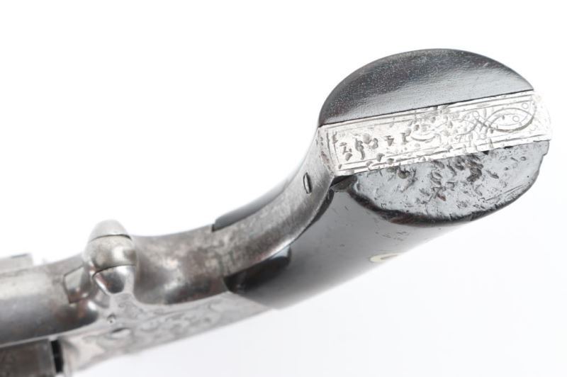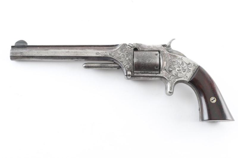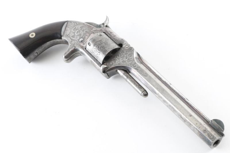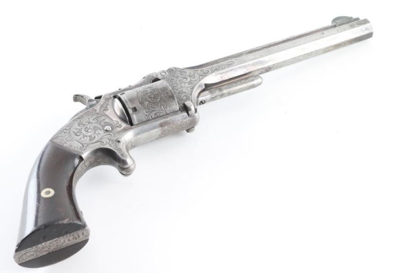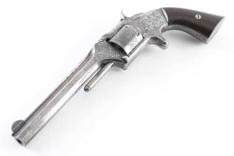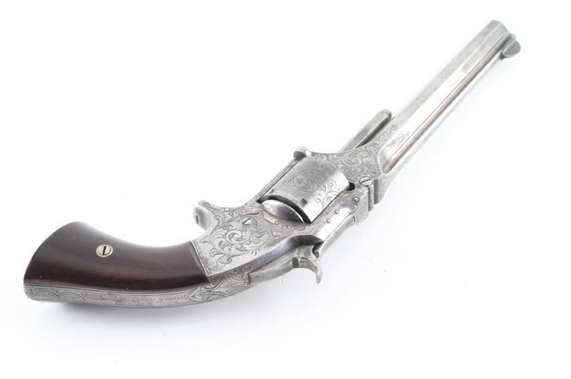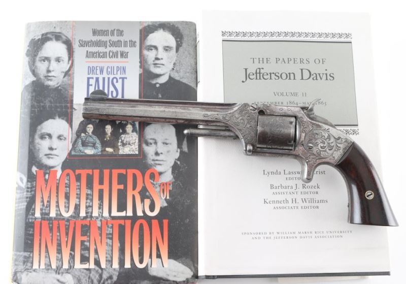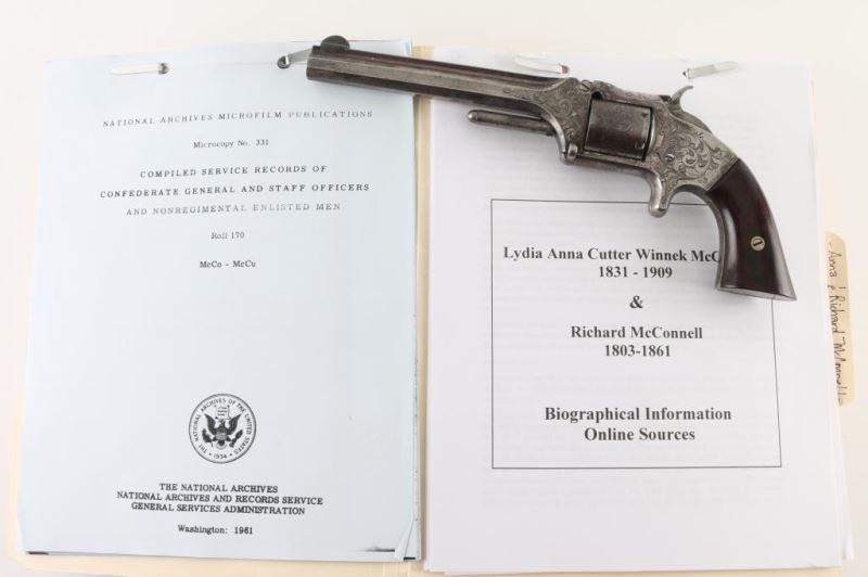 Early single action revolver manufactured circa 1863. Features 6" barrel, 6 shot unfluted cylinder, hinged opening, fixed sights, spur trigger, and smooth rosewood grips (serial number stamped into the back of the right panel). Fair bore with strong rifling, good condition charge holes, smooth action and good lock-up. Engraved over 50% of its surface in the Nimschke style, and period inscribed "Anna McConnel" on backstrap (There is some historical information that shows Anna McConnell's name was sometimes misspelled with a single "L"). Finish is silver plated, very good condition with dings and handling marks, a little thin patina in several places, slightly darker color on cylinder. Wood grips are fine condition. Bottom of grip shows many small impact marks. Also included is a vast treasure trove of information, to include letters, books, Census records, and Confederate military service records that provide background on Anna McConnell (and her husbands), her correspondence with Jefferson Davis, and her position as a woman of influence and importance during and after the American Civil War. Included factory letter states "was probably shipped from our factory on August 29, 1863, and delivered to Charles Gibbs, Springfield, MA. This shipment was for a 6 inch barrel, full plate finish, and smooth rosewood grips. There is no mention of any engraving or inscription in the records". Condition is NRA Fine *** Antique Firearm ***