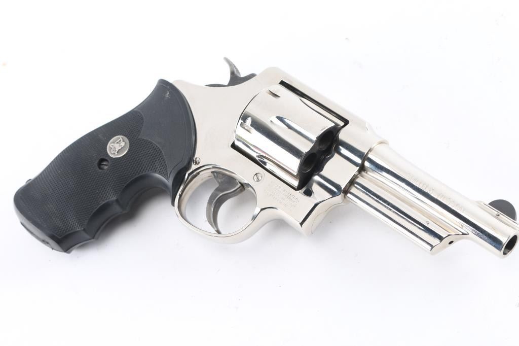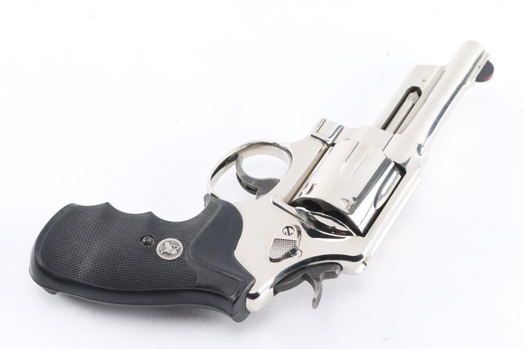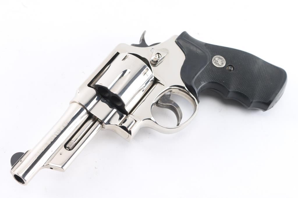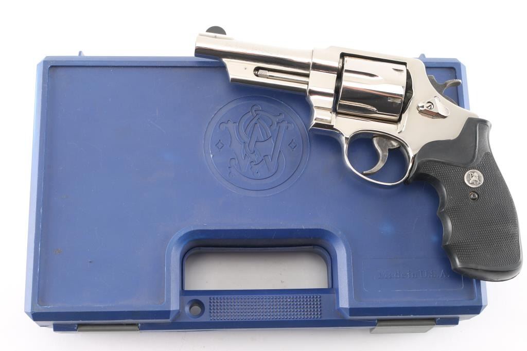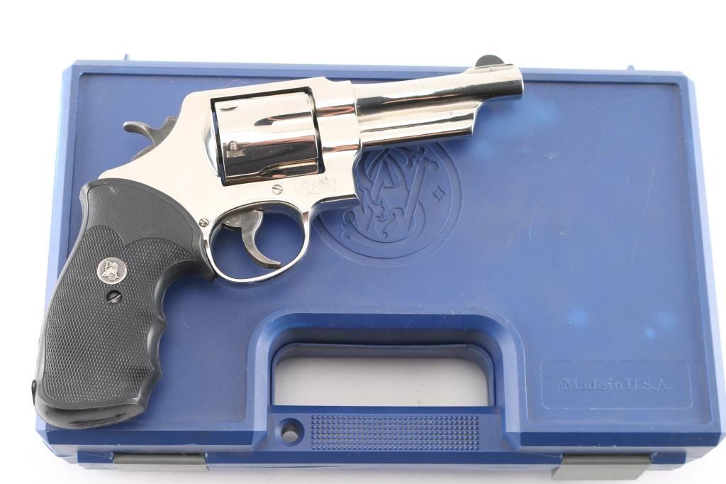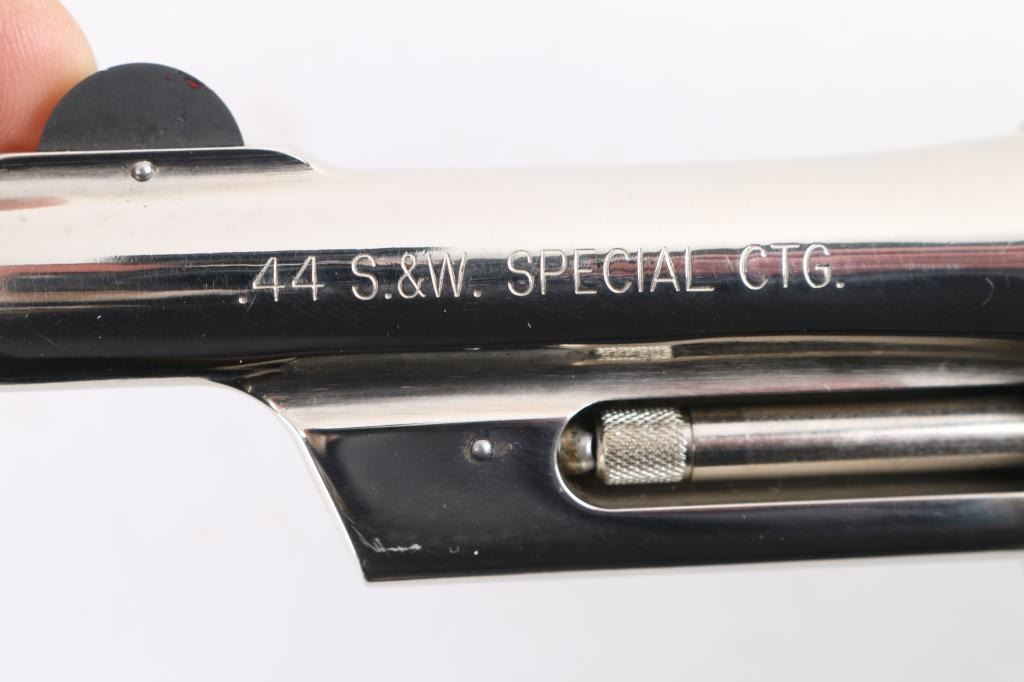 Large frame double action revolver in 44 S&W Special. Features a nickel finish on 4" tapered barrel with a black pinned half-moon front sight with red paint and square notch rear sight, shrouded extractor rod, fluted 6 shot cylinder. The three screw round butt N frame has no integral key lock system and a frame mounted firing pin. Case colored smooth trigger and knurled hammer. Grips are Pachmyer black finger grooved checkered rubber with silver colored Pachmyer emblems. Bore is bright with strong rifling. Retains approx. 98% nickel finish with little to no losses. Includes original factory blue plastic box, manual and key.Condition is NRA Excellent.*** Modern Firearm ***