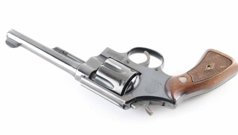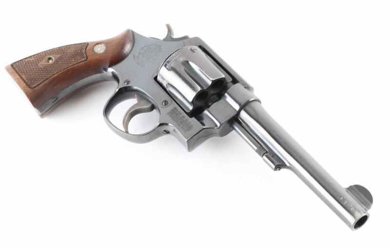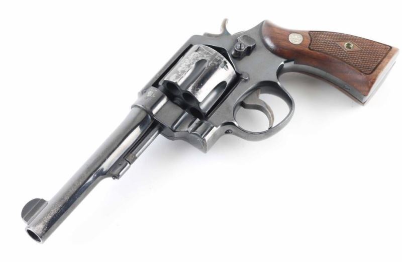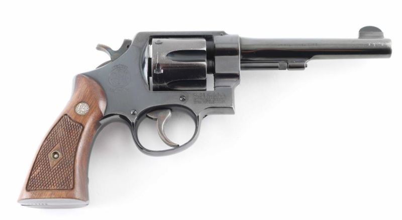 'Model of 1950' Double/single action revolver manufactured circa 1961. Features approx 5.5" barrel, half moon front sight, fixed rear sight notch in frame, six shot swing-out cylinder, checkered wood "Magna" grips with S&W medallions. Intended for use with half or full moon clips, or 45 Auto Rim cartridges. Bore is very good condition. Cylinder charge holes are dirty, appear smooth good condition. Retains 70% dark high polish blued finish with several large areas of shallow wide pitting (cleaned - shows as bare metal), bare metal on ridges and high spots, holster wear at muzzle. Case color on hammer & trigger show good bright color. Grips are very good condition. Action is smooth with tight lock up. Condition is NRA Good++ *** C&R Firearm ***