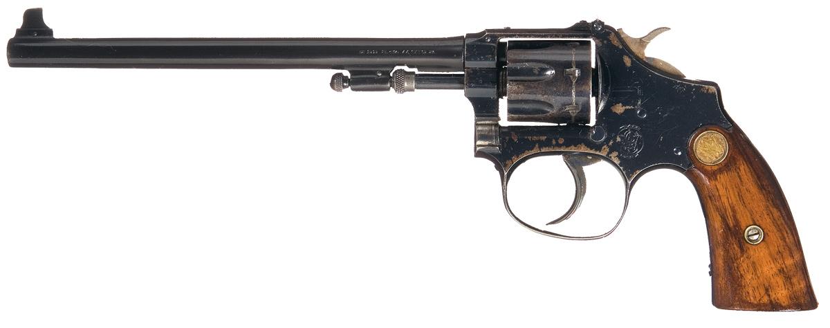 Shipped from the Smith & Wesson factory originally on December 11, 1911. features the scarce six inch barrel with target sights. Two line address/patent dates marked on top of the barrel with "22 S&W CTG" on the left side. S&W logo on the left side of the frame. Blue finish with casehardened trigger and hammer and fitted with smooth walnut grips with S&W medallions. Matching numbers on the cylinder, butt and barrel with a factory rework "star" marked on the butt. Complete with two extra sets of fair grips and a factory letter that verifies the barrel length, target sights, blue finish and smooth walnut grips. The letter also states the revolver was returned to the factory in April of 1948 for unstated rework or refinishing.