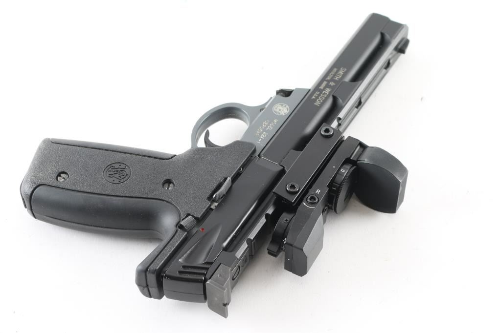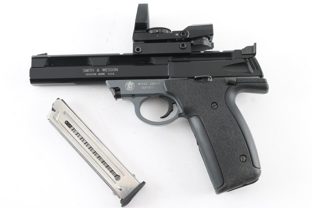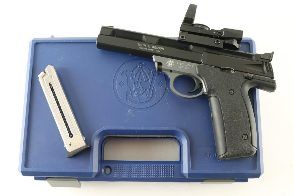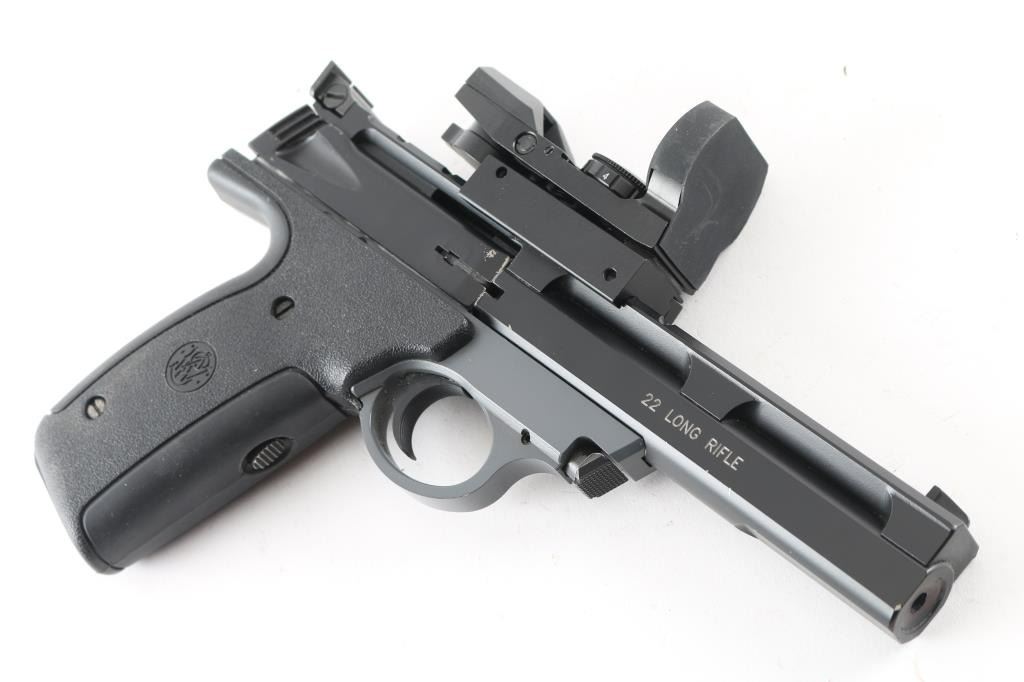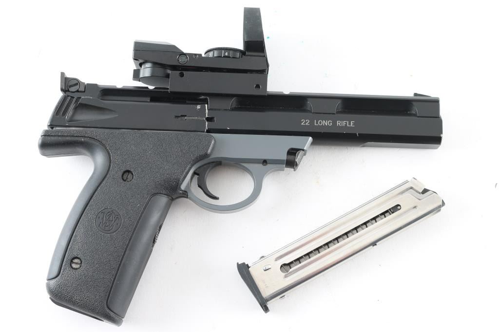 American made semiautomatic pistol chambered for .22LR ammunition. It features black color barrel and slide, medium gray frame, black polymer grip assembly, 5.5" barrel, fixed blade front sight, adjustable rear sights, integral scope rail, frame mounted manual safety with the mag release in the front strap. Metal finish looks good but does show signs of use and handling with several small spots where the finish has been rubbed off. Grips are fine. Bore looks great, bright. Comes with an unmarked multi-reticle holographic red dot (it works), original blue plastic factory case, owners manual and two magazines. Condition is NRA Very Good *Modern Firearm*