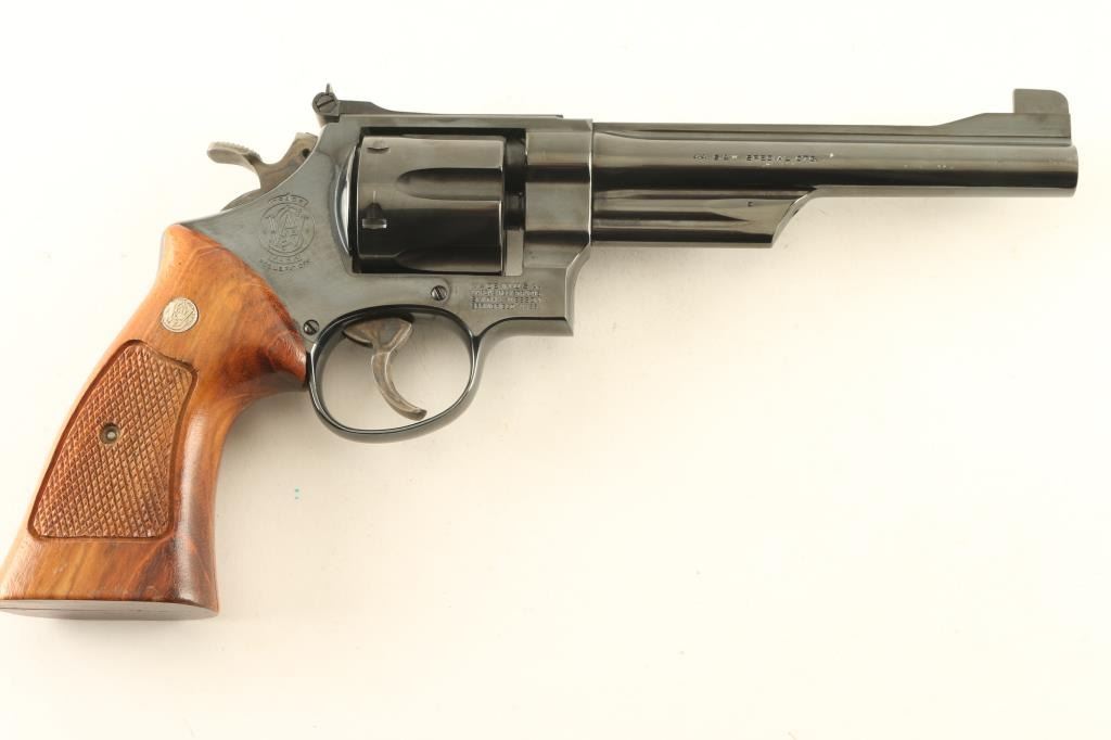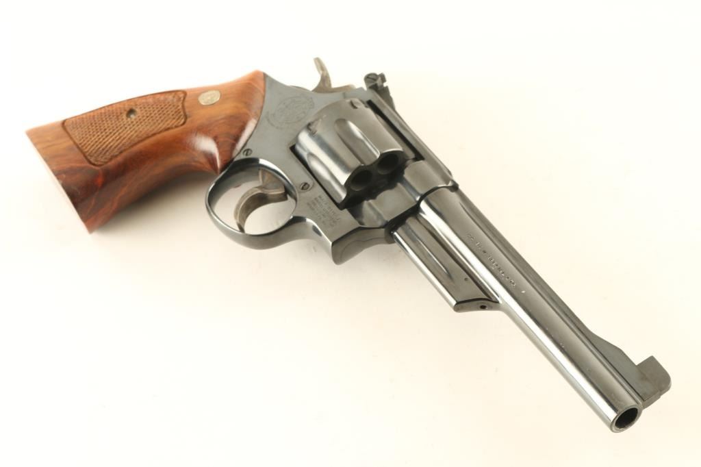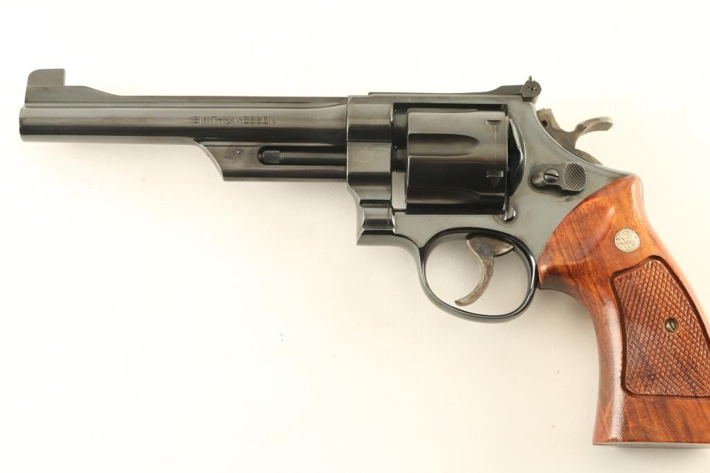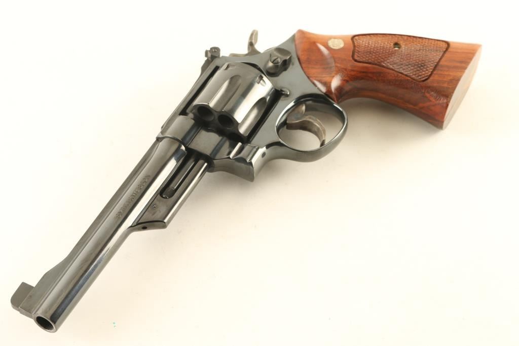 Large frame double/single action revolver features blued finish, checkered wood target grips with S&W medallions, 6.5" barrel, partridge front sight, adjustable rear sight, grooved wide trigger, checkered wide spur hammer. Bore and cylinder charge holes are excellent condition. Retains 95% blue with cylinder drag line, signs of handling and use. Action is smooth with tight lock-up. Condition is NRA Excellent *** Modern Firearm ***