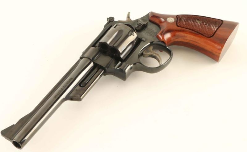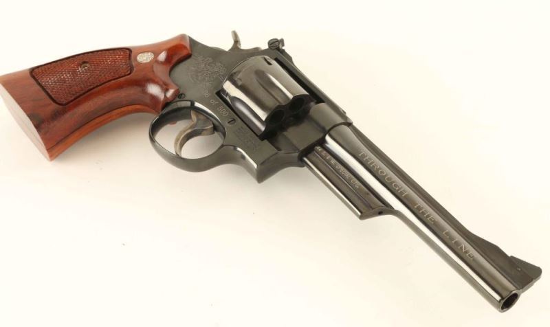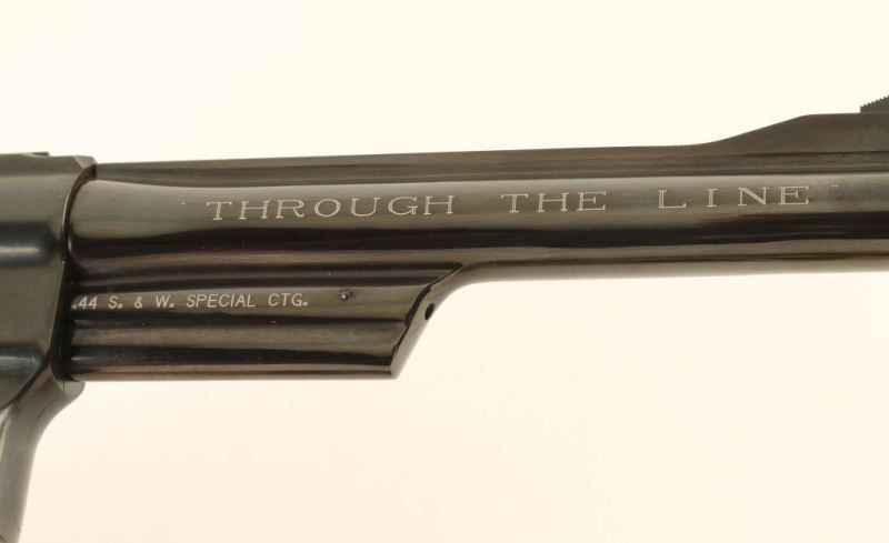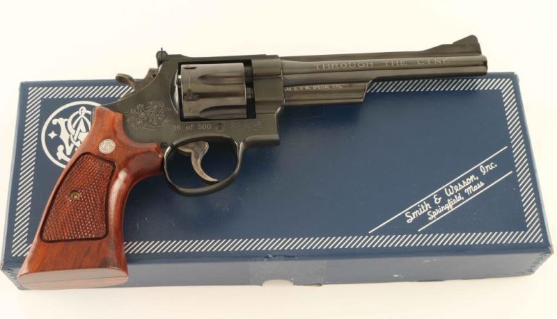 SN: BFJ4828 #36 of 500 July edition of the "Twelve Revolvers" - a limited edition Ellett Brothers exclusive where a new revolver was released each month for the year of 1990 with an action scene & title inspired by early S&W advertisers. 'The Model of 1950 .44 Special Target' Large frame double-action revolver chambered in .44 Special, manufactured circa 1990. Features a blued finish, 6 1/2" barrel with serrated sighting rib, raised ramp front sight, adjusted micrometer click rear sight, shrouded ejector rod, fluted six-shot cylinder, serrated .265" service trigger, .375" semi-target hammer, three screw square butt N target frame and two-piece checkered Goncalo Alves target grips with silver S&W medallions. Includes the original factory two-piece blued cardboard box with tool, documents, parchment paper, cleaning tools and matching label. The revolver exhibits nearly all of it's original finish showing a light drag line on the cylinder with no other observed wear. Action is smooth with tight lock-up, the bore is pristine and the wood grips are extra fine. Condition is near NRA Perfect in box. ***Modern Firearm****
