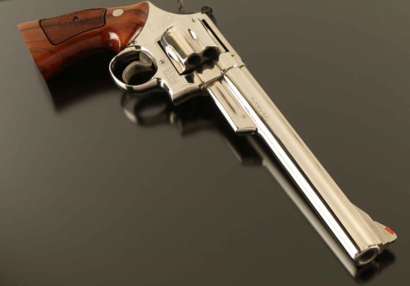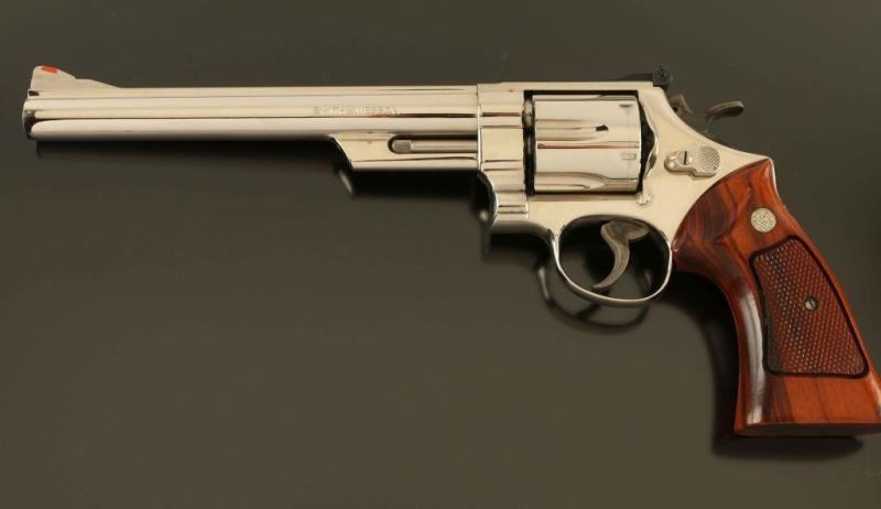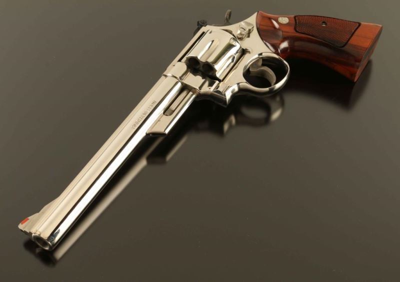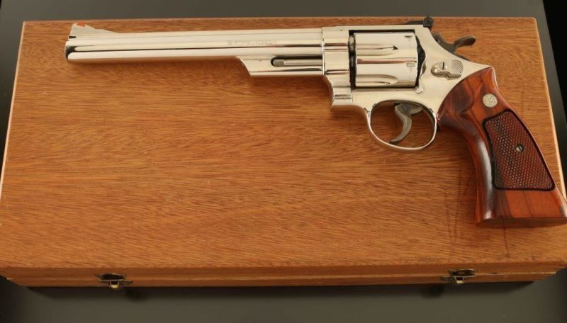 'The 1955 Model .45 Target Heavy Barrel' Large frame double action revolver chambered in .45 Colt, manufactured circa 1981. Features a bright nickel plated finish, pinned 8 3/8" heavy barrel with partially serrated wide sighting rib, raised ramped front sight with red insert, adjustable micrometer click rear sight with white outline, fluted six-shot cylinder, shrouded ejector rod, serrated .400" target trigger, .500 target hammer, three screw square butt N target frame and two-piece checkered walnut target grips with silver S&W medallions. Includes a factory wood presentation case with fitted black plastic insert, documents and paper. Revolver exhibits nearly all of it's original nickel plated finish showing a faint drag line on the cylinder and minor handling marks. Action is very smooth with tight lock-up, the bore is pristine and the wood grips are fine. Condition is near NRA Perfect in case. ***Moder Firearm***