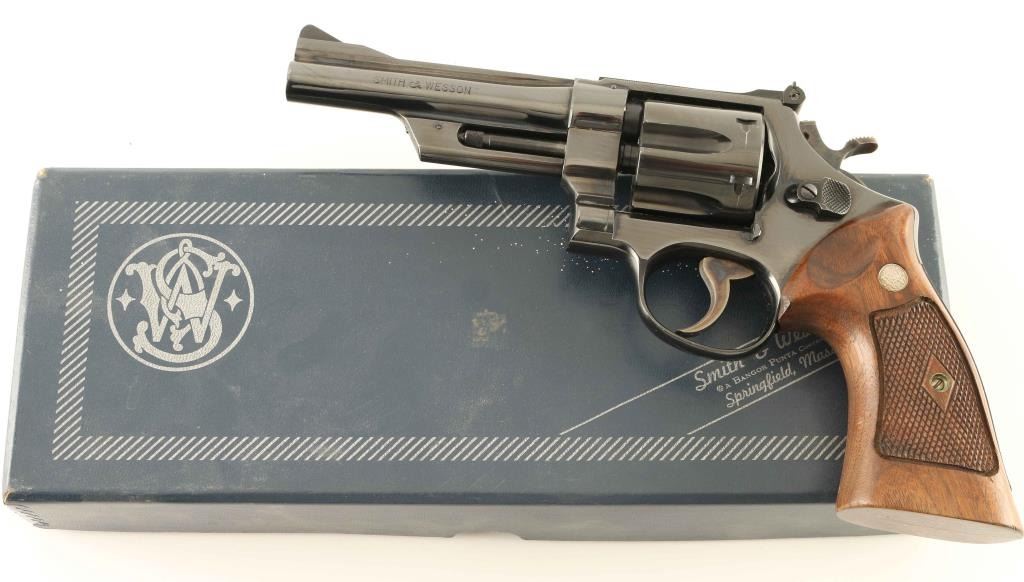 'The .357 Magnum' Large frame double action revolver chambered in .357 Magnum, manufactured circa 1961-1969. Features a blued finish, pinned 5" barrel with tapered profile & knurled sighting rib, raised serrated ramp front sight, adjustable micrometer click rear sight with white outline, fluted six-shot cylinder with counterbored chambers, shrouded ejector rod, serrated .265" service trigger, .400" semi-target hammer, three screw square butt N target frame with knurled top strap and two-piece diamond checkered walnut target grips with silver S&W medallions. Includes a factory two-piece blue cardboard box with documents and "SMITH & WESSON/.357 MAGNUM/BLUED FINISH MODEL 27/5-INCH BARREL" printed on the top half of the box. Revolver exhibits approximately 95% of it's original blued finish showing a thin drag ling on the cylinder and light scattered handling wear/scratches. Action is strong with good lock-up, the bore is pristine and the wood grips are near fine. Condition is near NRA Excellent in box. ***Modern Firearm***
