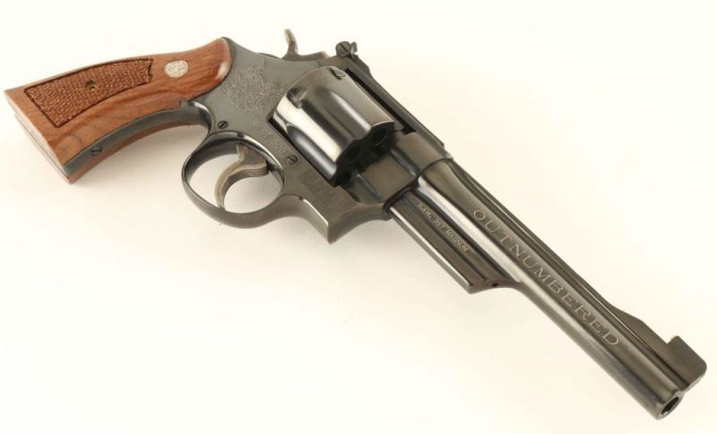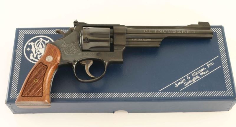 SN: BFM5190 #36 of 500 September edition of the "Twelve Revolvers" - a limited edition Ellett Brothers exclusive where a new revolver was released each month for the year of 1990 with an action scene & title inspired by early S&W advertisers. 'The .357 Magnum' Large frame double-action revolver chambered in .357 Magnum, manufactured circa 1990. Features a blued finish, 6 1/2" barrel with knurled sighting rib, raised patridge front sight with gold bead, adjusted micrometer click rear sight, shrouded ejector rod, fluted six-shot cylinder with counterbored chambers, serrated .265" service trigger, .375" semi-target hammer, three screw square butt N target frame with knurled top strap and two-piece checkered walnut Magna grips with silver S&W medallions. Includes the original factory two-piece blued cardboard box with tool, documents, parchment paper, cleaning tools and matching label. The revolver exhibits nearly all of it's original finish showing a light drag line on the cylinder with no other observed wear. Action is smooth with solid lock-up, the bore is pristine and the wood grips are extra fine. Condition is near NRA Perfect in box. ***Modern Firearm****