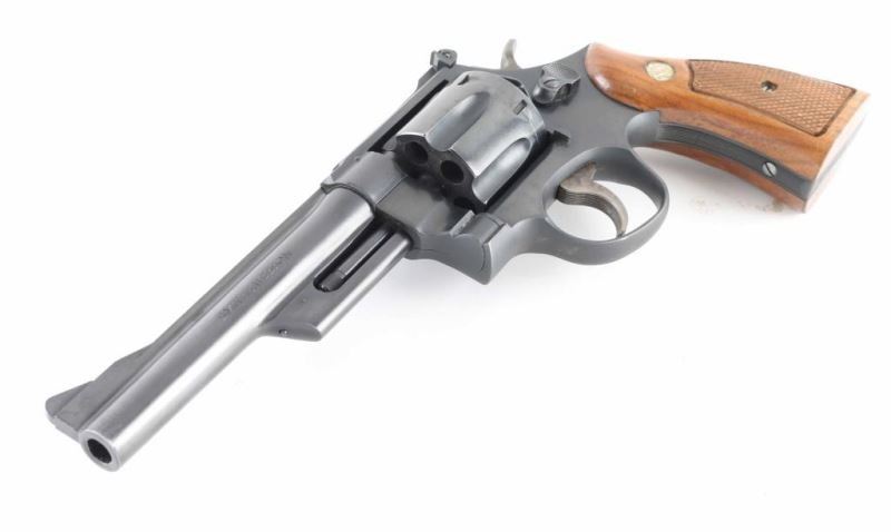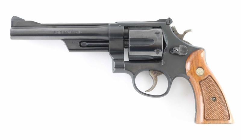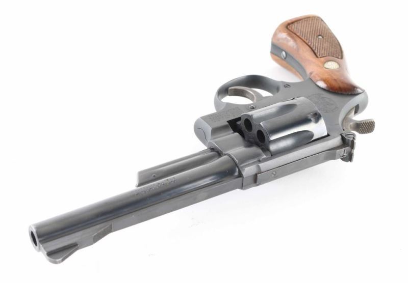 Revolver. D/A, S/A, 6-rd capacity. " The Highway Patrolman" Produced 1954 to 1986. Built on a square-butt, 5 screw N target frame. 6" non- serrated ribbed, pinned barrel. Patridge front , adjustable micrometer click rear sights. Shrouded ejector rod. Serrated backstrap and fore strap. Blued finish with case-hardened hammer and serrated trigger. Checkered walnut grips with S&W Medallions. Bore and cylinders appear excellent/bright..Action is crisp/tight. Blued finish is about 98% with some edge wear, minor scratches. The fluted cylinder has drag lines and some minor scratches. There is some slight rust around the rear sight base. Should clean up. Grips are very good. NRA Condition-Very Good. C&R firearm.