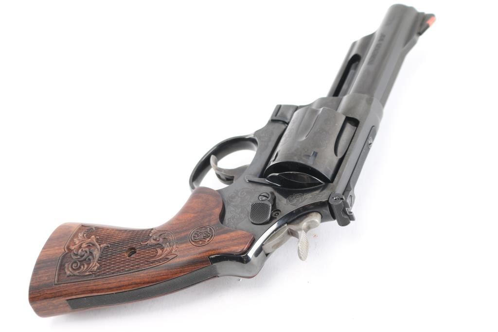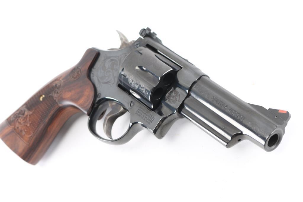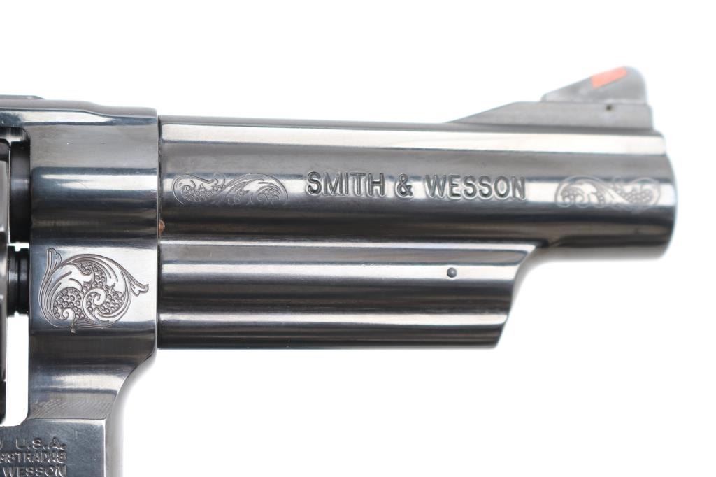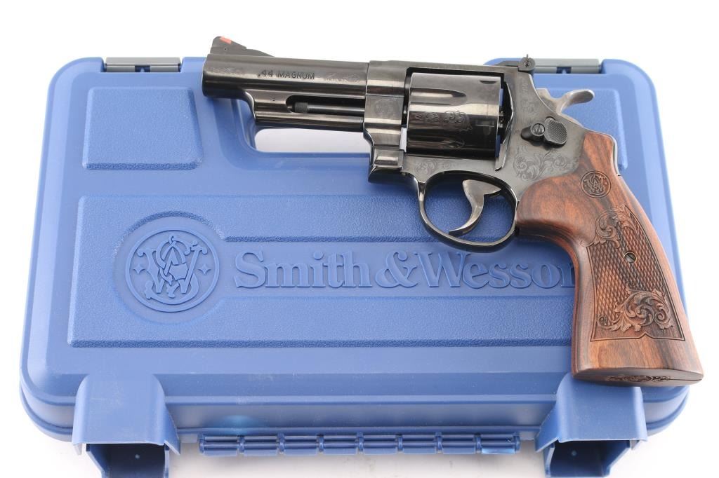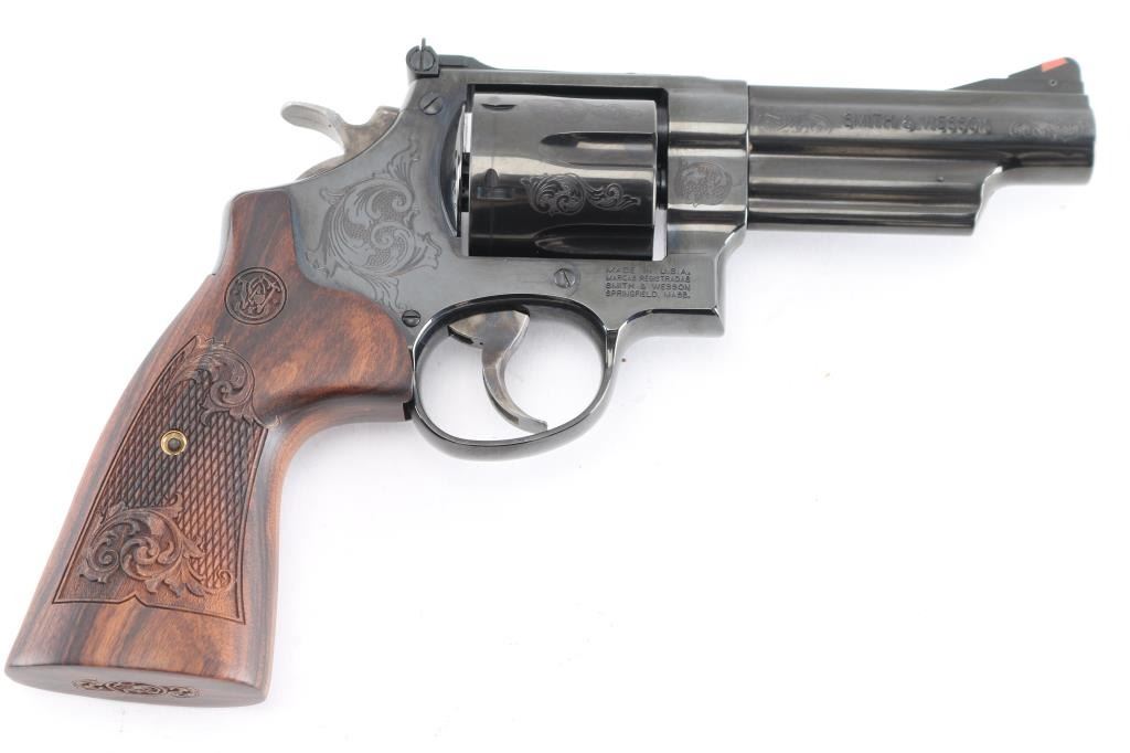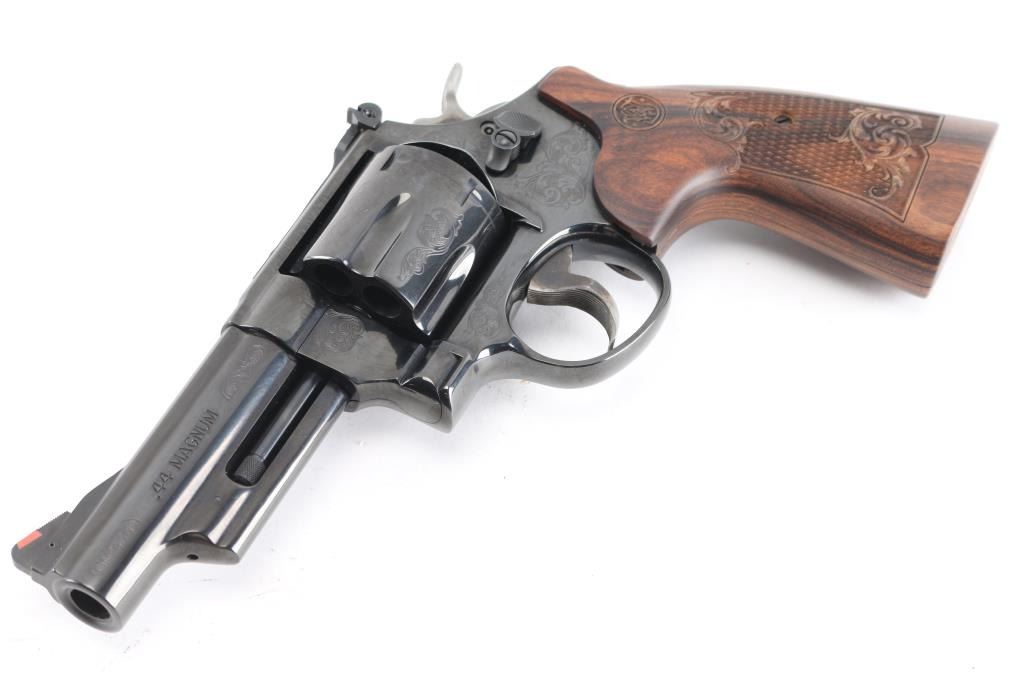 Factory engraved double action revolver chambered in .44 Magnum. Features laser scroll engraving, blued 4" barrel with serrated top rib, shrouded ejector rod, ramped front sight with red insert, adjustable micrometer click rear sight, serrated backstrap, internal lock, fluted six-shot swing out cylinder, serrated case hardened semi-target trigger, case hardened semi-target hammer with checkered spur and two piece laser engraved S&W floral scroll and checkered wood grips. Includes original factory hard case, lock, keys, manual and test fire casing. Finish shows only a faint drag line and is otherwise excellent. Action is smooth, bore is excellent and wood grips are excellent..