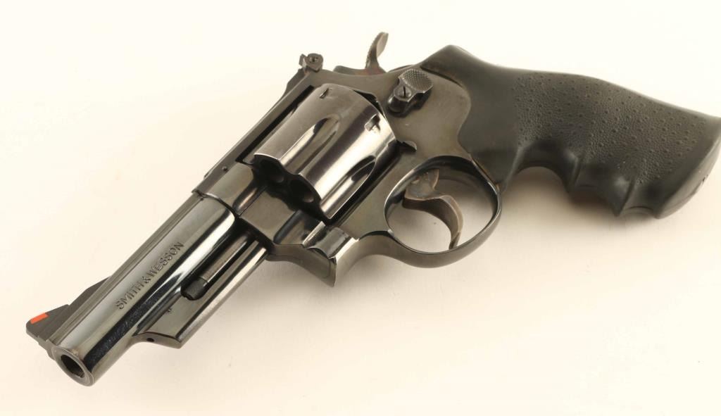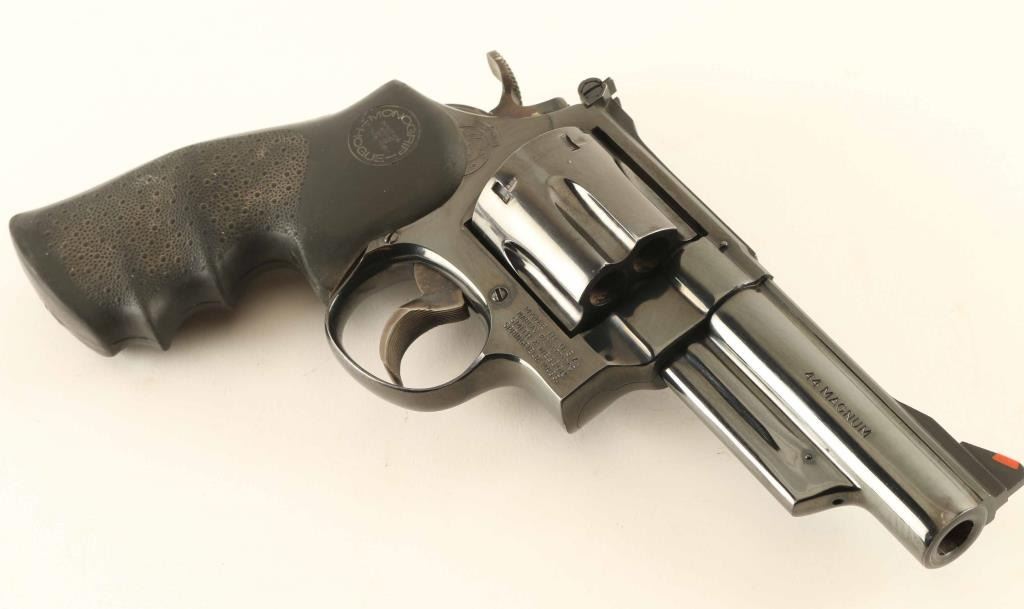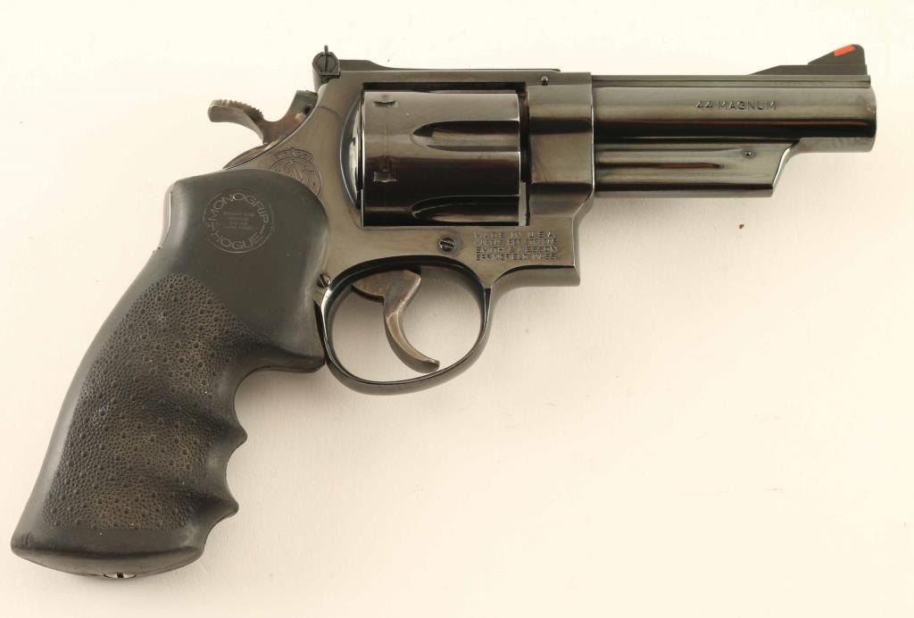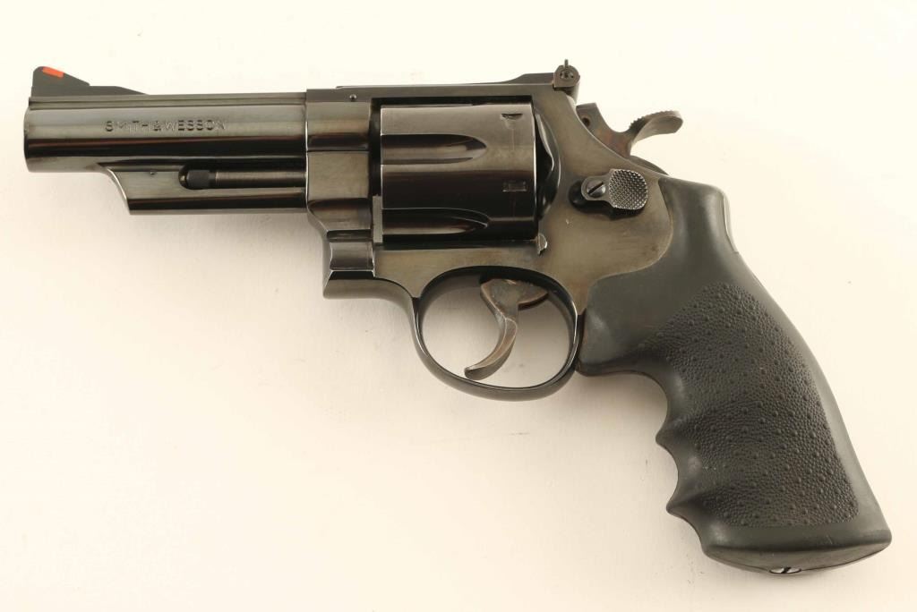'The .44 Magnum' Large frame double action revolver chambered in .44 Magnum, manufactured circa 1969-1982. Features a blued finish, pinned 4" heavy barrel with partially serrated wide sighting rib, raised serrated ramp front sight with red insert, adjustable micrometer click rear sight with white outlined square notch, fluted six-shot cylinder with counterbored chambers, shrouded ejector rod, serrated .500 target trigger, .500" target hammer, three screw square butt N target frame with ten-groove grip straps and one-piece Hogue pebbled black rubber wrap-around finger groove grip. Revolver retains approximately 95% original bluing showing holster wear, scattered scratches, and a drag line on the cylinder(which has turned plum). Action is strong with very good lock-up, the bore is pristine and the rubber grip is very good. Condition is NRA Very Good to Excellent. ***Modern Firearm***