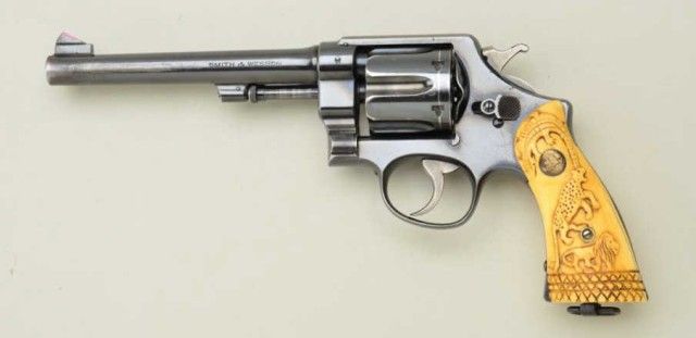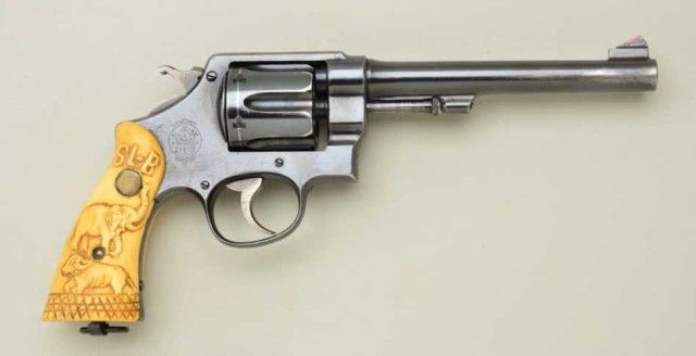Smith & Wesson 2nd Model Hand Ejector DA revolver, .45 cal., 6-1/2” barrel, crossed flags proof on back of cylinder and left front side of frame, blue finish, raised carved ivory grips with various Africanwildlife figures, lanyard ring, modified front sight, #20646. This gun is in overall very good to near fine condition showing approx. 75% original finish, very good + bore, crisp action, sharp markings andbeautifully age mellowed grips with brass medallions, left side inscribed “SLB”; right side grip also shows raised “SL-B”; would be interesting to further research this gun starting with sending for a factory letter.Est.: $750-$1,500.