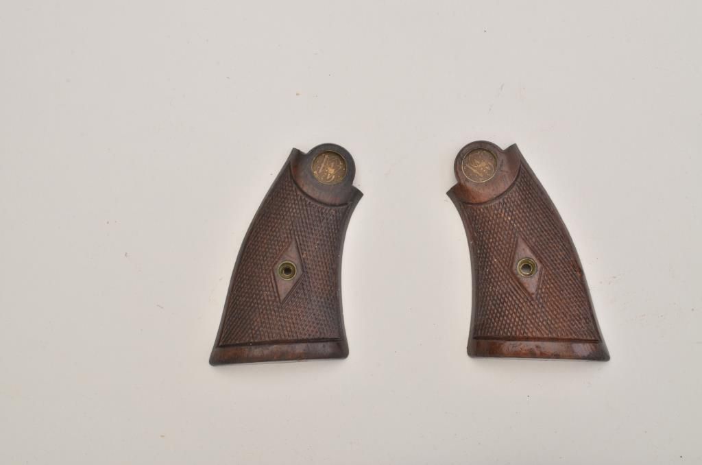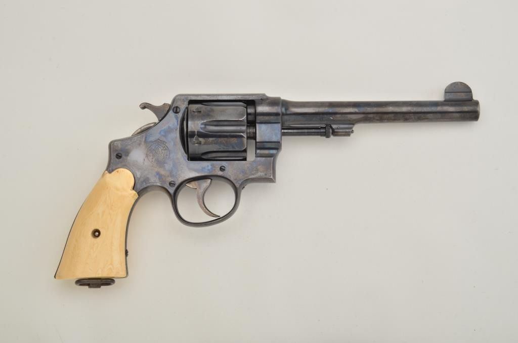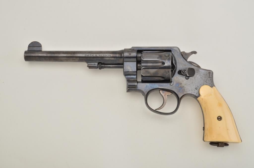 Smith & Wesson 2nd Model Hand Ejector DA revolver, .45 or .455 cal. (not marked by British proofed and gauges to .45)6-1/2” barrel, blue finish, ivory grips with extra checkered wood S&W medallion grips included,lanyard ring, #14777. This gun is in overall fine condition showing the majority of its original finish, fine bore, action, markings and grips. Est.: $400-$800.