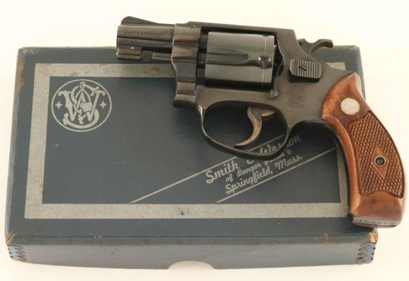 'The .38/.32 Terrier' Small frame double action revolver chambered in .38 Smith & Wesson, manufactured circa 1961. Features a blued finish, pinned 2" barrel top rib, serrated ramp front sight, square notched rear sight, non-shrouded ejector rod, fluted five-shot cylinder, serrated .240" trigger, .240" hammer, flat latched thumb piece, three screw round butt J frame and two-piece diamond checkered walnut Magna grips with silver S&W medallions. Includes a factory two-piece blue cardboard box with forced matched label, cleaning tools & documents. The revolver retains approximately 98%+ of it's original blued finish showing a light drag line on the cylinder with no other wear observed. Action is smooth with very good lock up, the bore is pristine and the wood grips are very good with blemishes. Condition is NRA Excellent in box. ***C&R Firearm****