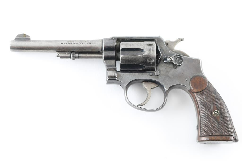 SN: 34943 'Model of 1905' Double action revolver manufactured circa 1906-1907. Features 5" barrel, half moon fixed front sight (modified with addition of small brass bead), fixed rear sight (modified with addition of fixed flat leaf with round sighting notch), fluted 6 shot cylinder swings out to load & unload, K frame square butt, blued finish, checkered wood grips. Bore is very good condition with a hint of frosting throughout. Charge holes appear smooth. Retains 20% finish, most retained dark bluing on frame and in cylinder flutes, barrel and backstraps mostly bare metal, fading and patina on sides of frame. Some small dents & dings. Grips are very good condition with some smoothing from handling. Numbers on barrel & cylinder match frame. Action is smooth with tight lock up. Condition is NRA Good++ *** C&R Firearm ***