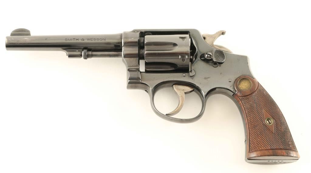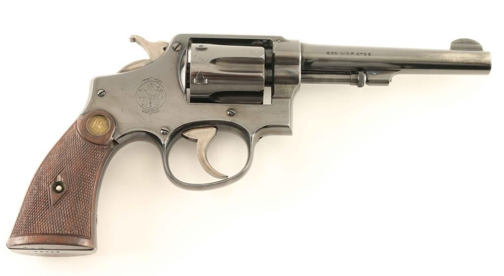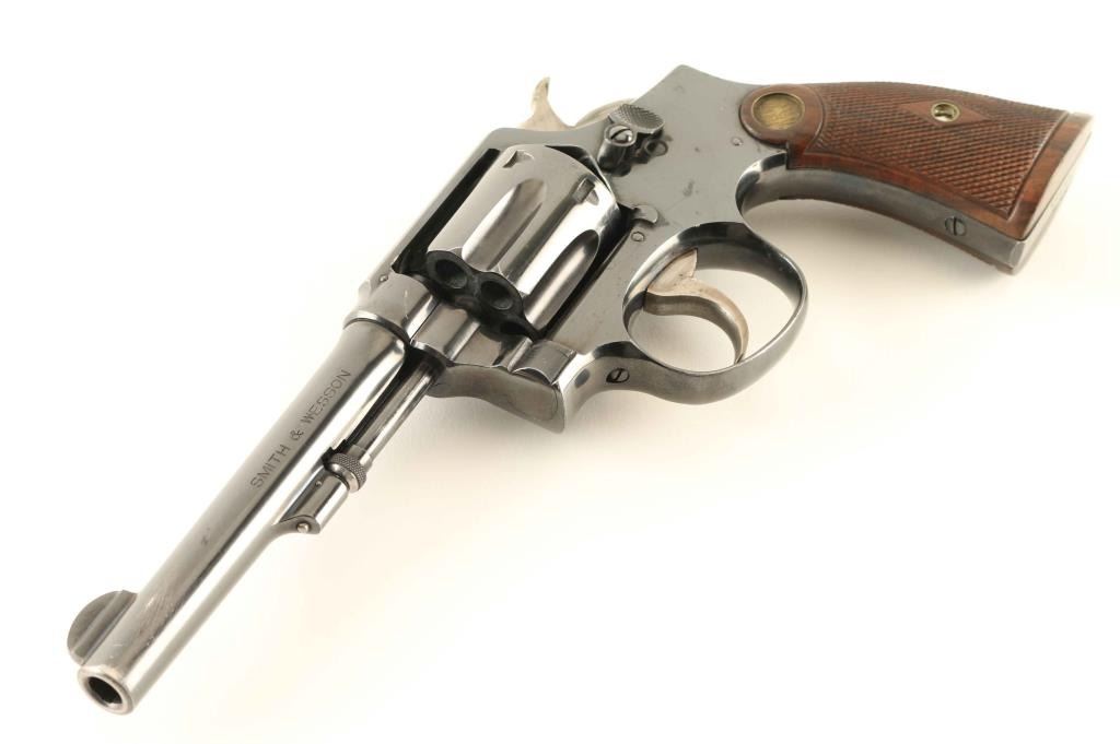 'Model of 1905, 4th Change' Vintage medium frame double action revolver chambered in .32-20 Winchester, manufactured circa 1915-1940. Features a blued finish, pinned 5" barrel, forged round blade front sight, 'u' notched rear sight, non-shrouded ejector rod, fluted six-shot cylinder, smooth .265" trigger, .265" hammer with knurled spur, five screw square butt K frame and two-piece diamond checkered walnut grips with brass S&W medallions. Revolver retains approximately 85% of it's original finish showing muzzle wear, some scattered oxidation/pin prick pitting and 'cleaning' on the sides of the barrel, backstrap & top of the frame. Action is smooth with good lock-up, the bore is pristine and the wood grips are good with small losses on the right panel. Condition is NRA Good++. ***C&R Firearm***