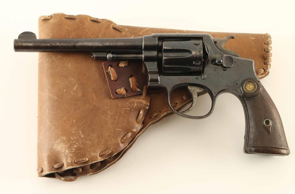 'Model of 1905, 4th Change' Vintage medium frame double action revolver chambered in .32 W.C.F, manufactured circa 1915-1940. Features a blued finish, pinned 6" barrel with forged round blade front sight, 'u' notched rear sight, non-shrouded ejector rod, fluted six-shot cylinder, case hardened .265" smooth trigger, case hardened .265" hammer with knurled spur, five screw square butt K service frame and two-piece diamond checkered walnut grips with brass S&W medallions. Includes a primitive leather holster. Revolver exhibits approximately 60% of it's original blued finish showing holster wear with some pin prick pitting and light surface rust. Action is smooth with good lock-up, the bore is bright with some moderately deep pitting, and wood grips are fair with wear. Condition is near NRA Good. ***C&R Firearm***