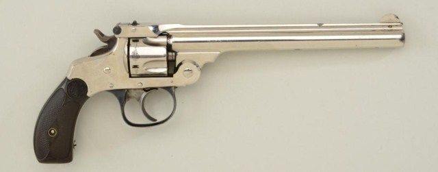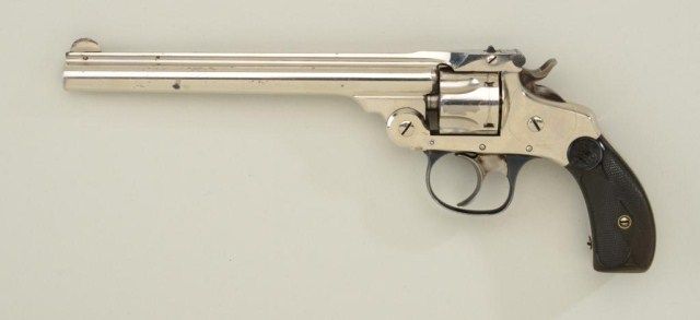 Smith & Wesson .32 DA 4th Model revolver, .32 cal., 6” barrel, nickel finish, checkered black hard rubber grips, #187001. This gun is in overall fine to excellent condition showing the majority of its original finishwith a couple spots of erosion on the barrel assembly, fine bore, action, markings and grips; desirable in the 6” barrel variation. Formerly in the Dr. John Hall collection, founding member of the S & W Collector’sAssoc. Est.: $350-$700.