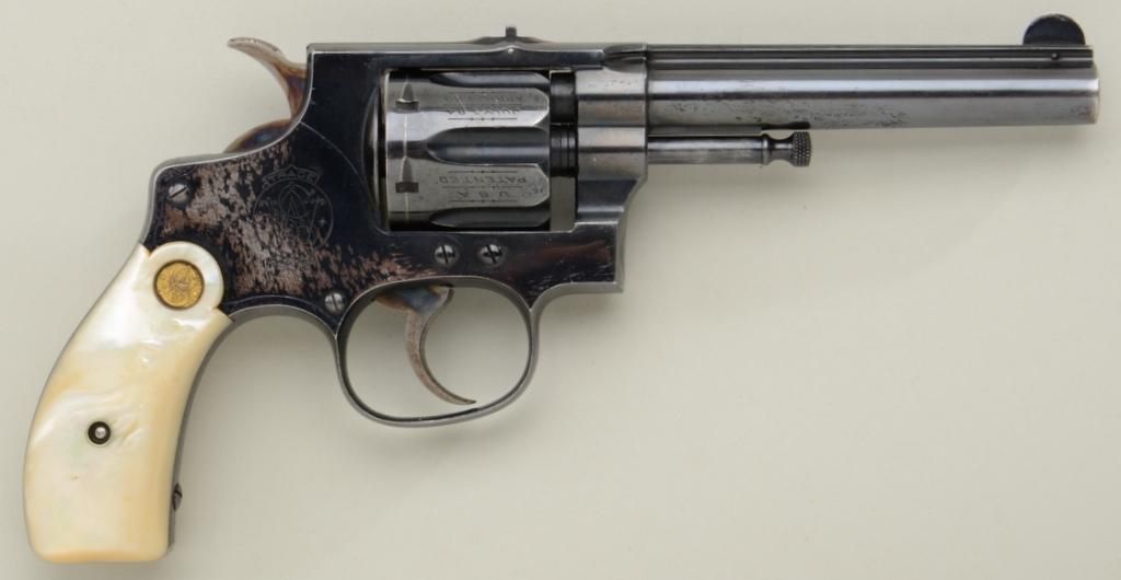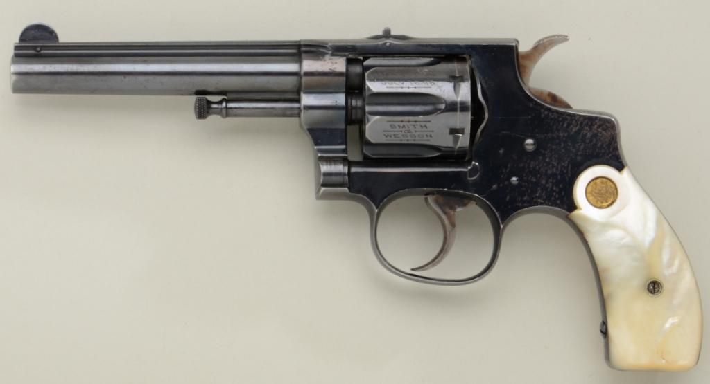 Smith & Wesson .32 Hand Ejector First Model DA revolver, .32 cal., 4-1/4” barrel, blue finish, gold medallion pearl grips, #2768. This gun is in overall fine + condition showing approx. 85% original blue finish,very good to fine bore, crisp action and markings including patent markings on cylinder; beautiful iridescent pearl grips with majority of original case colors remaining on hammer and trigger; less than20,000 manufactured of this model and a very desirable variation of the hand ejector Smith & Wesson. From the Dr. John Hall Collection. Est.: $500-$1,000.