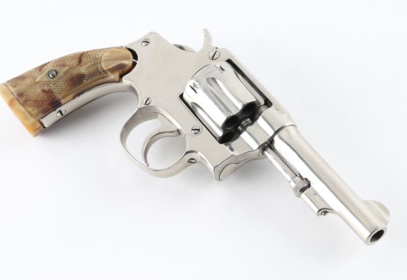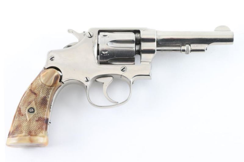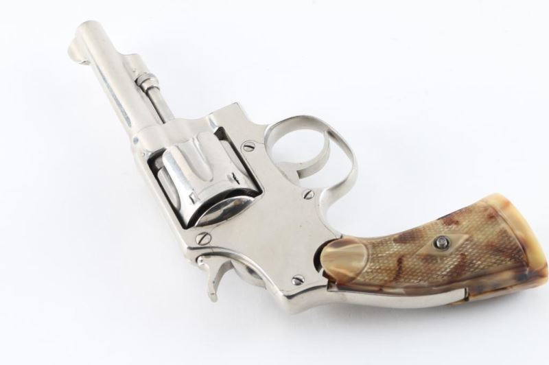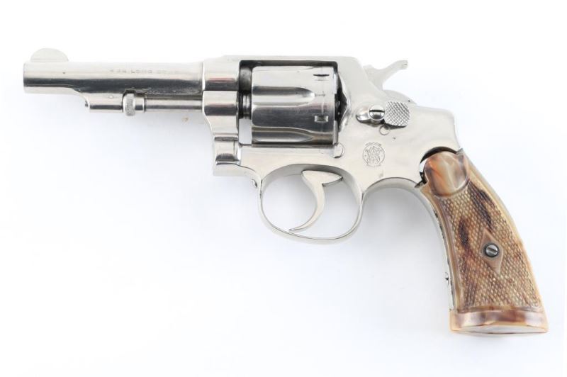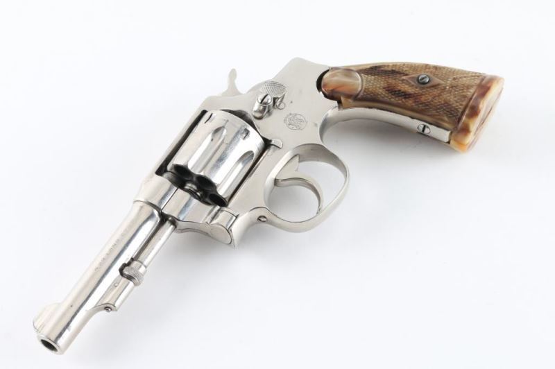Revolver. D/S Action. 6-rd Capacity. 'Model of 1903, 1st Change'. Manufactured 1904-1906. Built on the round butt I frame. 3 1/2" tapered, pinned barrel. (May have been shortened,Fixed blade/notch sights. Nickel finish, appears to have been refinished. Franzite marked grips. grips. 2-line patent dates on top of barrel. ".32 Long Ctg. On left barrel. Small S&W trademark on left side of frame. Serial number matches on heel, cylinder. Bore/cylinders appear very good/bright. Action is crisp/tight. Nickel re-finish is about 90%, with scratches. Grips have some shrinkage at the tops of the panels. NRA Condition-Good/Re-Finished. C&R firearm.