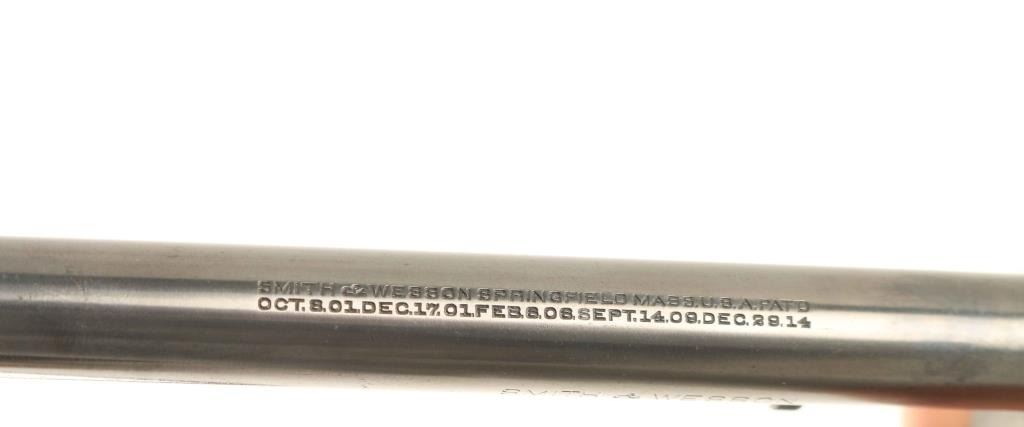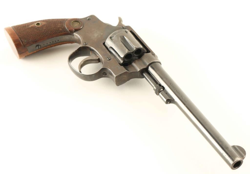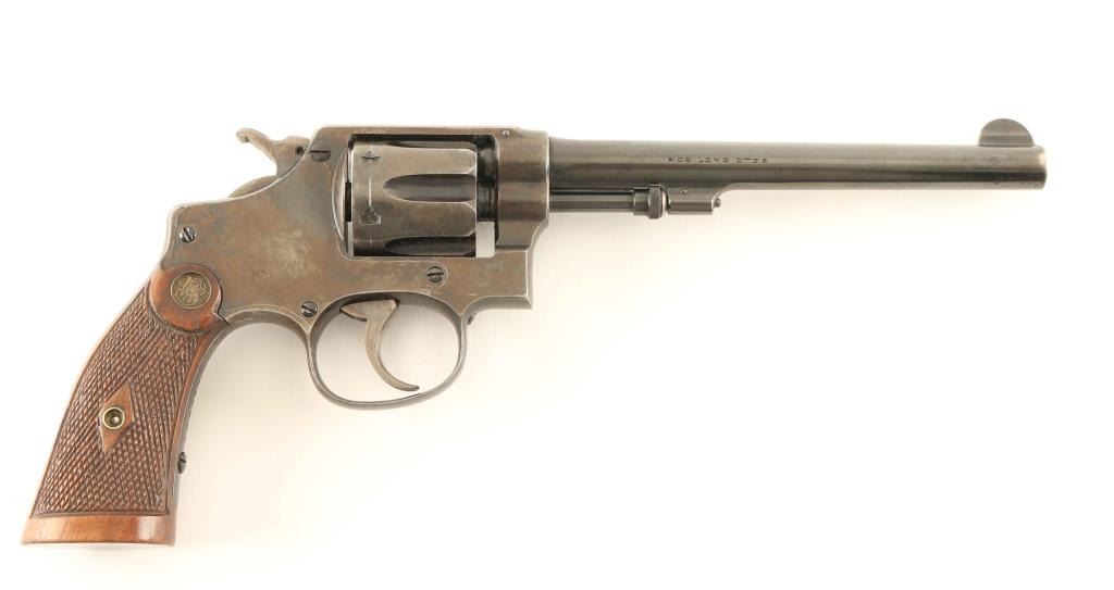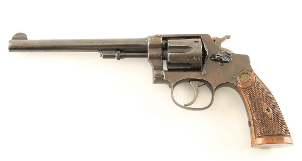 SN: 296266 Vintage small frame double action revolver chambered in .32 Smith & Wesson Long, manufactured circa 1917-1942. Features a blued finish, pinned 6" barrel, forged round blade front sight, 'u' notched rear sight, fluted six-shot cylinder, non-shrouded ejector rod, smooth .235" trigger, .235" hammer with knurled spur, five screw round butt I frame and two-piece diamond checkered walnut grips with brass S&W medallions & "PAT. JUNE 5. 1917" patent date stamped into the butt of the left panel. Revolver exhibits approximately 40% of it's original finish with the majority of the bluing retained on the barrel(shows some pin prick pitting & surface rust towards the muzzle) while the frame & cylinder display a browned patina with scattered splotches of blued finish. Action is smooth with good lock-up, the bore is mirror bright with some scattered rust & pitting and the matching wood grips are good with some imperfections. Condition is NRA Good. ***C&R Firearm***