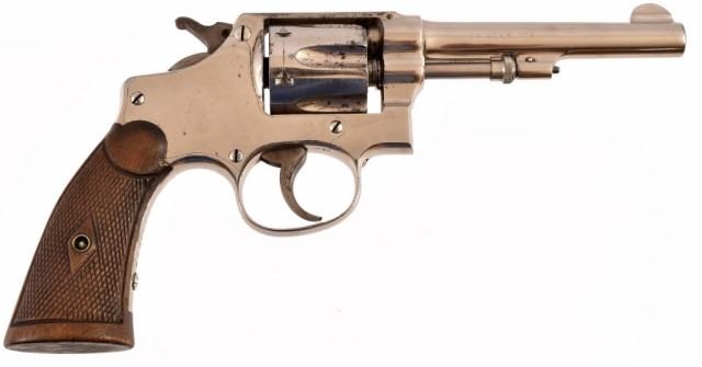 * S&W Regulation Police .32 long. Nickel finish, 4.25" barrel, checkered walnut grips. Serial #323771