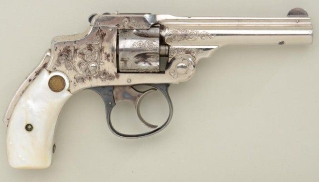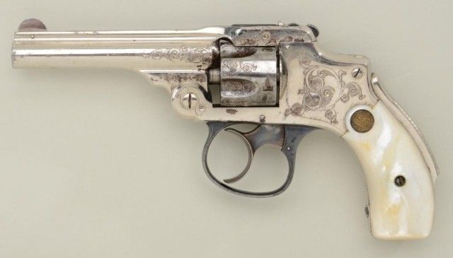 Smith & Wesson 32 Safety First Model DA revolver, .32 cal., 3-1/2” barrel, nickel finish, gold medallion pearl grips, #60377. This gun is in overall very good to fine condition showing approx. 70% original nickel finish, period engraving appears factory but gun has not been lettered ; good bore, crisp action, very good markings, fine iridescent pearl grips with S&W gold medallions; all matching visible serial numbers. From the Dr. John Hall Collection. Est.: $500-$1,000.