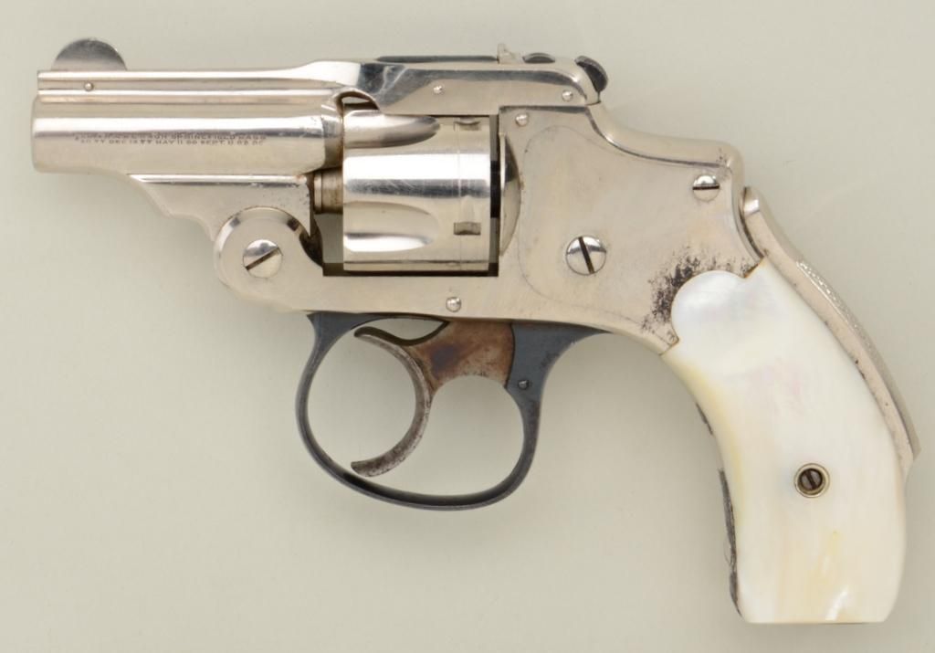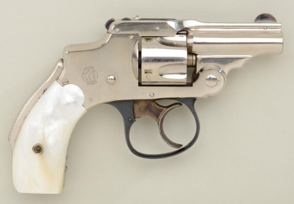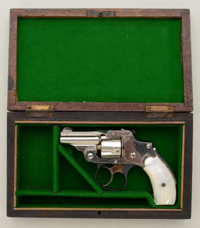 Smith & Wesson .32 Safety Hammerless “Bicycle” Model DA revolver, .32 cal., 2” barrel, nickel finish, pearl grips, #87798, accompanied by a wood case with re-lined green interior and compartments for the gun,a box of cartridges, key and cleaning rod, likely English in manufacture (no cartridges, key or cleaning rod). Accompanying the gun is a letter on Cheshire Constabulary letterhead from a David Astbury indicatingthe gun came from the estate of Lady Mary Grosvenor, Aunt to the Duke of Westminster. The letter continues to state the Grosvenor family was one of the most wealthy and influential families in the United Kingdom.Mr. Astbury acquired the gun from a firearms dealer in Chester. The gun is in overall very good to fine condition showing the majority of its original finish with some spots of lifting and wear, very good bore, crispaction, sharp markings and fine iridescent pearl grips; also included is an International Police Association business card from Mr. Astbury. Case is overall good with aforementioned relining. A neat little