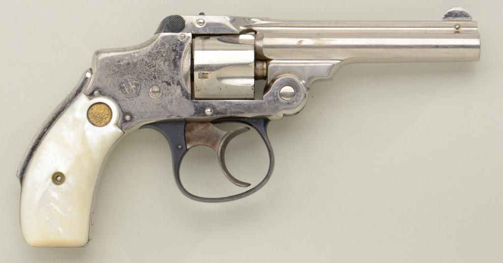 Smith & Wesson .32 Safety Hammerless DA revolver, .32 S&W cal., 3-1/2” barrel, nickel finish, gold medallion iridescent pearl grips, #172771 (all matching visible serial numbers). This gun is in overall very good to almost fine condition with approx. 90% original finish, with most of loss on right side of frame in for of pin prick erosion that is light but still noticeable; good bore, crisp action, sharp markings, finegrips with considerable case colors on the trigger. From the Dr. John Hall Collection. Est.: $300-$600.
