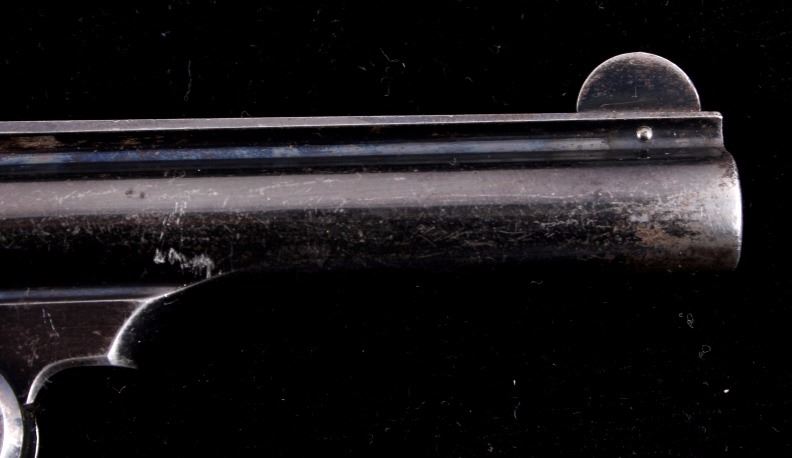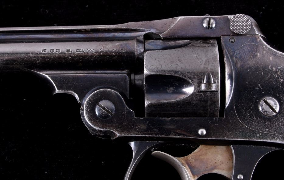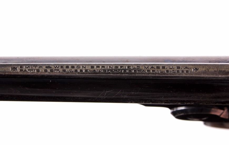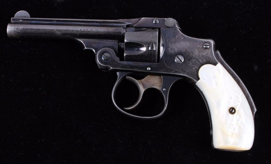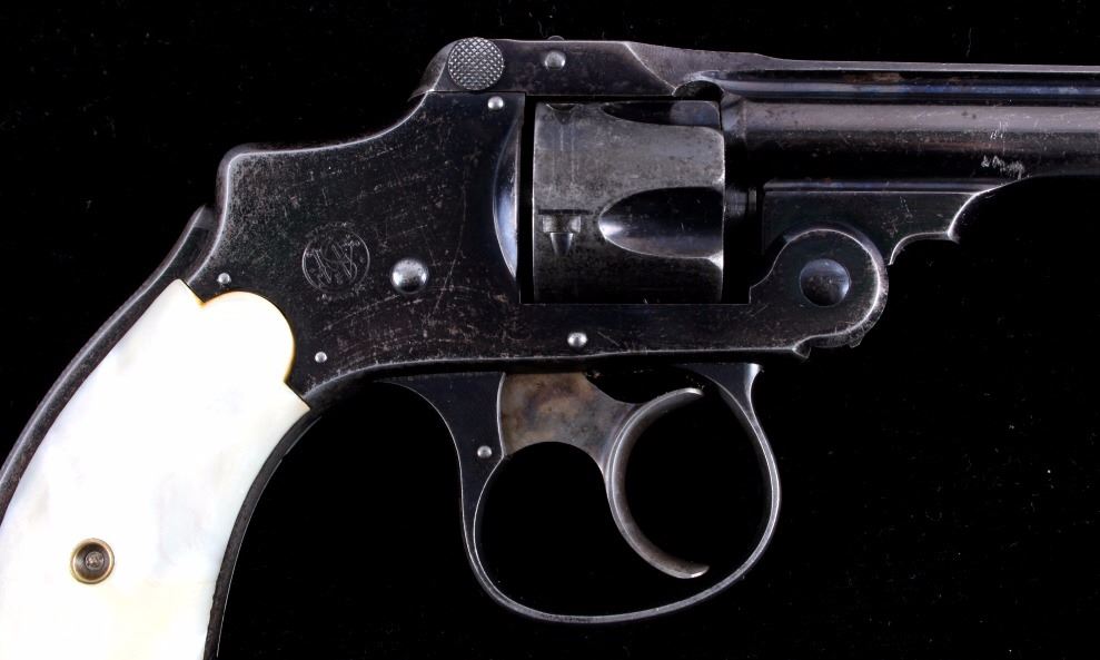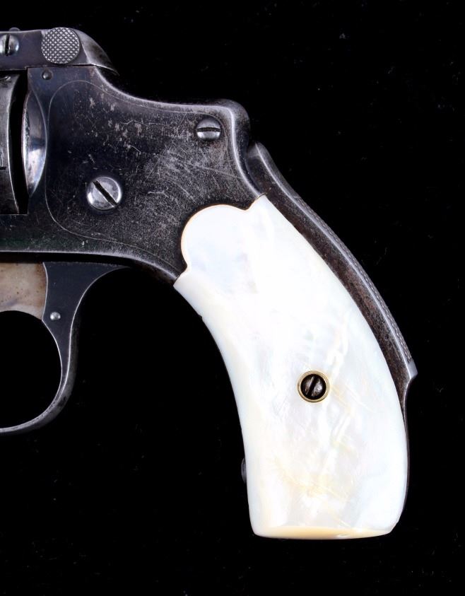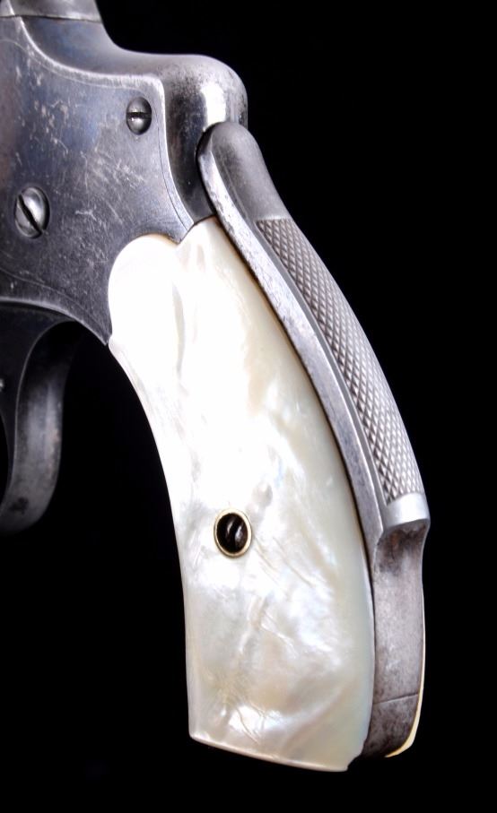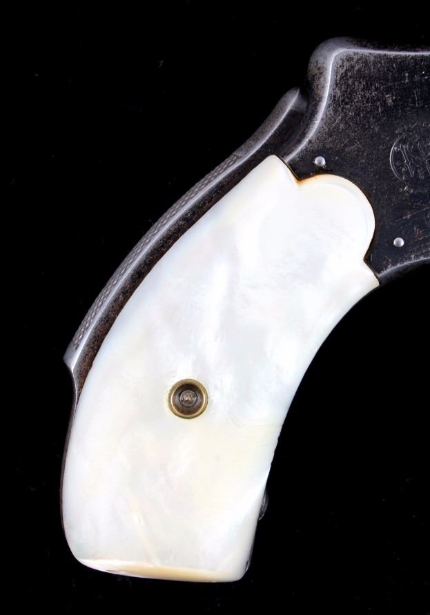 This is a Smith & Wesson 2nd Model Safety Hammerless "Lemon Squeezer" revolver chambered in .32 caliber. The revolver shows a blued frame, cylinder and 3.5" barrel with mother of pearl grips. The barrel is marked "32 S.& W. CTG". The Safety Hammerless is nicknamed the "Lemon Squeezer" because the safety must be squeezed in order to fire the gun. The Smith & Wesson Safety Hammerless revolver is in good condition and has retained much of the original blued finish. It measures 7.25" with a 3.5" barrel. Serial number is 162824. This is a modern manufactured handgun made after 1899 and requires NICS background check, Curio & Relic FFL or FFL transfer.