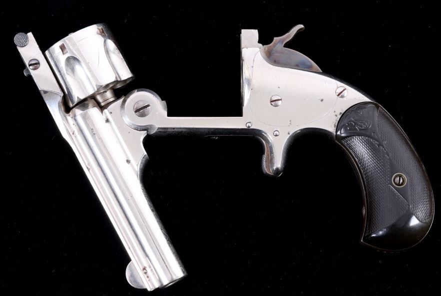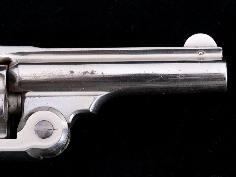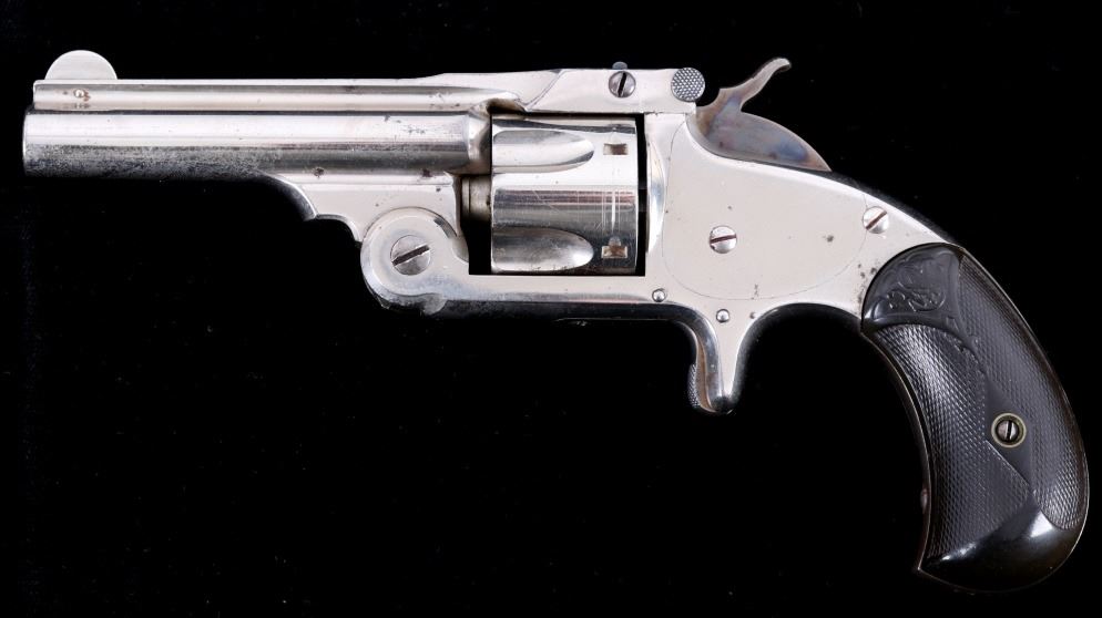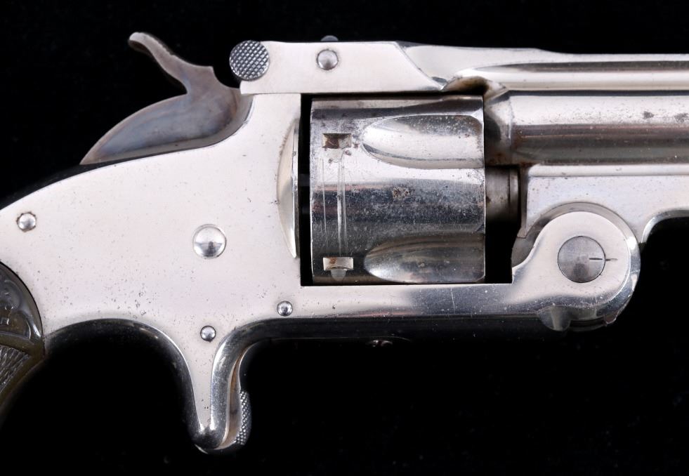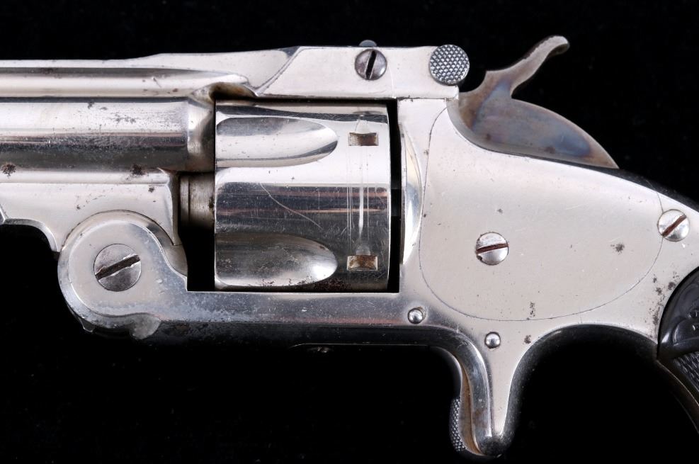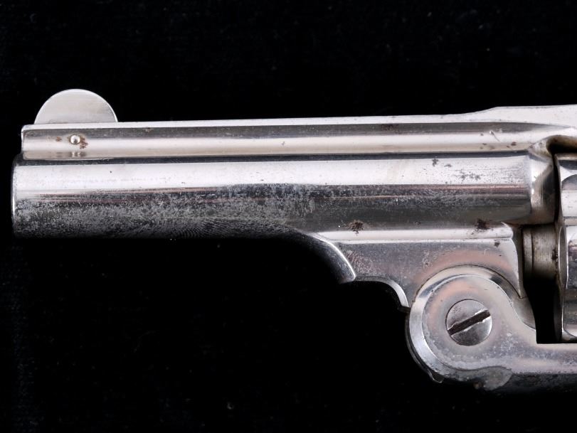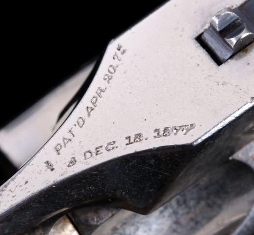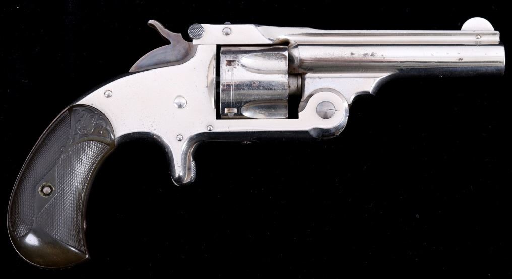 Offered for bidding in this lot is a Smith & Wesson Single-Action revolver, chambered for .32 Caliber. The revolver features a nickel finished steel frame, 5-shot cylinder, 3" barrel, and factory S&W monogram hard rubber grips. The top of the barrel is marked "Smith & Wesson Springfield Mass. U.S.A. PAT'D JAN. 17& 24. 65 - JULY 11. 65. AUG. 24. 69. FEB. 20. 1877. REISSUE JULY 25. 1871", and is additionally marked on the top of the barrel "PAT'D APR. 20. 75. - & DEC. 18. 1877". Lastly, the pistol is marked on the butt of the grip, back of the cylinder, and bottom of the top-break lever with the serial number. The revolver qualifies as an Antique Hand Gun, and does NOT require FFL Transfer or NICS Background Check. Serial Number: 43021.
