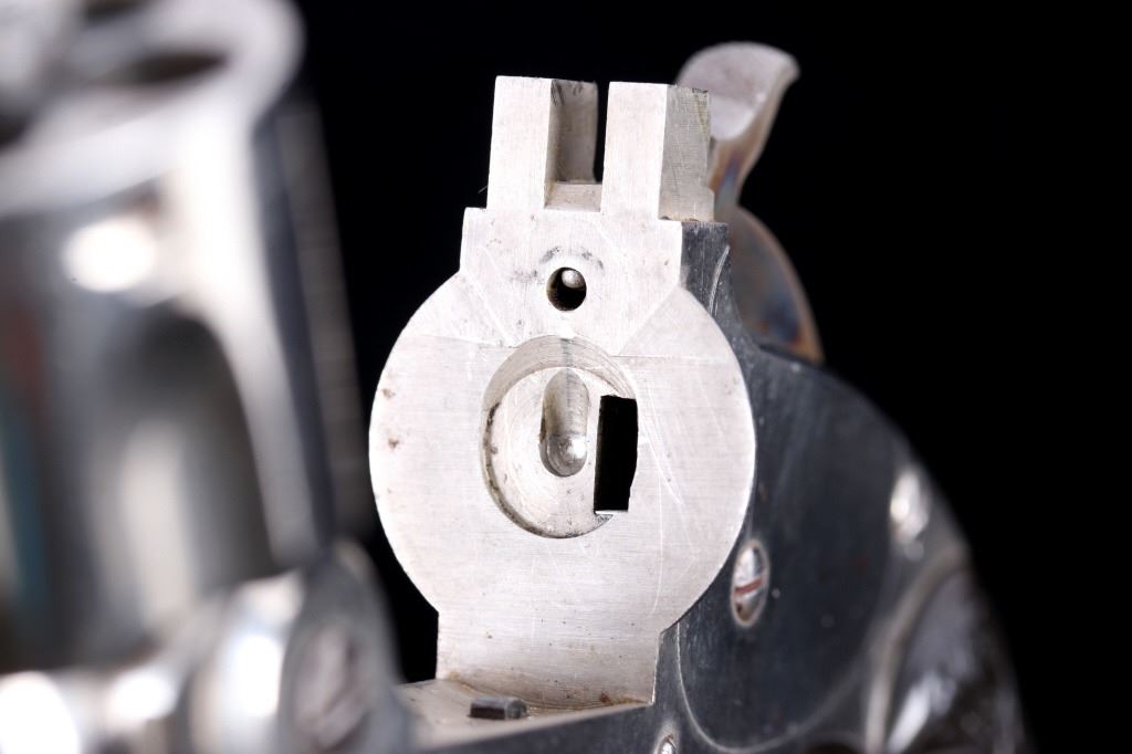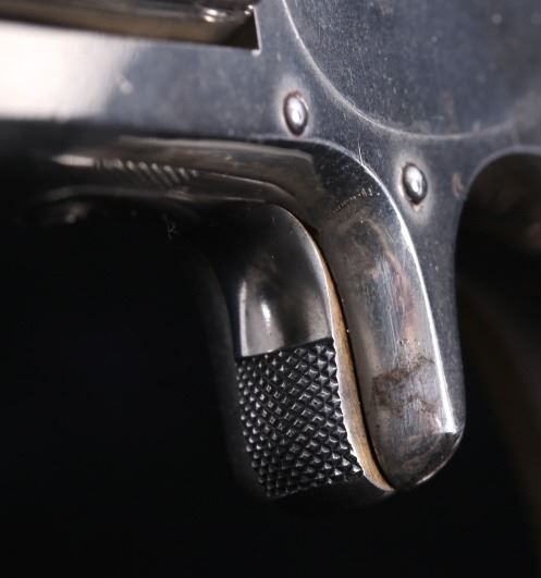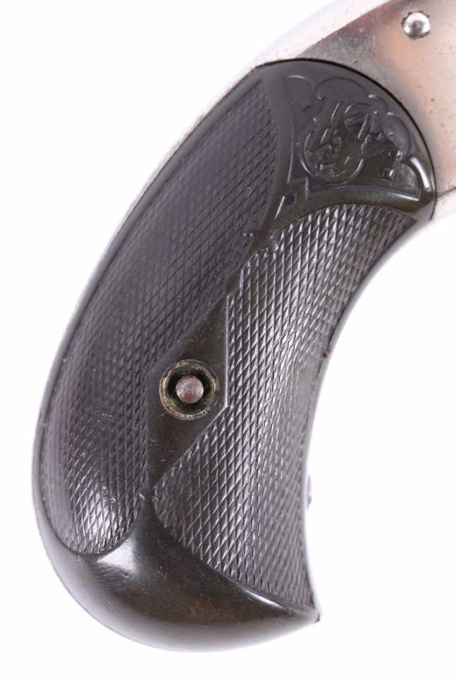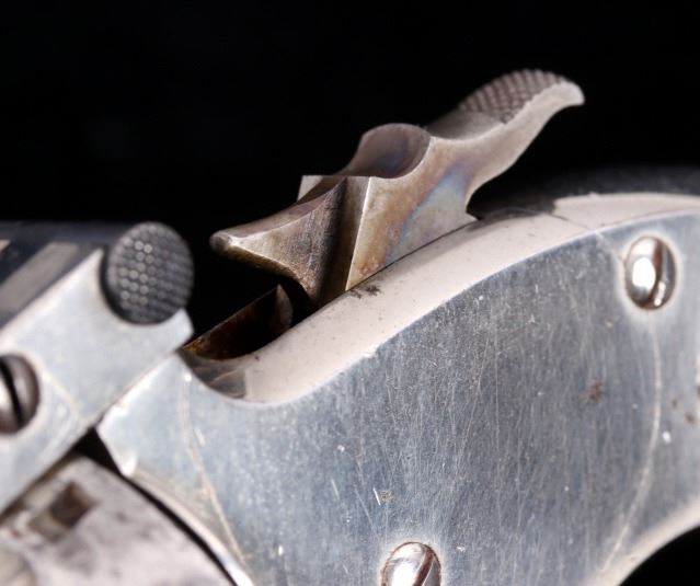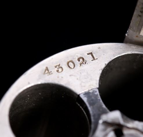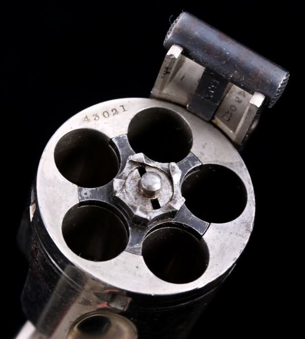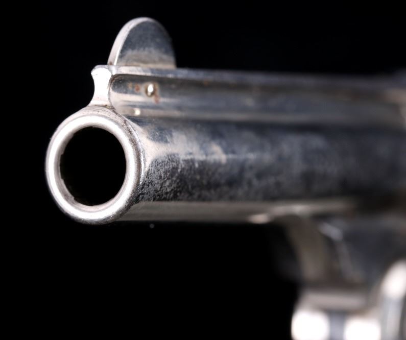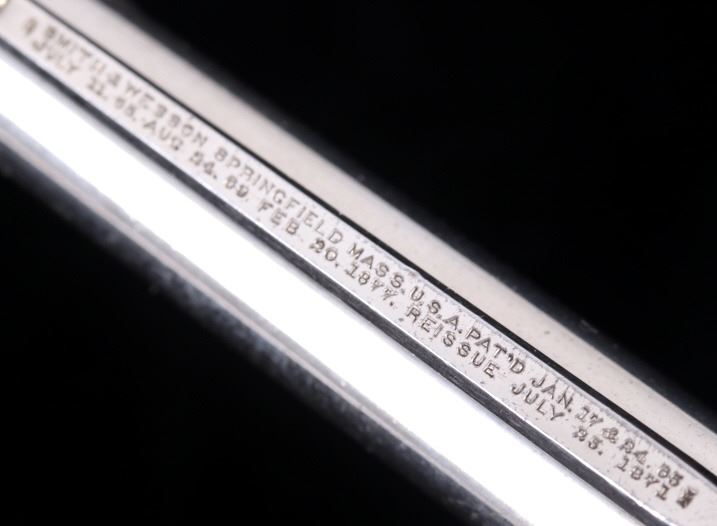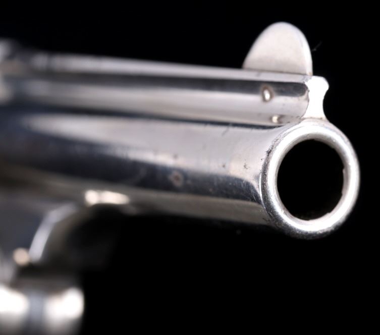 Offered for bidding in this lot is a Smith & Wesson Single-Action revolver, chambered for .32 Caliber. The revolver features a nickel finished steel frame, 5-shot cylinder, 3" barrel, and factory S&W monogram hard rubber grips. The top of the barrel is marked "Smith & Wesson Springfield Mass. U.S.A. PAT'D JAN. 17& 24. 65 - JULY 11. 65. AUG. 24. 69. FEB. 20. 1877. REISSUE JULY 25. 1871", and is additionally marked on the top of the barrel "PAT'D APR. 20. 75. - & DEC. 18. 1877". Lastly, the pistol is marked on the butt of the grip, back of the cylinder, and bottom of the top-break lever with the serial number. The revolver qualifies as an Antique Hand Gun, and does NOT require FFL Transfer or NICS Background Check. Serial Number: 43021.