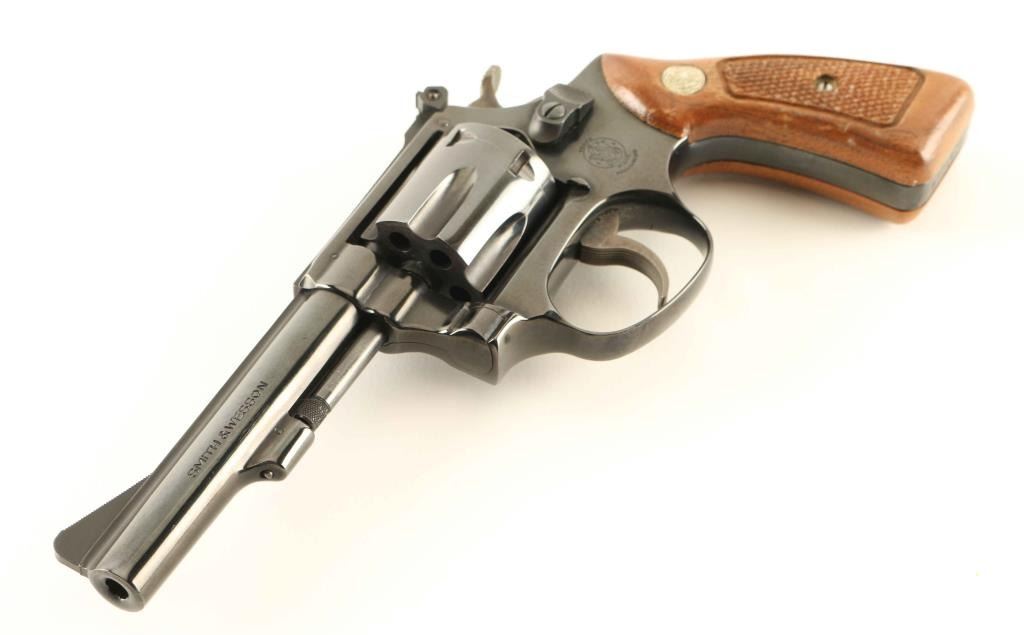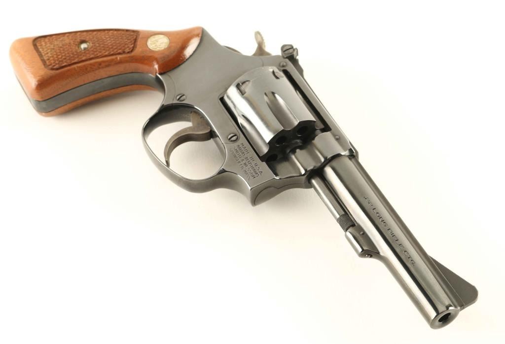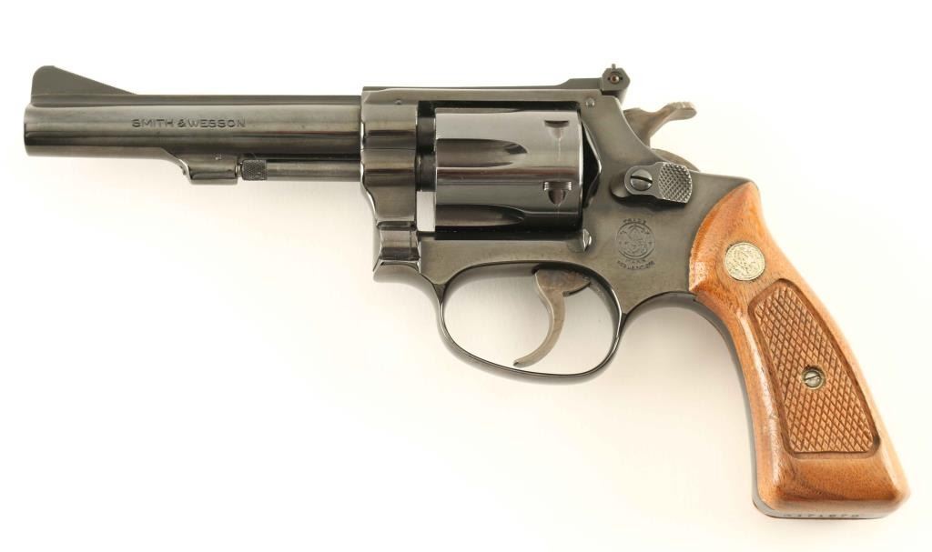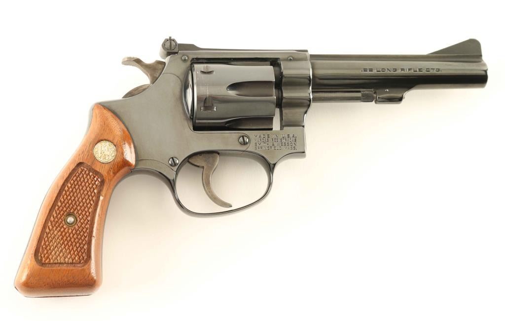 'The Model of 1953 .22/.32 Kit Gun' Small frame double action revolver chambered in .22 Long Rifle, manufactured circa 1969-1982. Features a blued finish, pinned 4" barrel with partially serrated narrow sighting rib, serrated ramp front sight, adjustable micrometer click rear sight, fluted six-shot cylinder with counterbored chambers, non-shrouded ejector rod, .240" serrated trigger, .375" semi-target hammer, three screw square butt J frame and two-piece checkered walnut Magna grips with silver S&W medallions. Revolver exhibits approximately 98% of it's original blued finish showing a drag line on the cylinder(which has turned slightly plum), minor edge wear and some superficial handling wear. Action performs well thought when cocking the hammer for single action fire there is a slight 'wall' before the hammer locks into the cocked position, lock-up is good, the bore is excellent and the wood grips are very good. Condition is NRA Excellent . ***Modern Firearm***