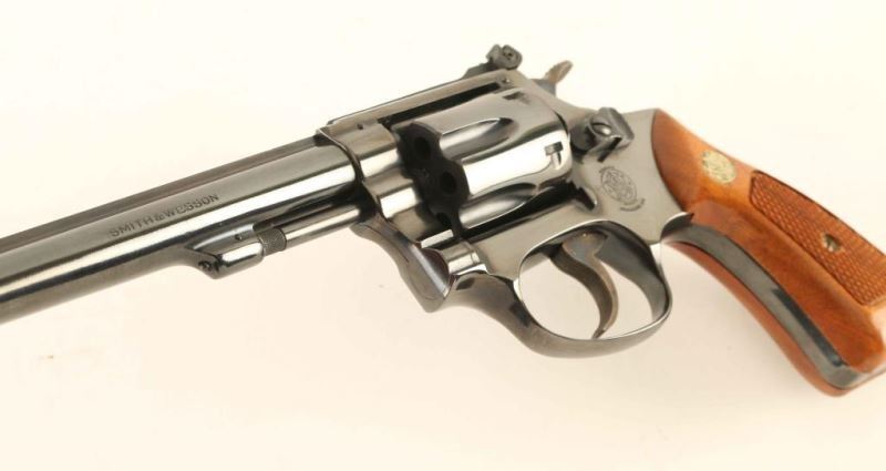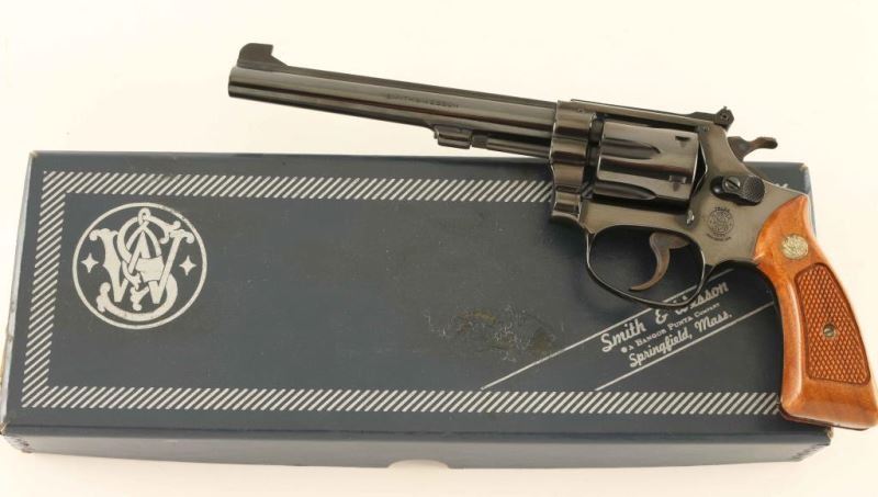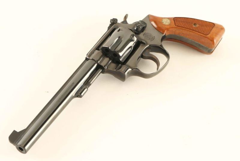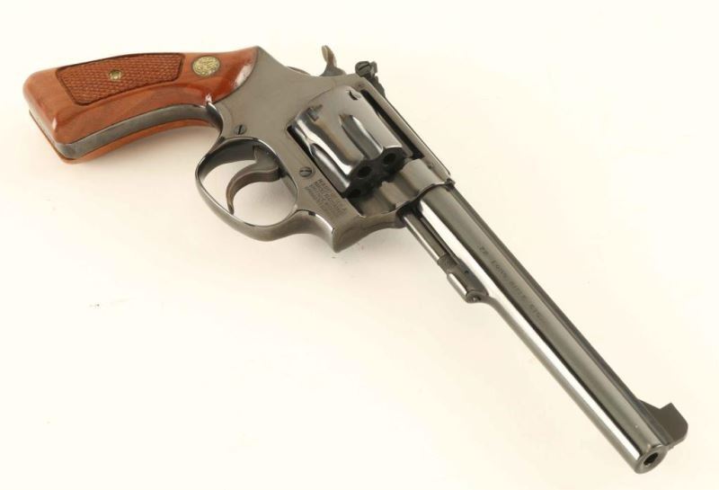 'The Model of 1953 .22/.32 Target' Small frame double action revolver chambered in 22 long rifle, manufactured circa 1972. Features a blued finish, pinned 6" barrel with partially serrated narrow rib, patridge front sight, adjustable micrometer click rear sight, non-shrouded ejector rod, fluted six-shot cylinder with counterbored chambers, serrated .240" trigger, .375" semi target hammer, three screw round butt J target frame and two-piece checkered walnut Magna grips with silver S&W medallions. Includes the original factory two-piece blue cardboard box with documents, screwdriver, cleaning tools, parchment paper and correct label. Revolver retains approximately 97% of its original blued finish showing a faint drag line on the cylinder and light scattered handling marks/wear. Action is smooth with tight lock-up, the bore is excellent and the wood grips are extra fine. Condition is NRA Excellent in box. ***Modern Firearm****