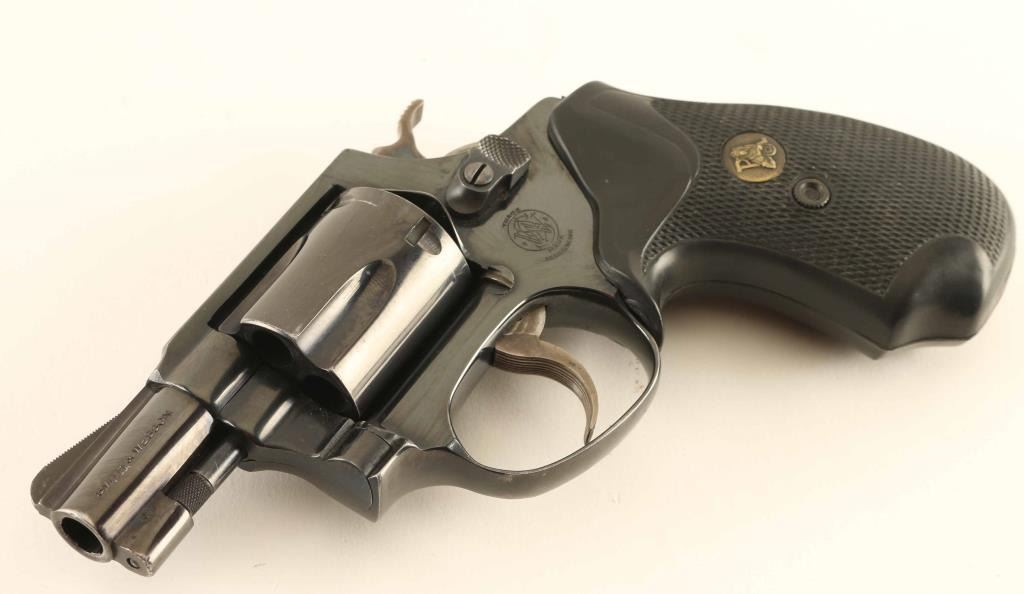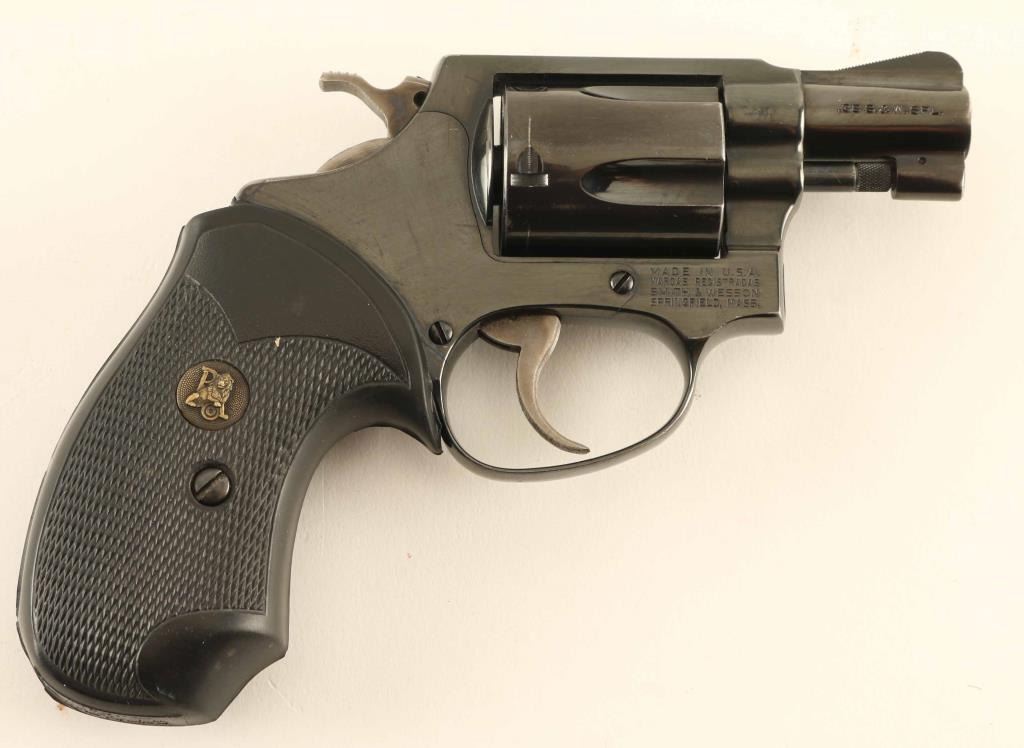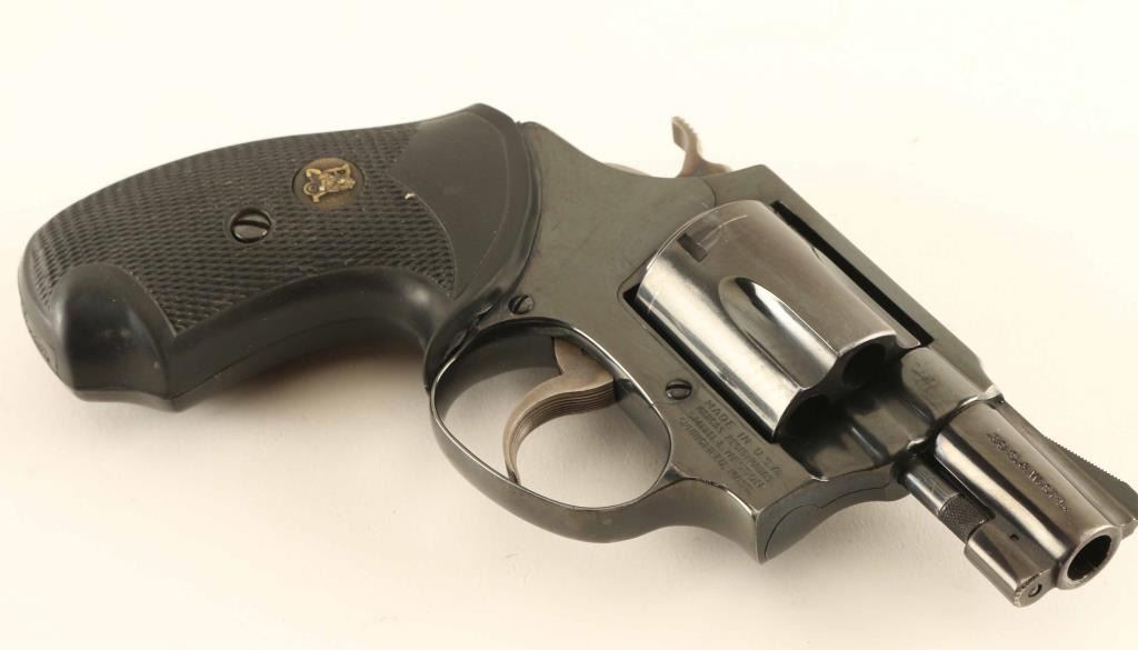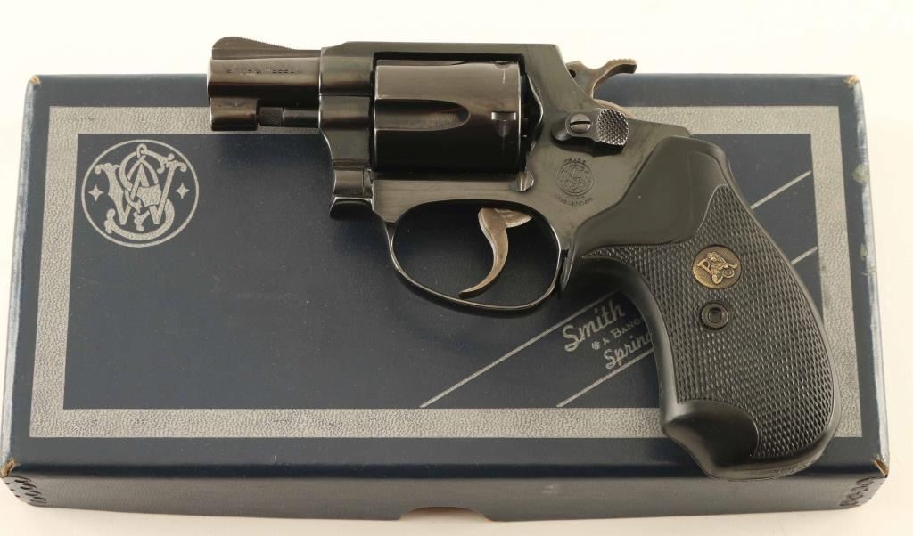 'The .38 Chief's Special' Small frame double action snub nose revolver chambered in 38 Special, manufactured circa 1982. Features a blued finish, 2" barrel with matted sighting rib, serrated ramp front sight, square notched rear sight, non-shrouded ejector rod, fluted five-shot cylinder, serrated .240" trigger, .240" service hammer with knurled spur, three screw round butt J frame and one-piece checkered black rubber Pachmayr Presentation grip. Includes a factory two-piece blue cardboard box with incorrect label. Revolver retains approximately 90% of it's original blued finish showing holster wear, a drag line on the cylinder and a few scattered handling marks. Action is strong with solid lock up, the bore is excellent and the rubber grip is fine. Condition is NRA Very Good with box. ***Modern Firearm***